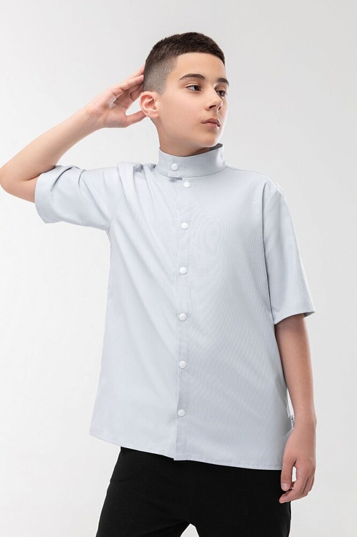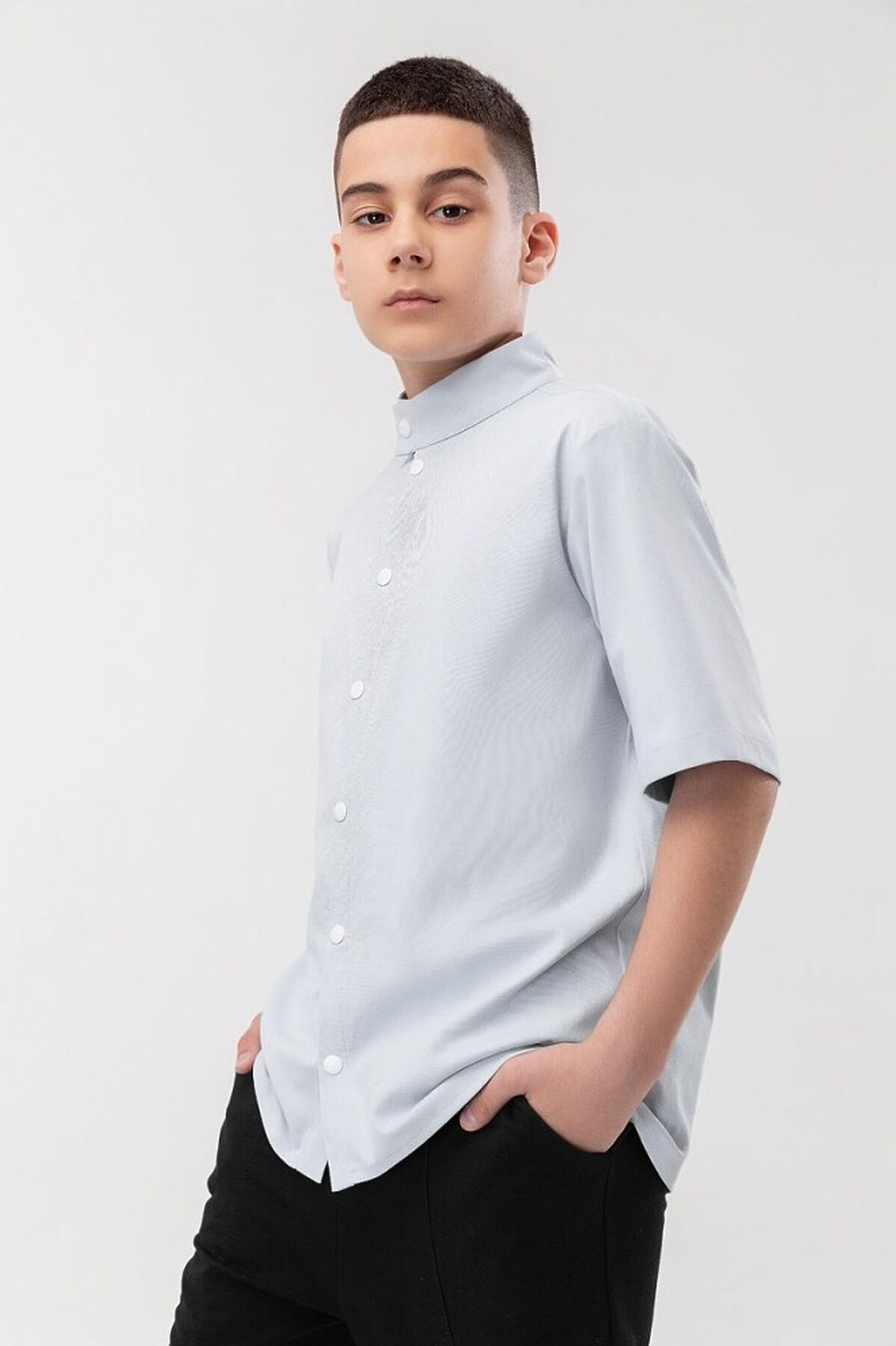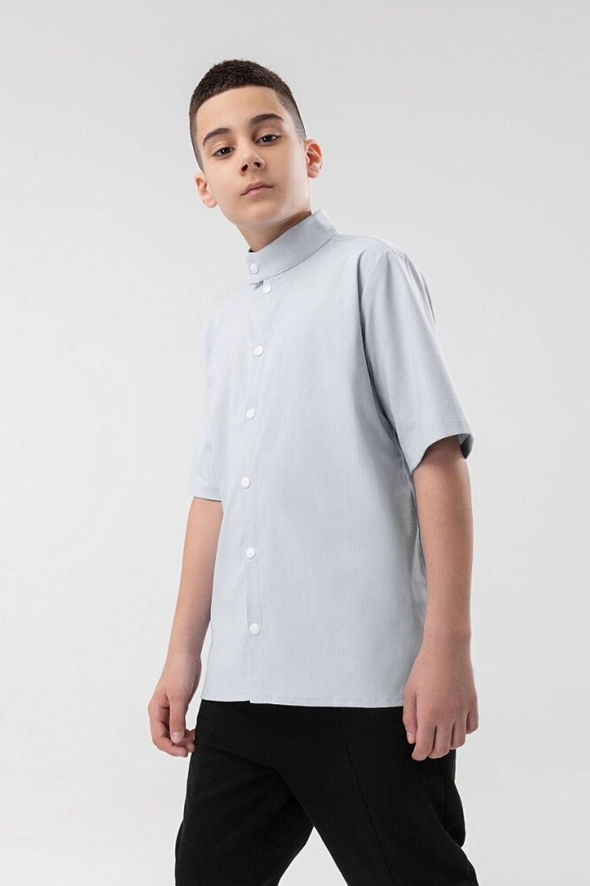 Рубашка для детей школьного возраста. Рубашка без подкладки, прямого силуэта, с центральной бортовой застёжкой на кнопки, с воротником-стойка, с втачным коротким рукавом. Низ изделия прямой.