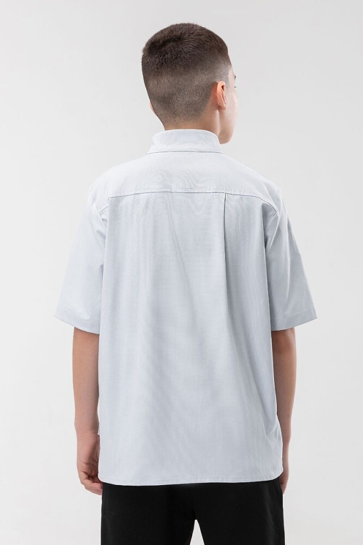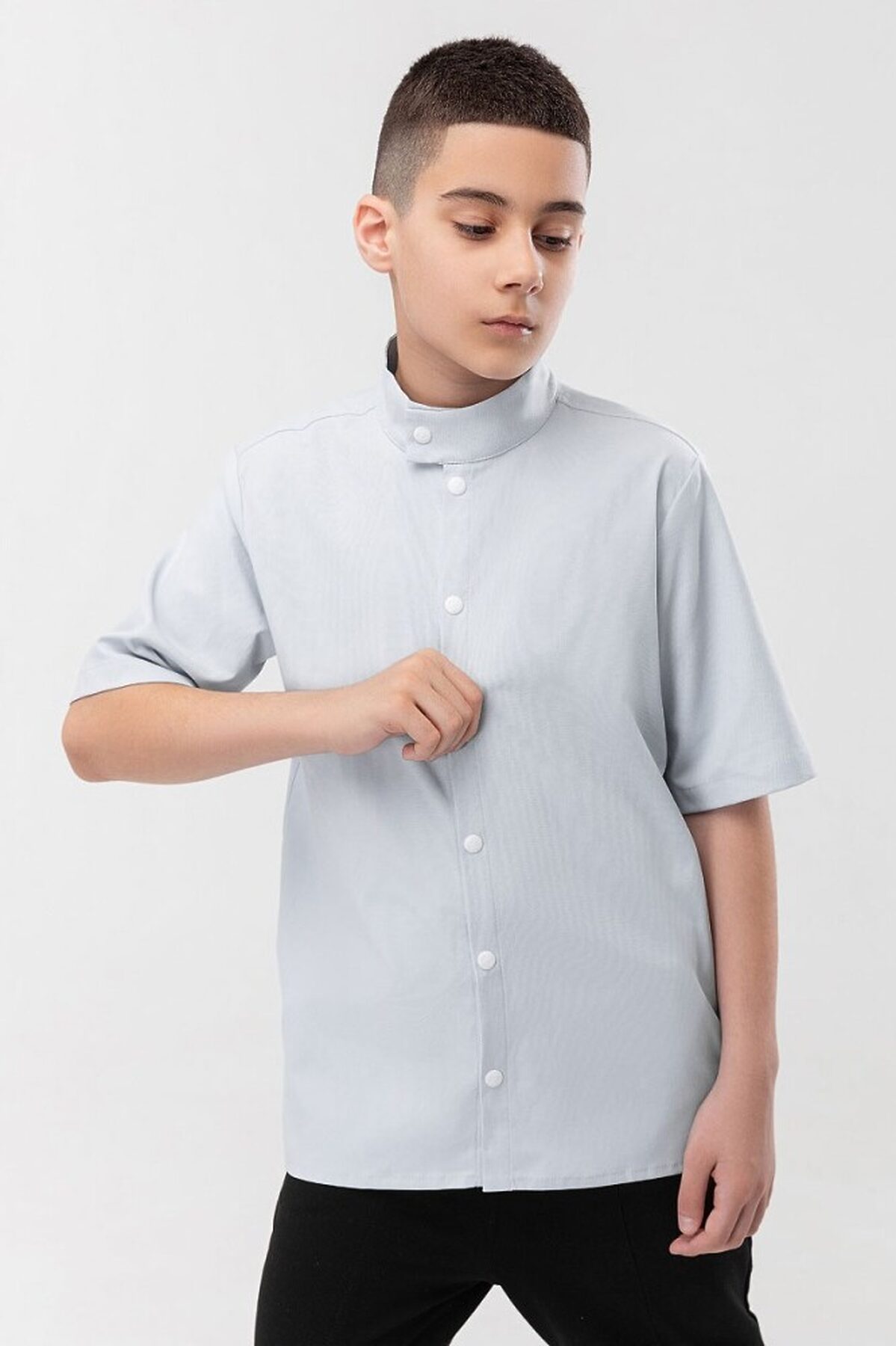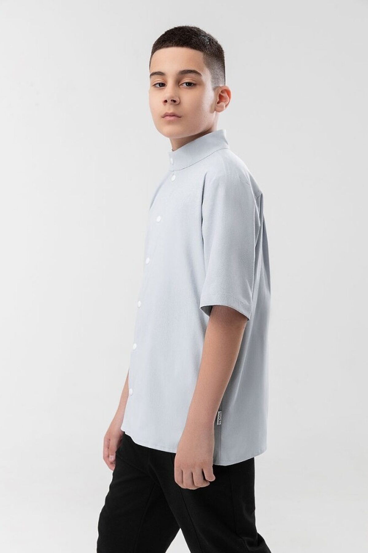 Рубашка для детей школьного возраста. Рубашка без подкладки, прямого силуэта, с центральной бортовой застёжкой на кнопки, с воротником-стойка, с втачным коротким рукавом. Низ изделия прямой.