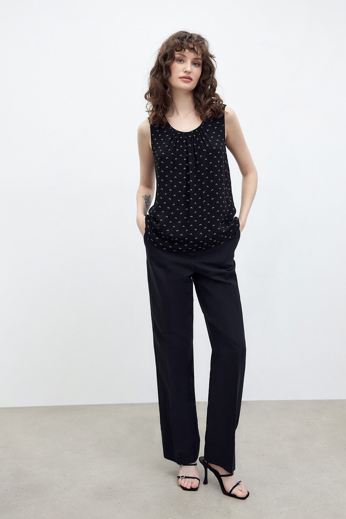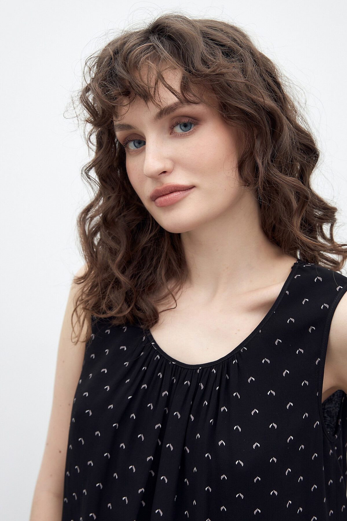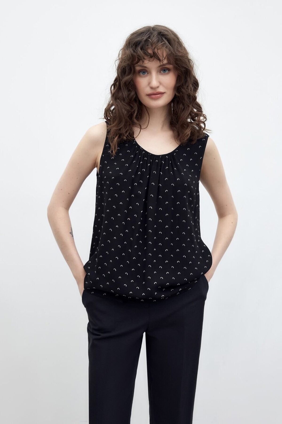 Прямая женственная блуза из натурального шифона с графичным принтом на вискозной подкладке. Без рукавов. По вырезу горловины расположены складки. Такая блуза станет хорошим первым слоем под жакет или кардиган.