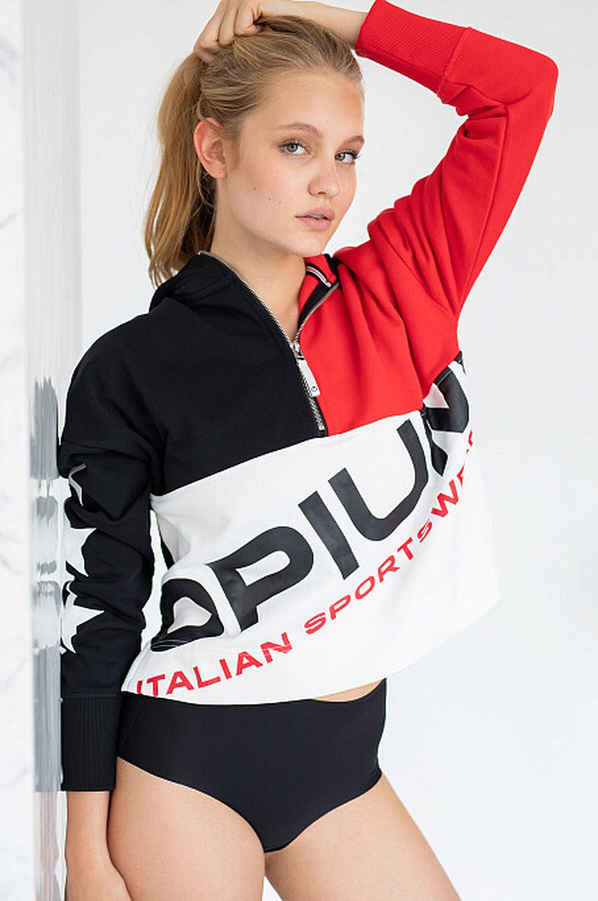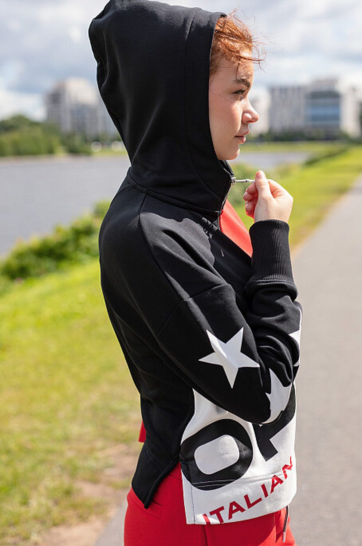 Оригинальная женская толстовка-худи из коллекции Opium Rest. Фирменное сочетание черного, белого и красного цветов. Мягкий 100% хлопок терри и расслабленный прямой силуэт толстовки располагают к отдыху и приятному времяпровождению, как к активному, так и к пассивному – кому что больше нравится. Приспущенная линия плеча, широкие манжеты на рукавах. В боковых швах – разрезы, обработанные специальной тесьмой. Функциональная металлическая молния спереди обеспечивает удобство надевания и украшает модель. Уютный двойной капюшон защитит от холода и ветра. Уникальный принт в виде логотипа бренда делает эту толстовку неповторимой. Рекомендуем завершить образ брючками P-97 из этой же коллекции.
