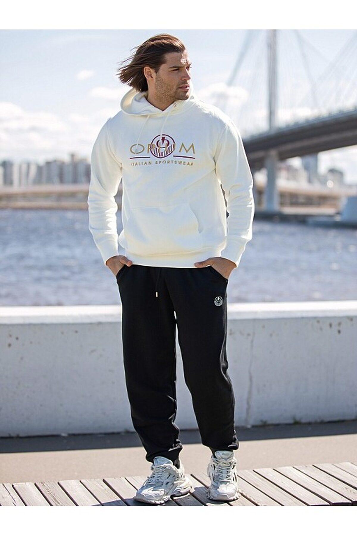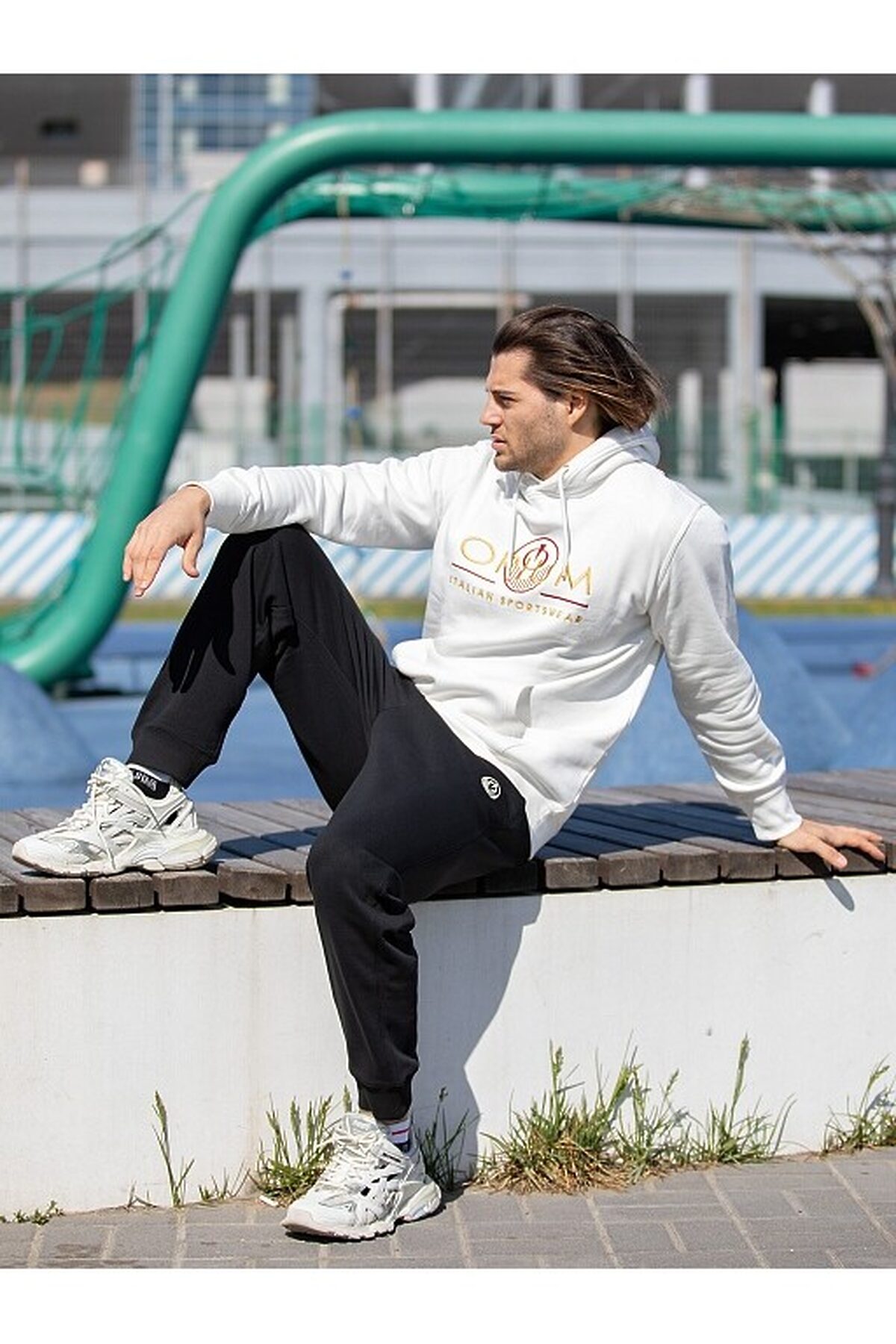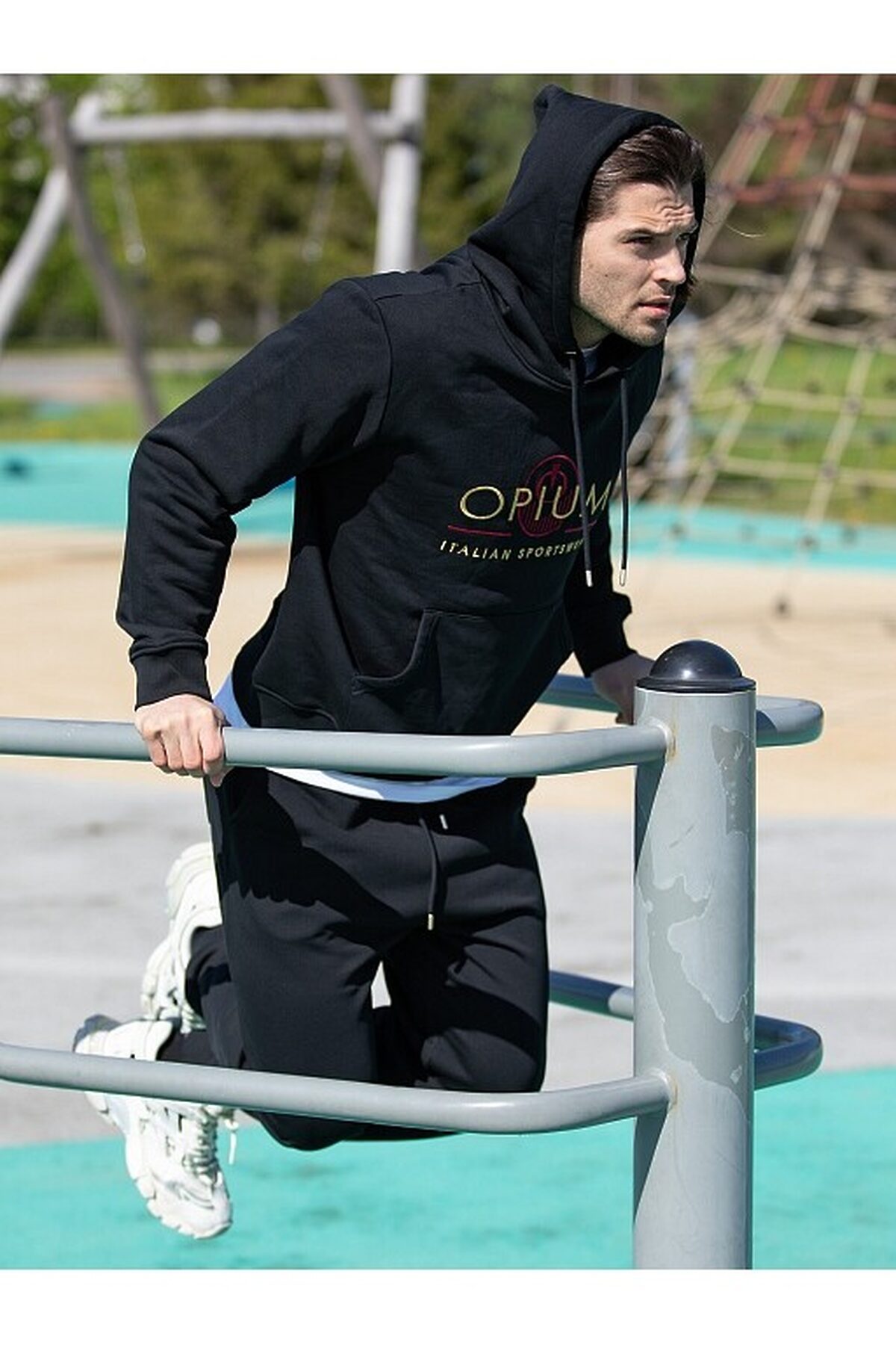 Мужские спортивные брюки джоггеры из коллекции Opium Rest. Выполнены из 100% хлопкового полотна терри. Штанины на манжетах из резинки в мелкий рубчик. Из такой же ткани пояс с кулиской. Брендированные металлические люверсы указывают на оригинальность модели. Шнур в кулиске оформлен эглетами с логотипом бренда. Спереди вышивка эмблемы диаметром 3,5 см. По бокам – удобные карманы. Это идеальная модель для спорта и отдыха.