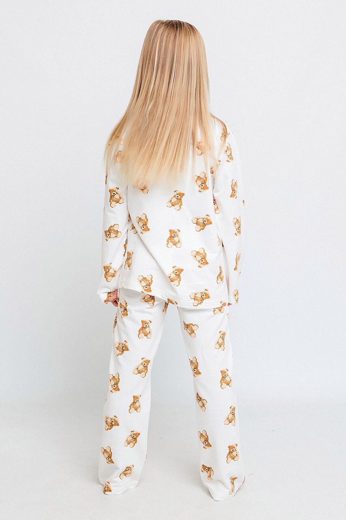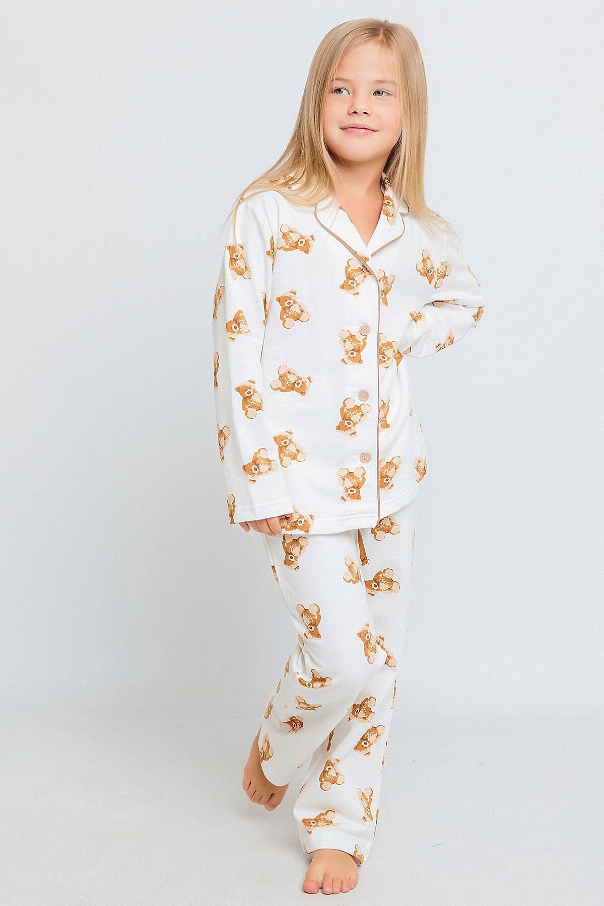 Пижама для девочки трикотажная из футера: футболка с длинным рукавом и брюки. Детская пижама сшита из 100% натурального гипоаллергенного хлопка. Подойдет для сна дома и в детском саду, а также можно носить как домашний костюм. Белая расцветка и принт в виде мишек. Футболка на пуговицах и с отложным воротничком. Брюки на резинке и с завязками.