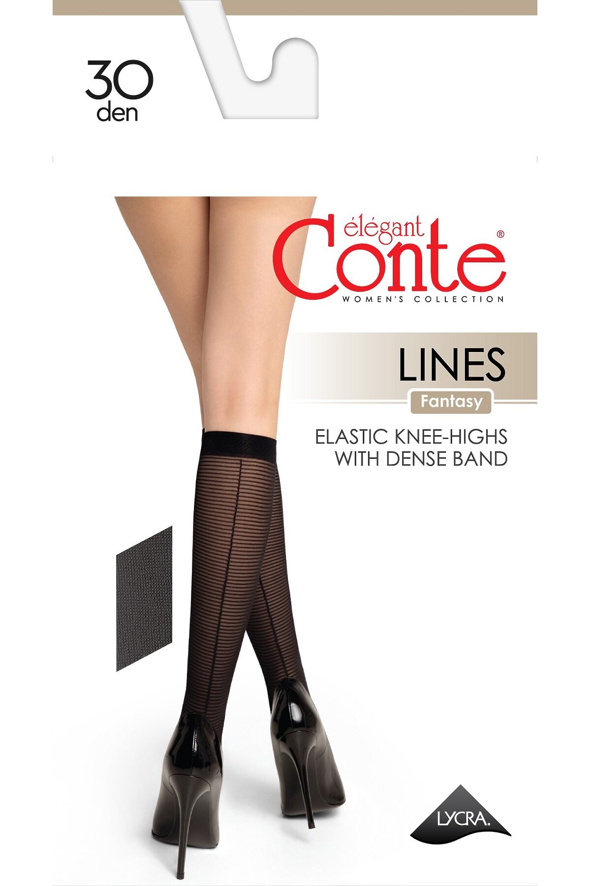 Тонкие фантазийные женские гольфы 30 ден c рисунком «горизонтальные полоски с имитацией шва», без пятки, с эластичным бортом.