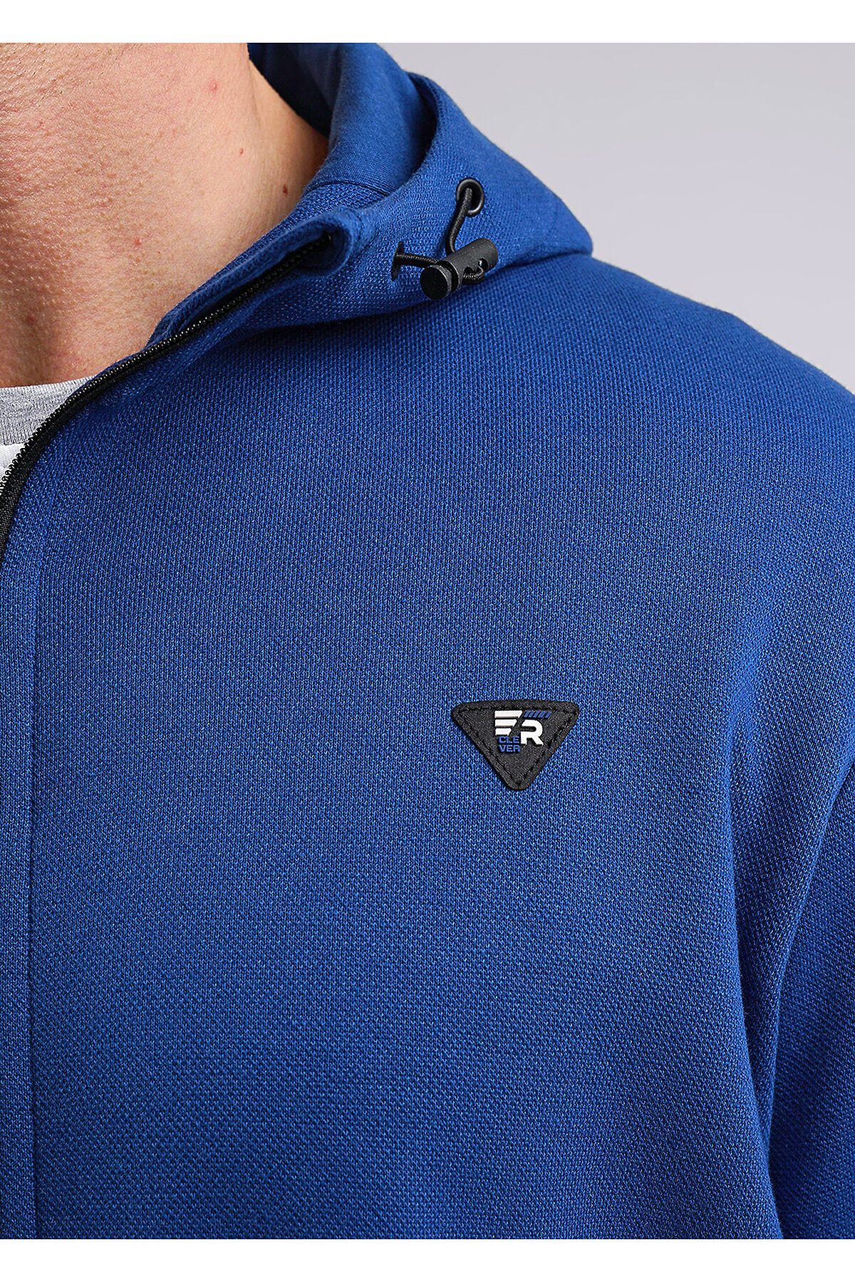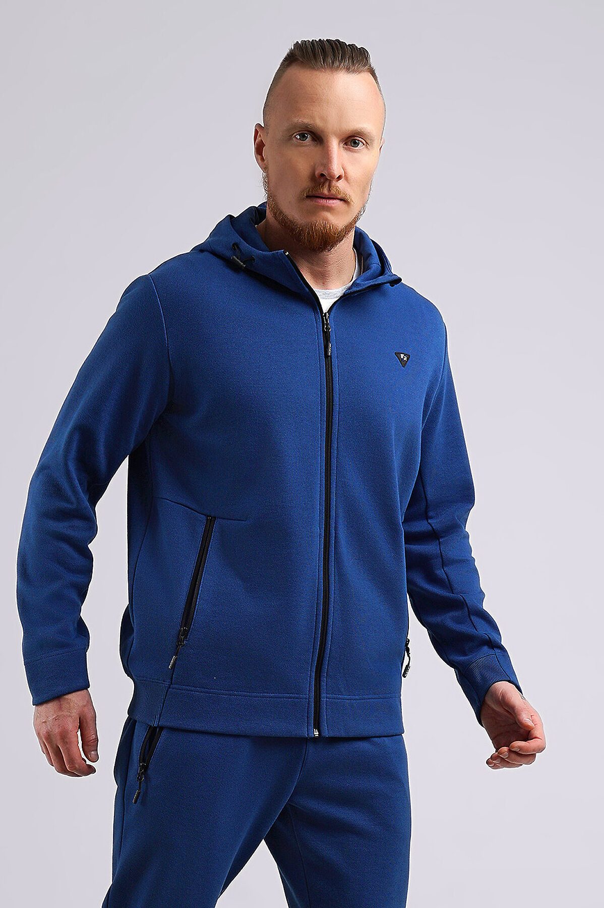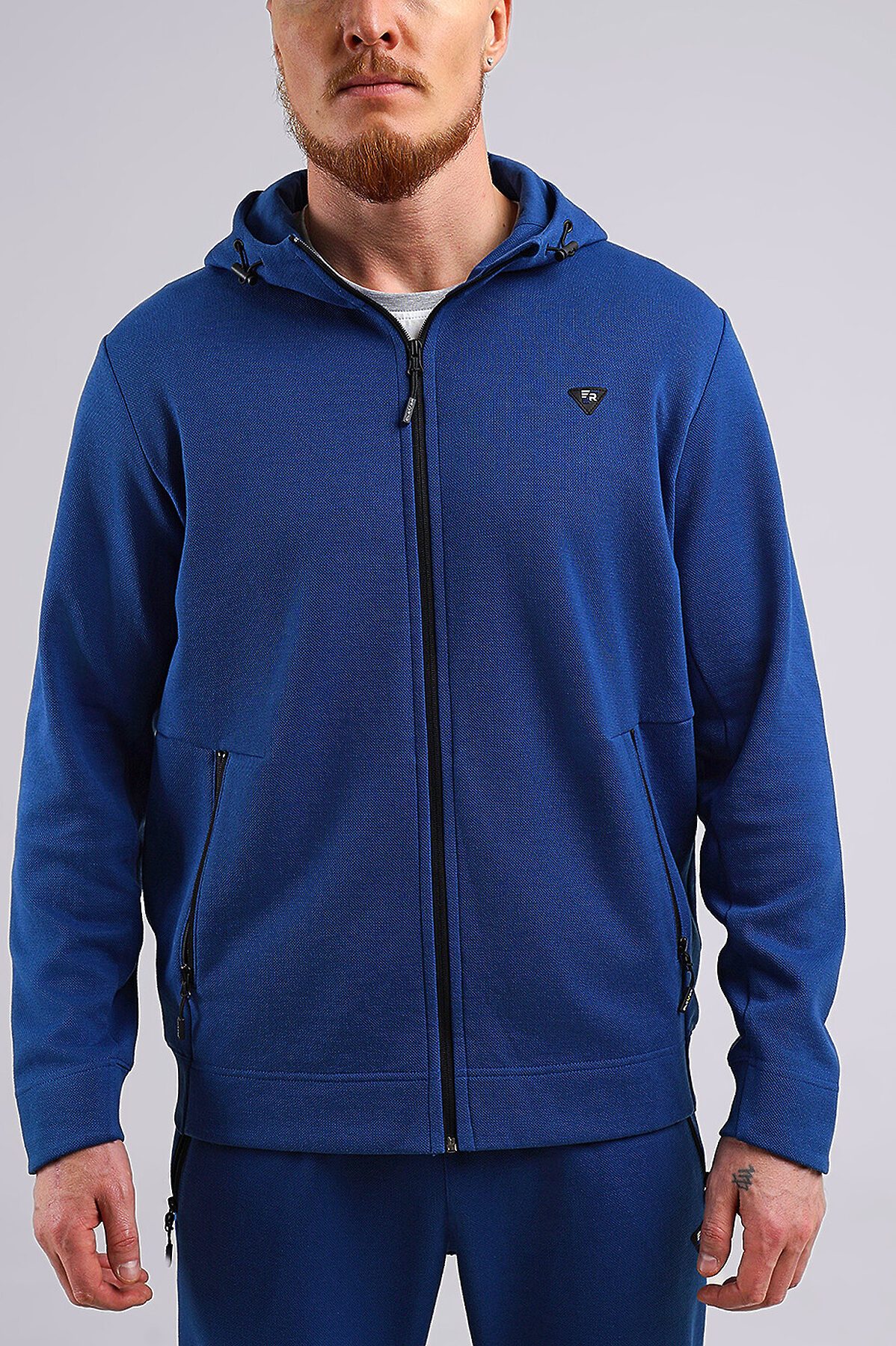 Мужская куртка на молнии из трикотажного полотна с капюшоном на подкладе. По капюшону резинка со стопором, спереди удобные наклонные карманы. Куртка на поясе и с манжетами. Дополнена фирменной фурнирурой.