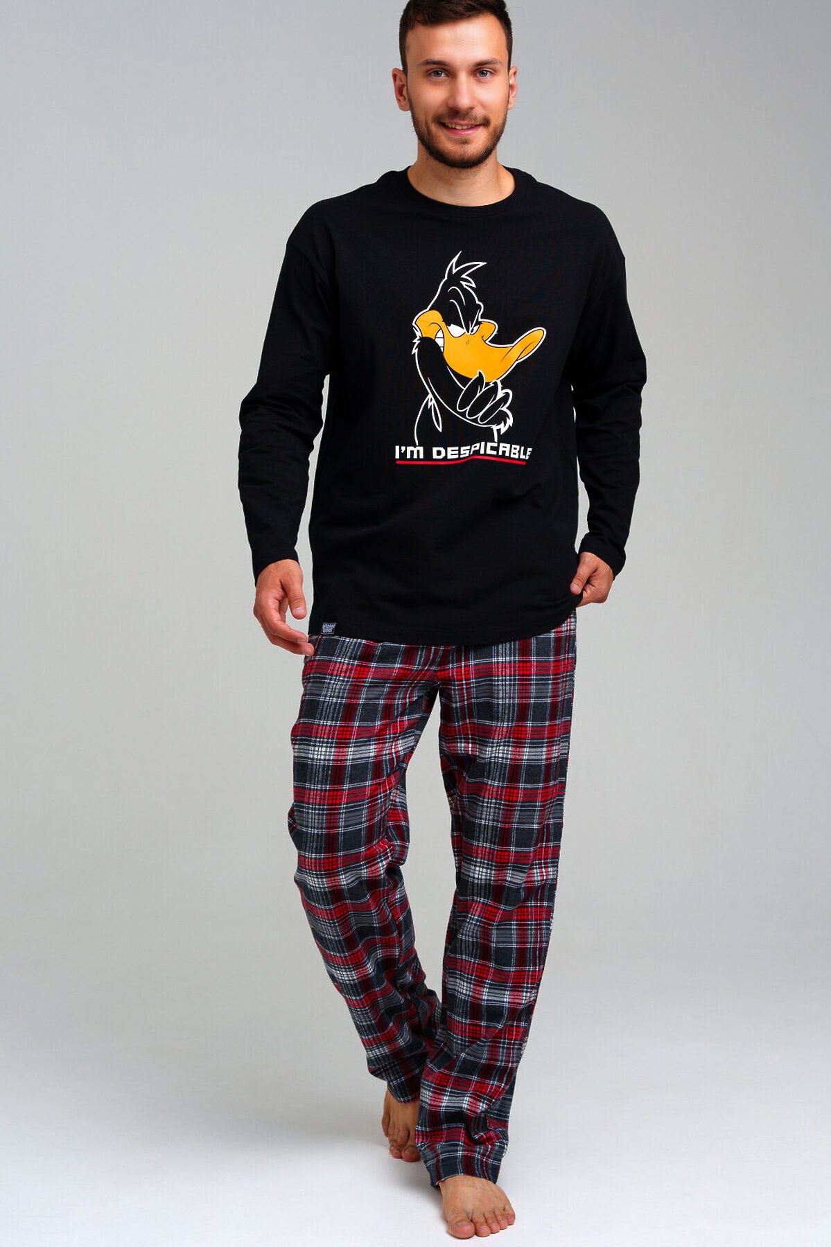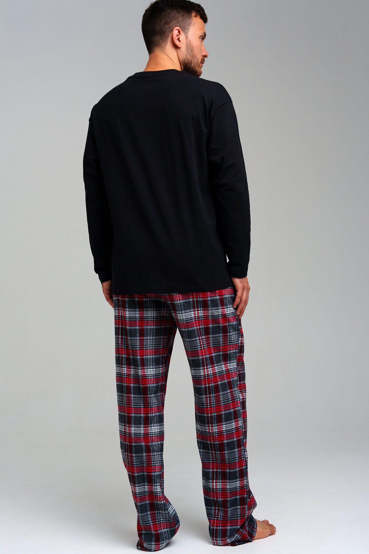Мужская пижама. Лонгслив из качественного и приятного на ощупь трикотажа джерси с высоким содержанием хлопка 95%. Благодаря наличию эластана в составе ткани изделие проще в уходе и держит форму. Брюки - 100% хлопок. Фланель - мягкая, приятная к телу ткань с небольшим начесом. Эластичный пояс с тесьмой позволяет легко надевать брюки и утягивать до комфортной посадки.