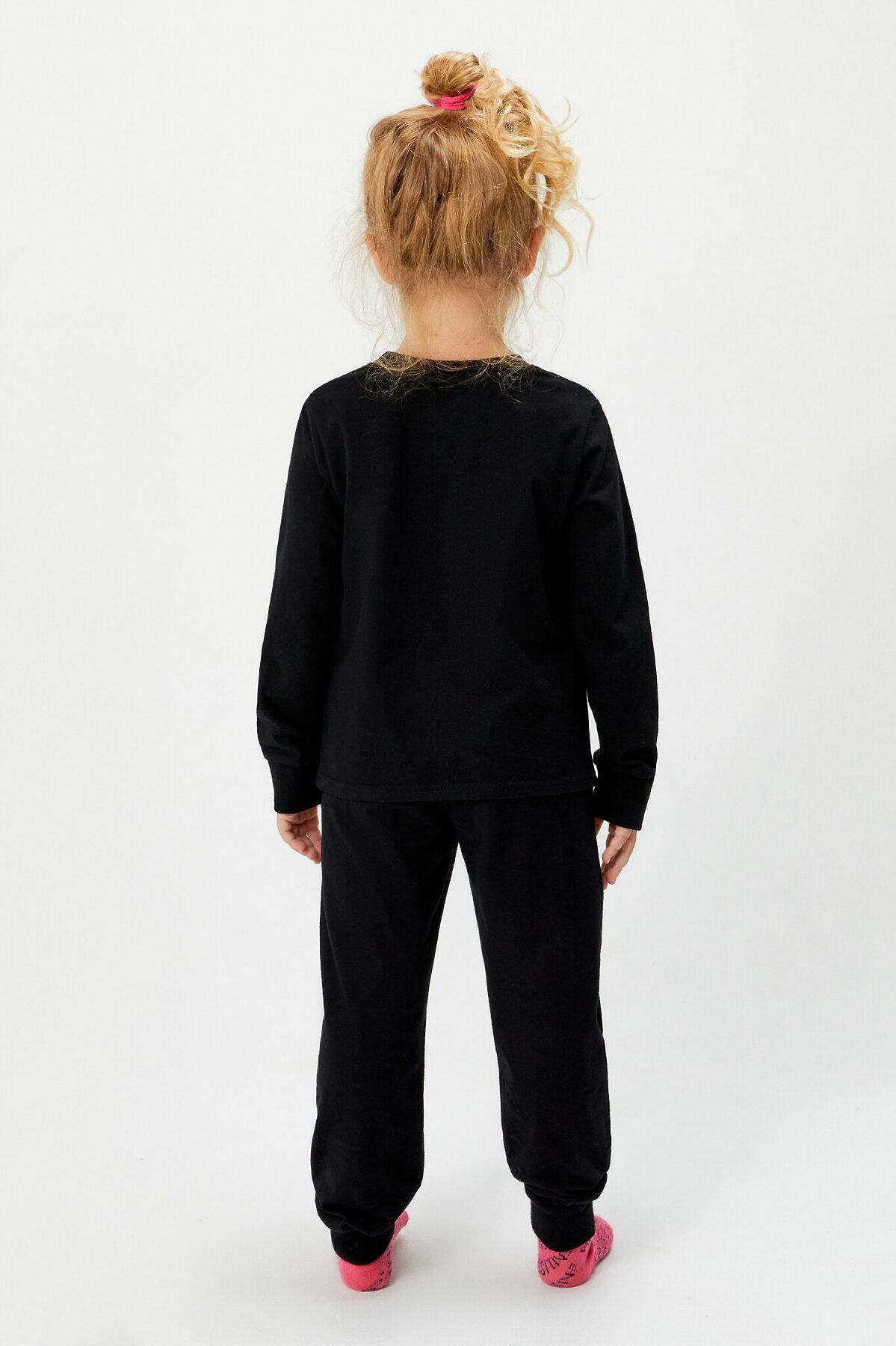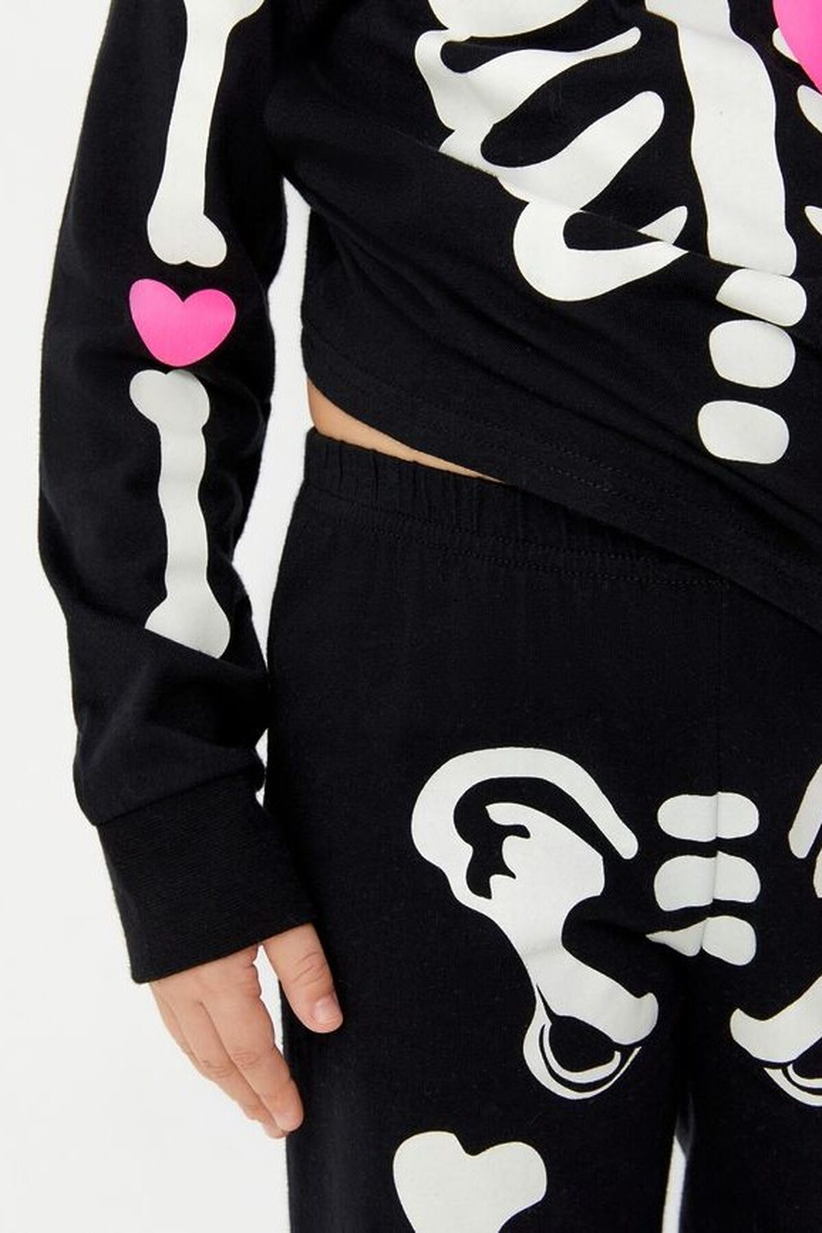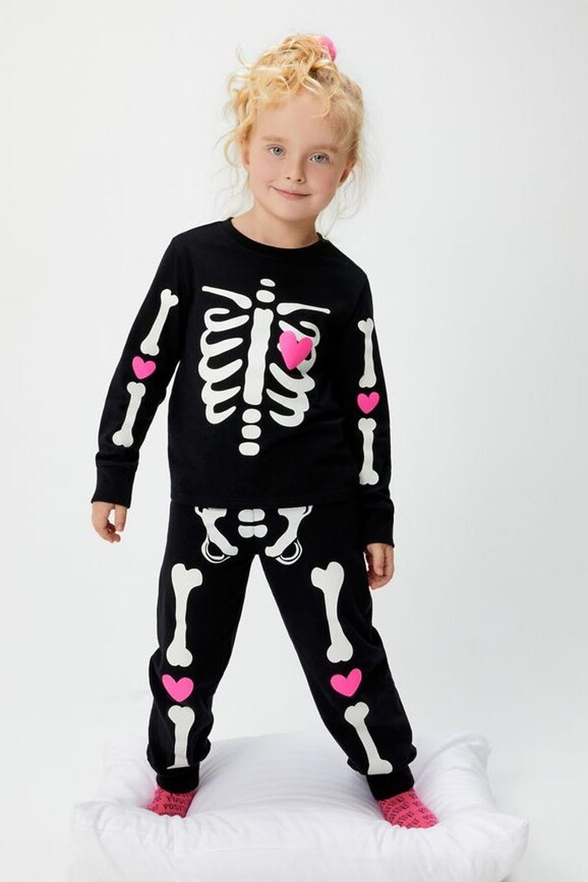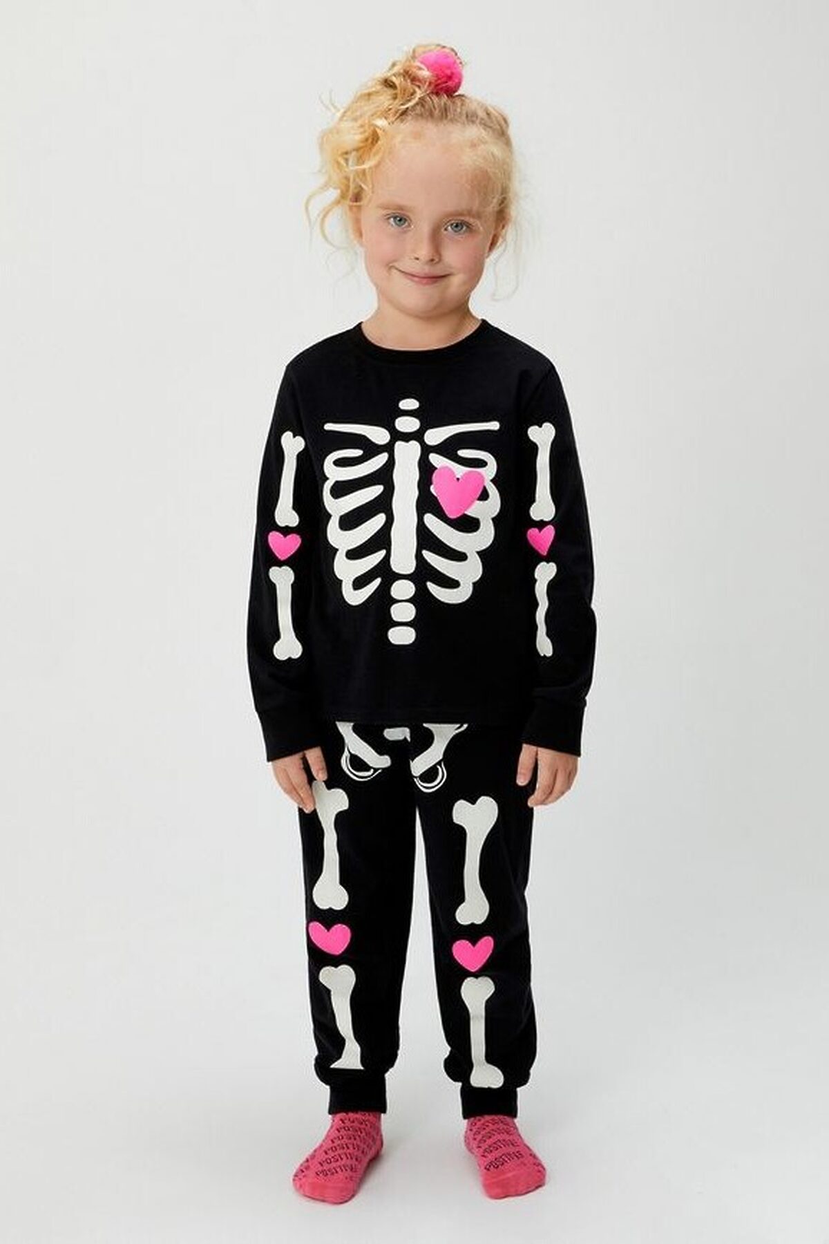 Пижама для девочки состоит из лонгслива и брюк с манжетами по линии низа. Изделие из мягкого эластичного хлопка приятно на ощупь; оно не стесняет движений и не требует сложного ухода. На передней части пижамы расположен светящийся в темноте принт в виде скелета.