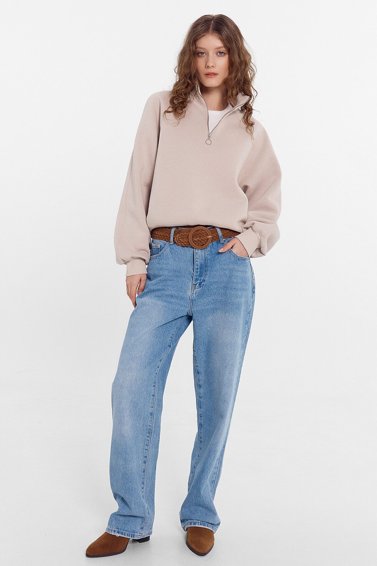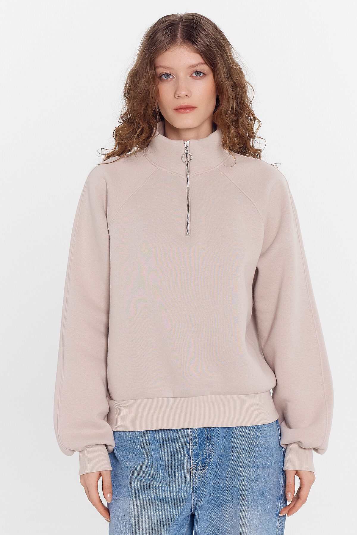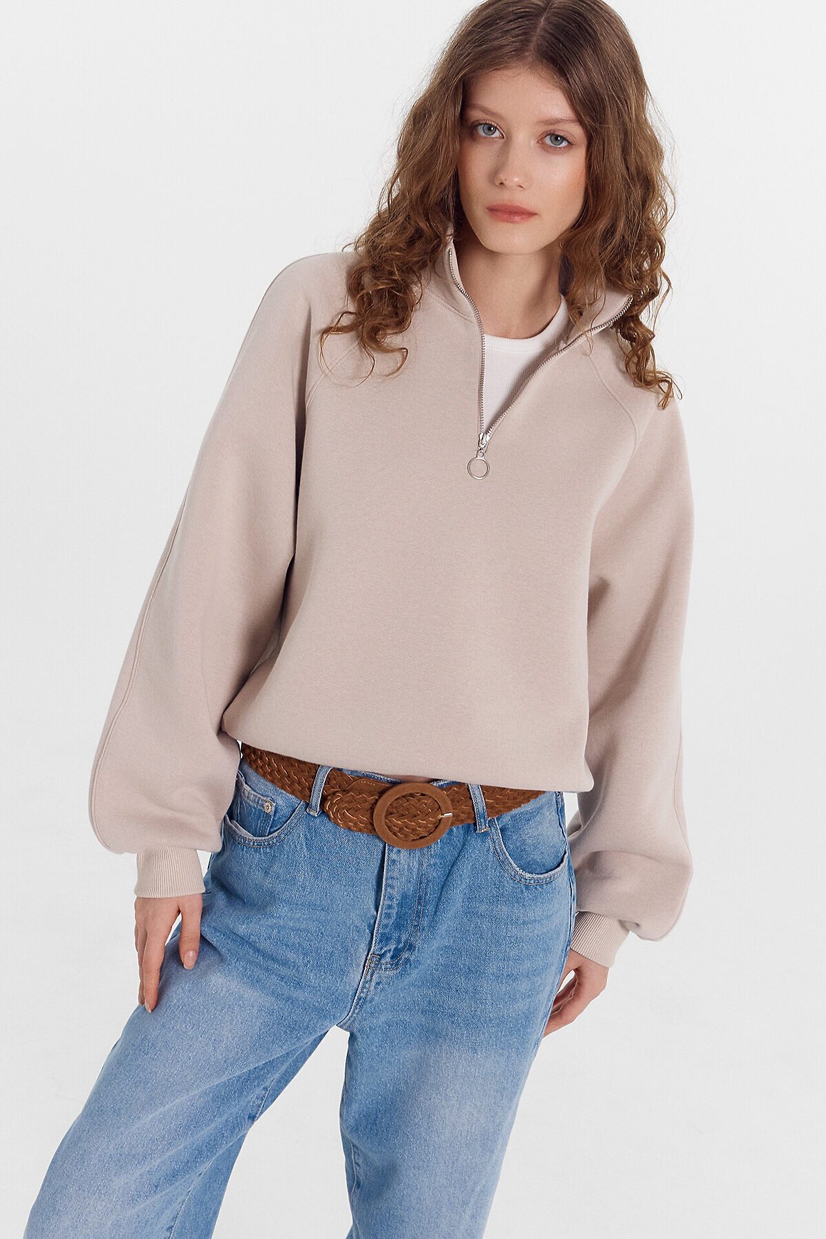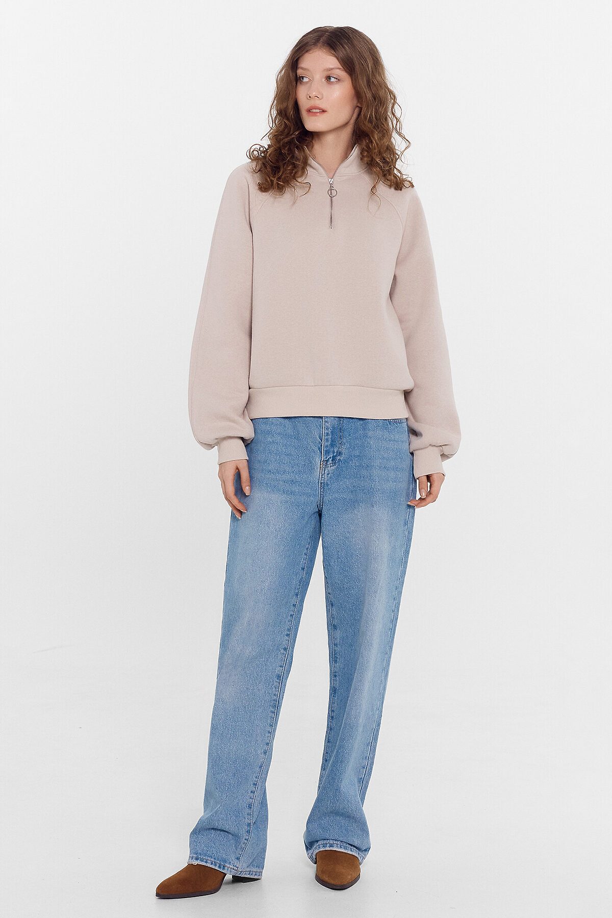 Укороченный женский джемпер из трикотажного футера с теплым подчесом. Силуэт свободный. Горловина круглой формы, с воротником-стойкой и молнией. Рукава объемные, длинные, на манжетах. Рекомендуем!