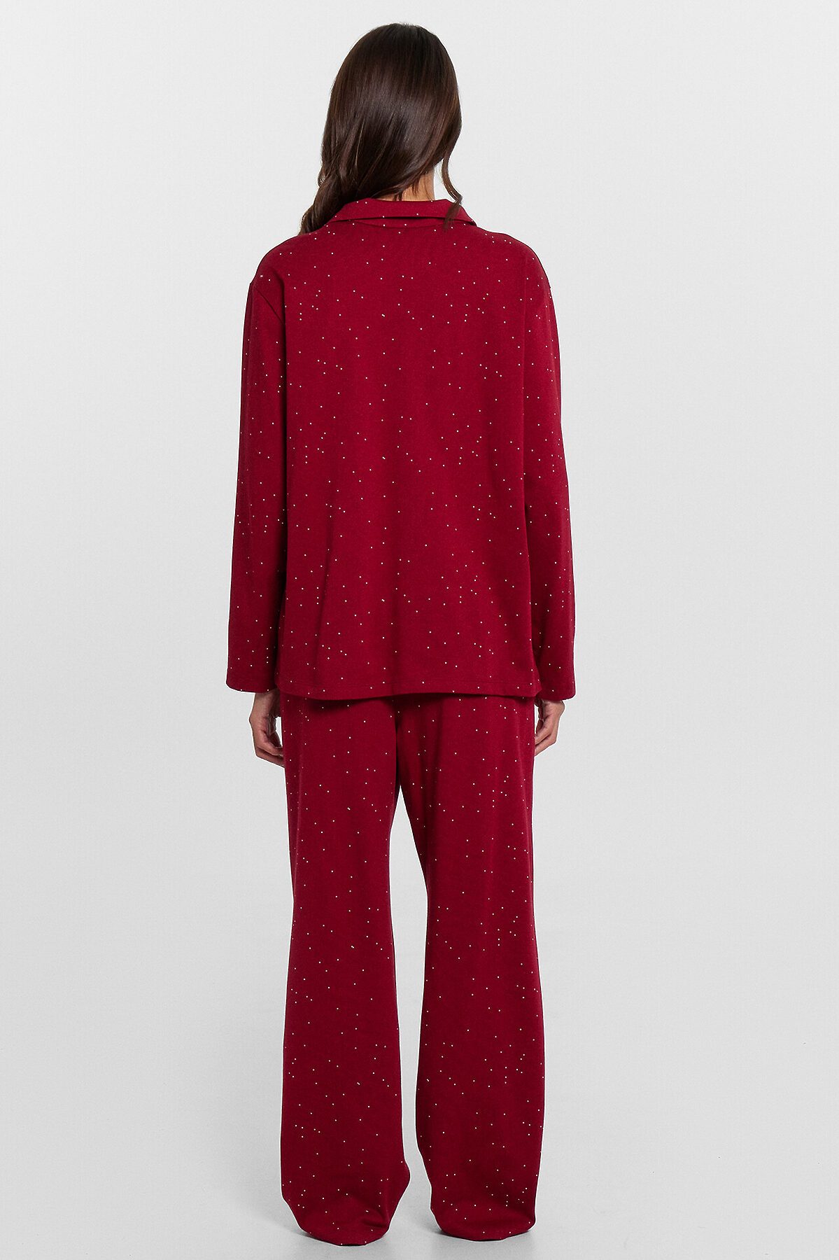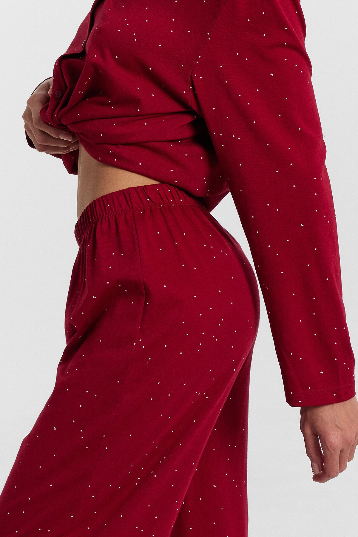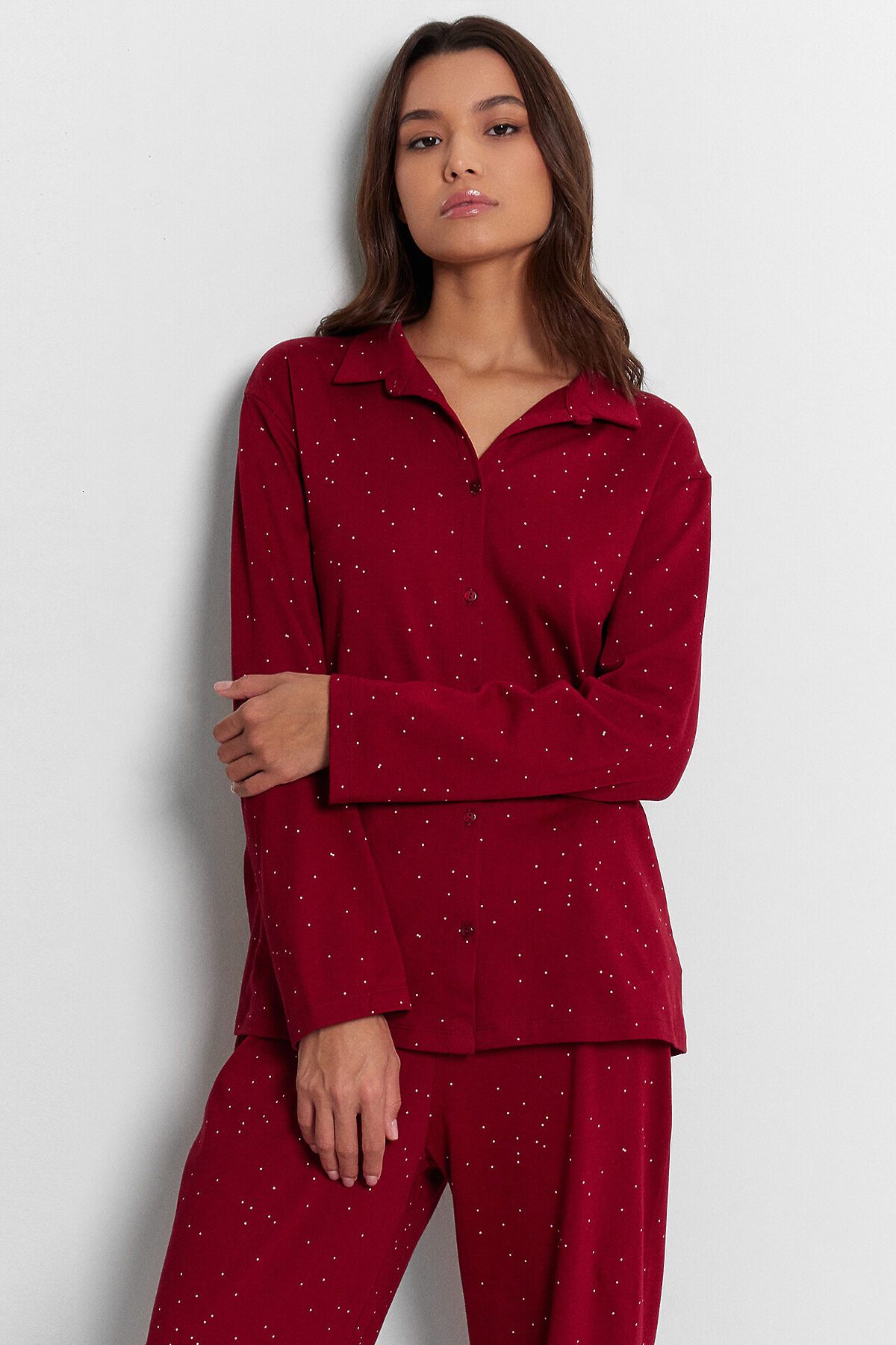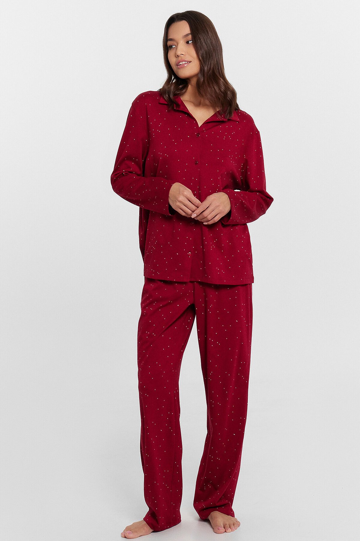 Позвольте себе наслаждаться уютом и комфортом с женской пижамой Mark Formelle. Рубашка прямого и свободного силуэта с центральной застежкой на пуговицы придает образу изысканность и непринужденность. А длинные рукава со спущенной линией плеча создают расслабленный и стильный вид. Брюки свободного кроя с эластичным поясом идеально садятся по фигуре, не стесняя движений. Этот пижамный комплект выполнен из хлопковой кулирки, которая известна своей мягкостью и воздухопроницаемостью. Это натуральный материал, который прекрасно пропускает воздух и позволяет коже дышать, обеспечивая максимальный комфорт на протяжении всей ночи. Эта стильная пижама станет вашим любимым выбором для ночного отдыха и комфортного сна, даря вам ощущение уюта и гармонии каждый день.