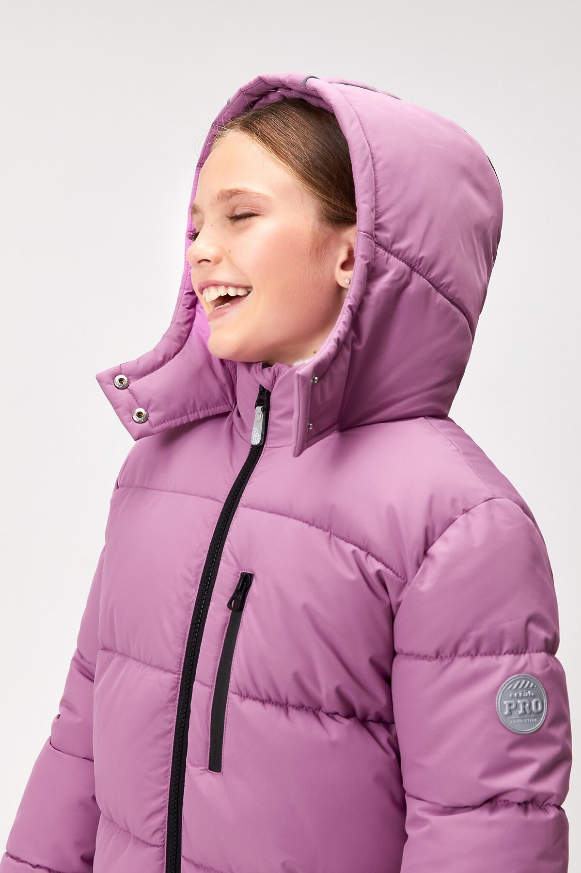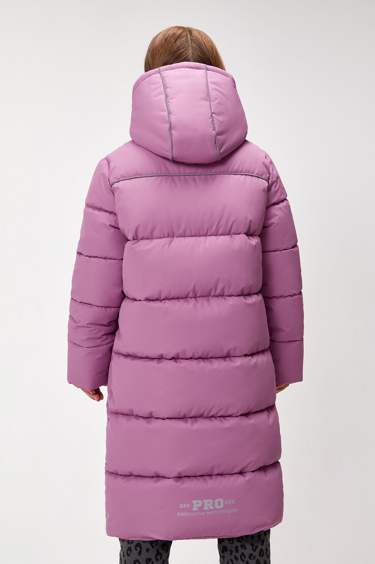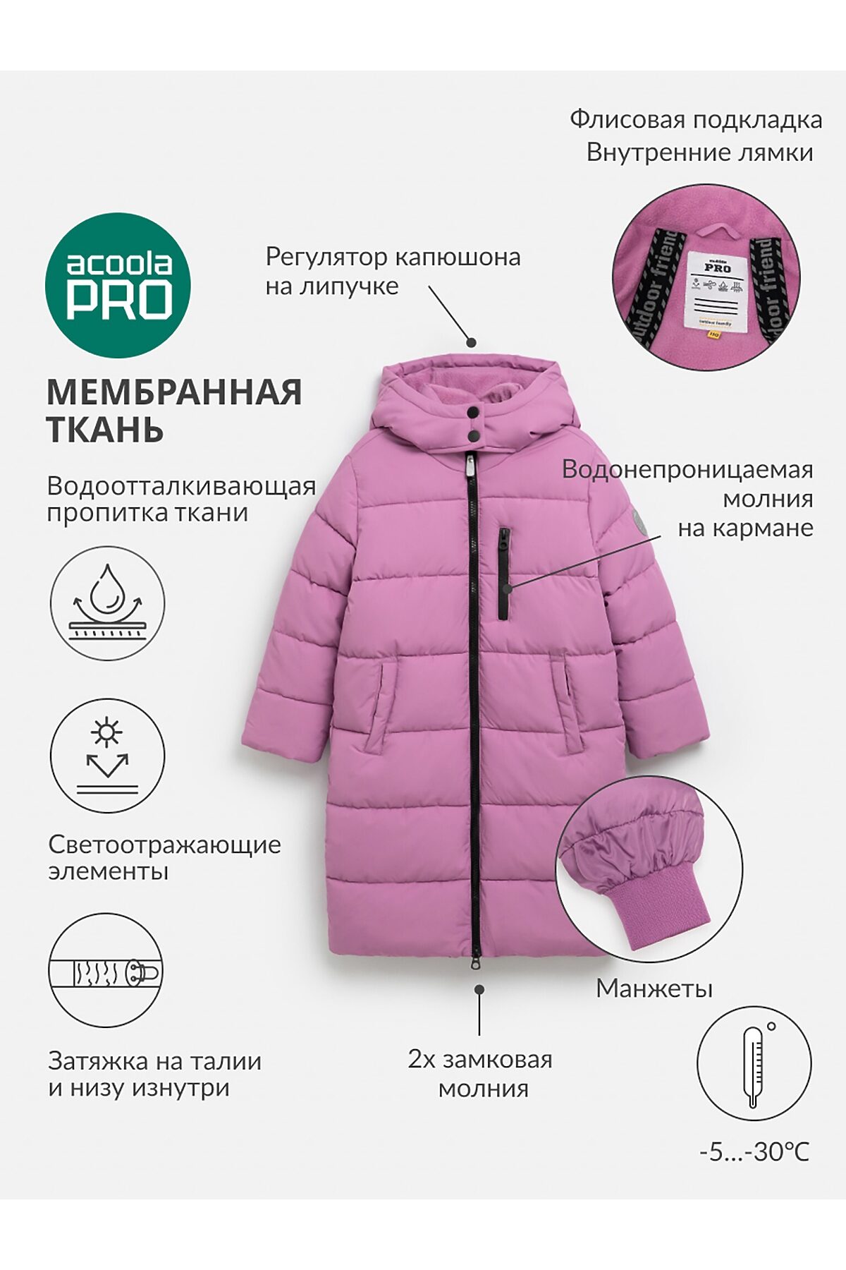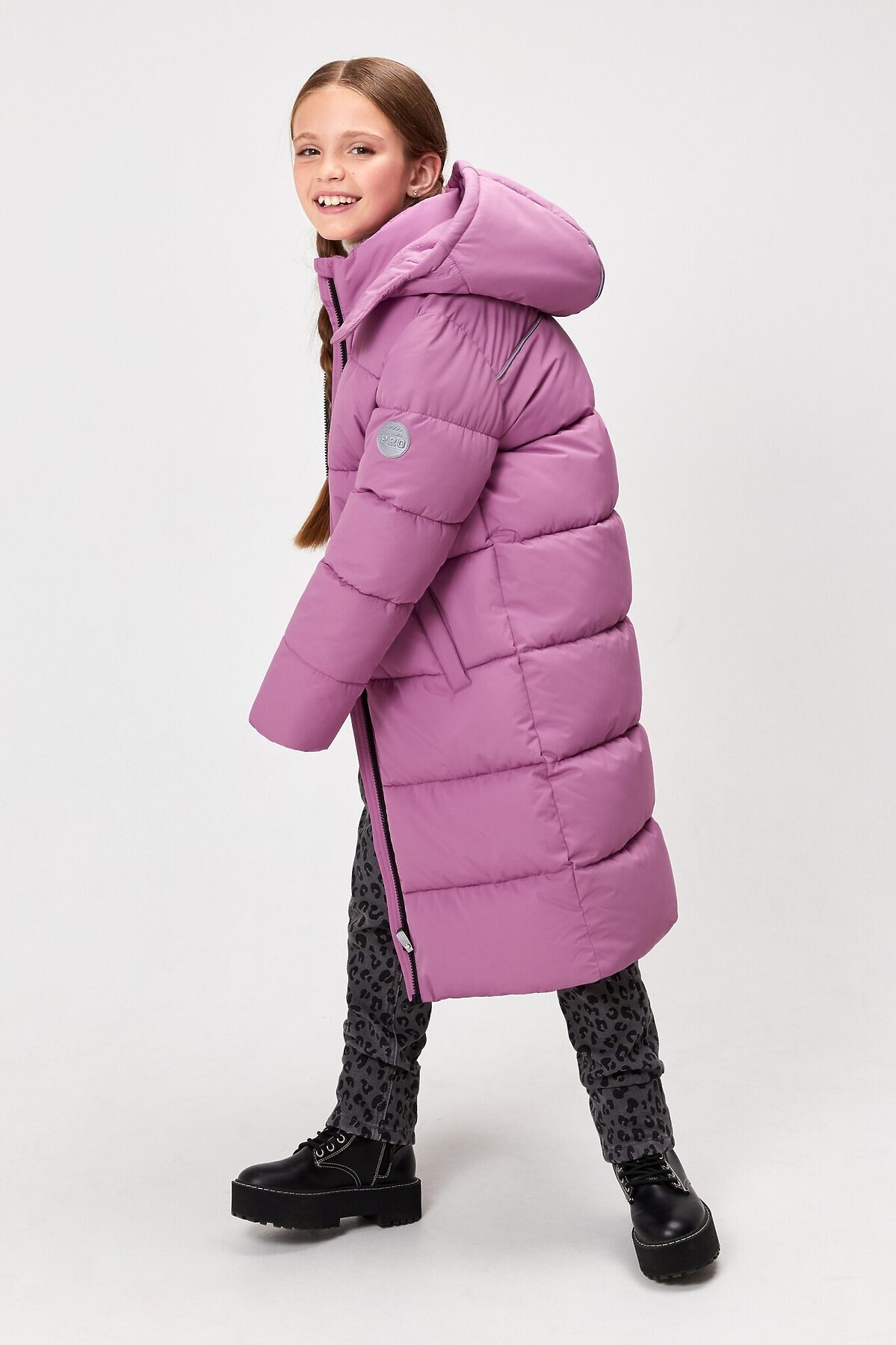 Утеплённое стеганое пальто с капюшоном для девочки. Ткань с мембраной защищает не только от дождя и ветра снаружи, но и не покрывается влагой от испарений тела изнутри. Это делает ткань не только гидрофобной, но и дышащей. Водонепроницаемость 5000 защитит и от моросящего дождя, и даже от кратковременного ливня. Утеплитель - синтепух (вес 400гр/м2). Рекомендованный температурный режим от -5 до -30 градусов. Подкладка для верхней части тела и капюшона выполнена из флиса, подкладка для нижней части тела, рукавов и карманов выполнена из стандартной подкладочной ткани. Застёжка на двухстороннюю молнию с внутренней ветрозащитной планкой. Спереди два кармана в листочку и один карман на молнии. Изнутри регулируемая утяжка по талии и низу. Трикотажные манжеты. Регулируемый капюшон на липучке. Светоотражающий кант на спинке и капюшоне, а также светоотражающие принты и нашивки обезопасят ребёнка от машин в темное время суток. Изделие с внутренними лямками. Пальто представлено в двух цветах: голубом и лавандовом. Рост модели на фото: 140