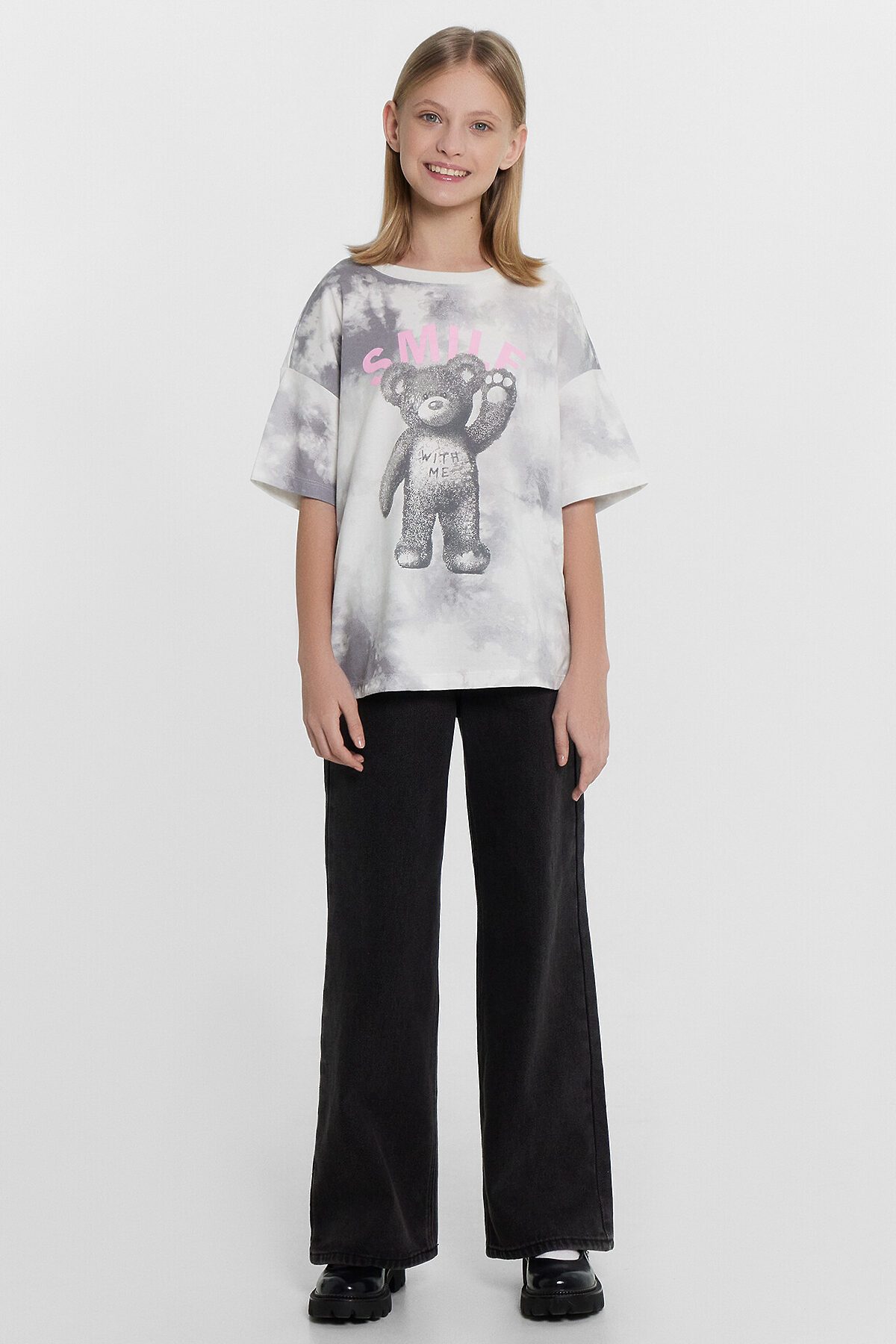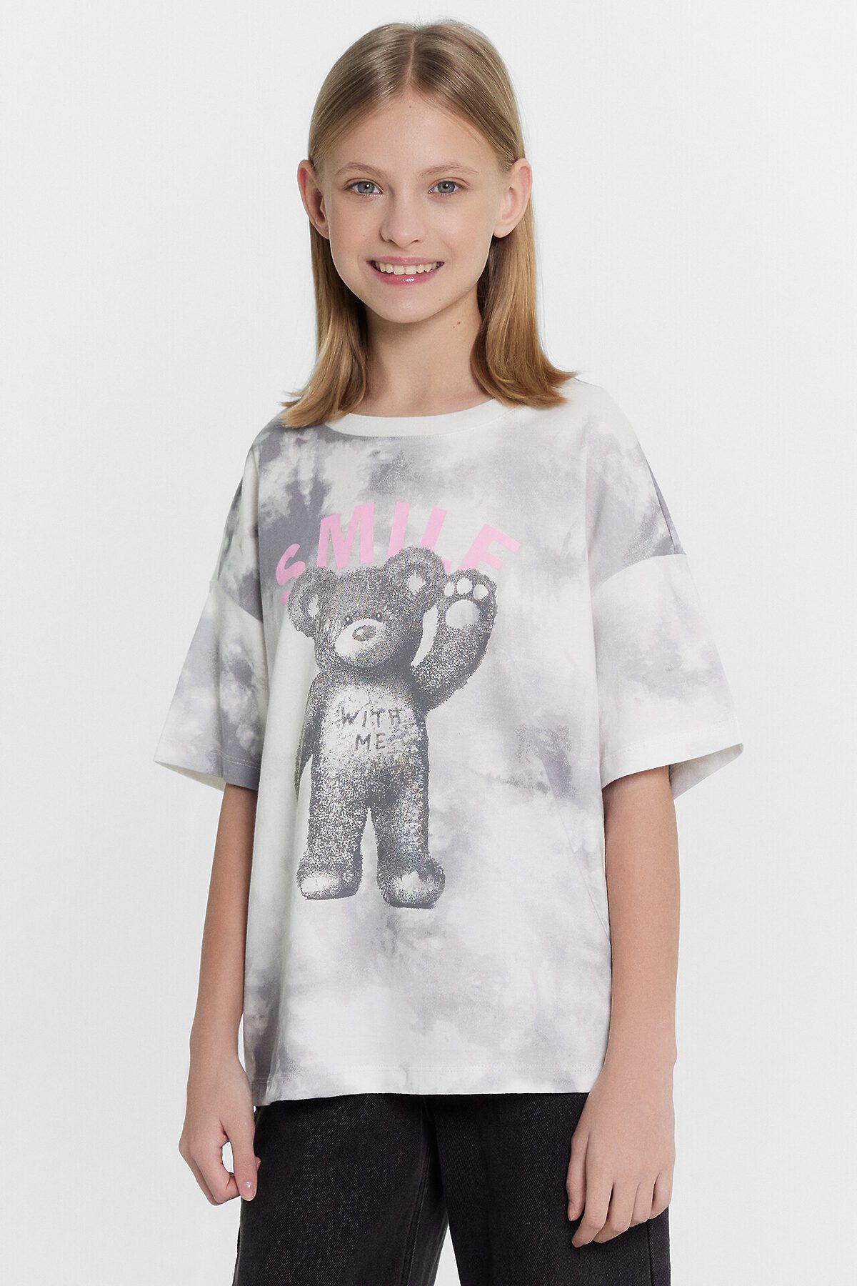 Футболка из трикотажного полотна кулирного переплетения. Силуэт свободный, длина до середины бедра. Рукава короткие, горловина круглая. Дизайн футболки наверняка понравится вашей моднице!