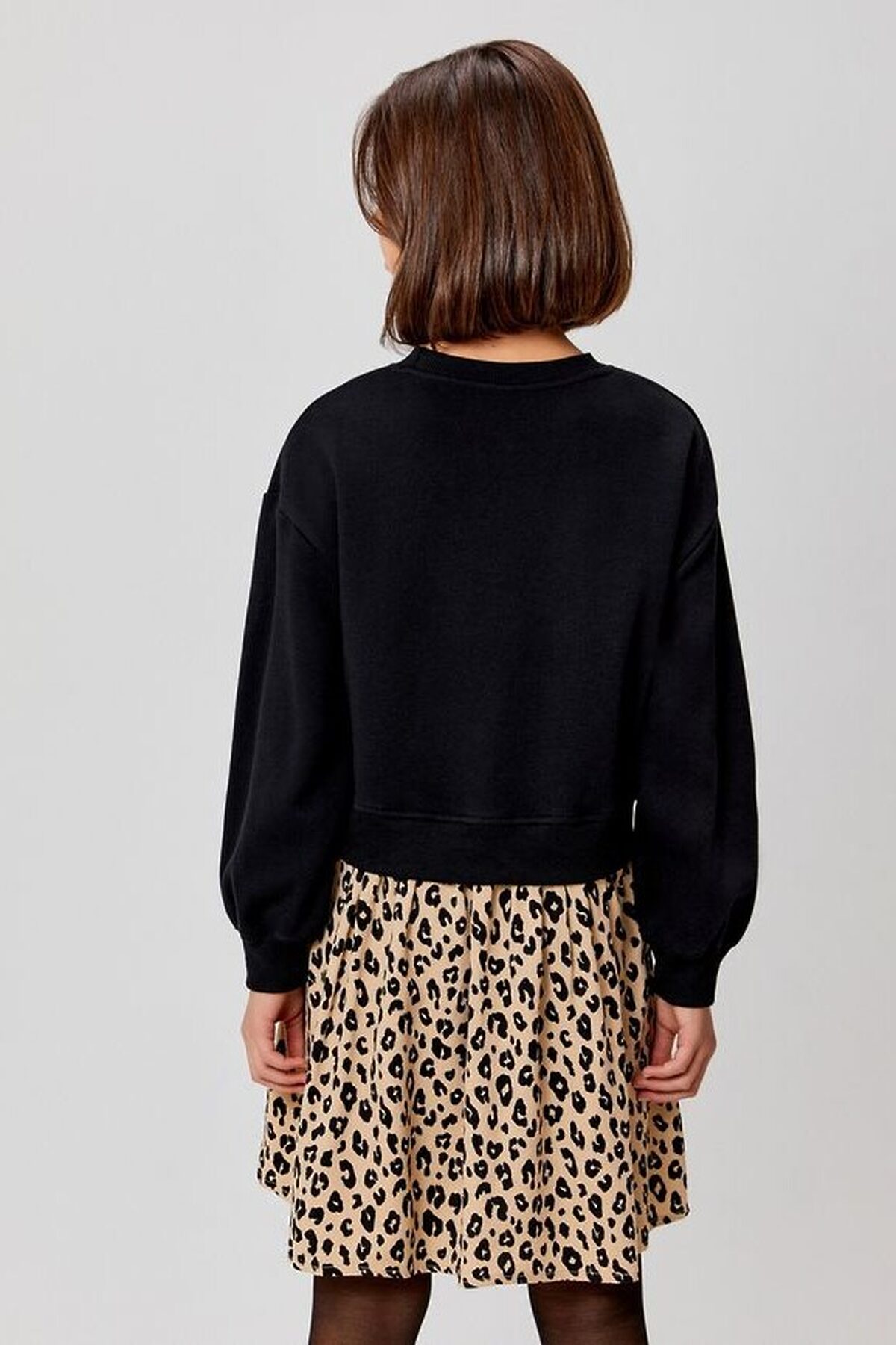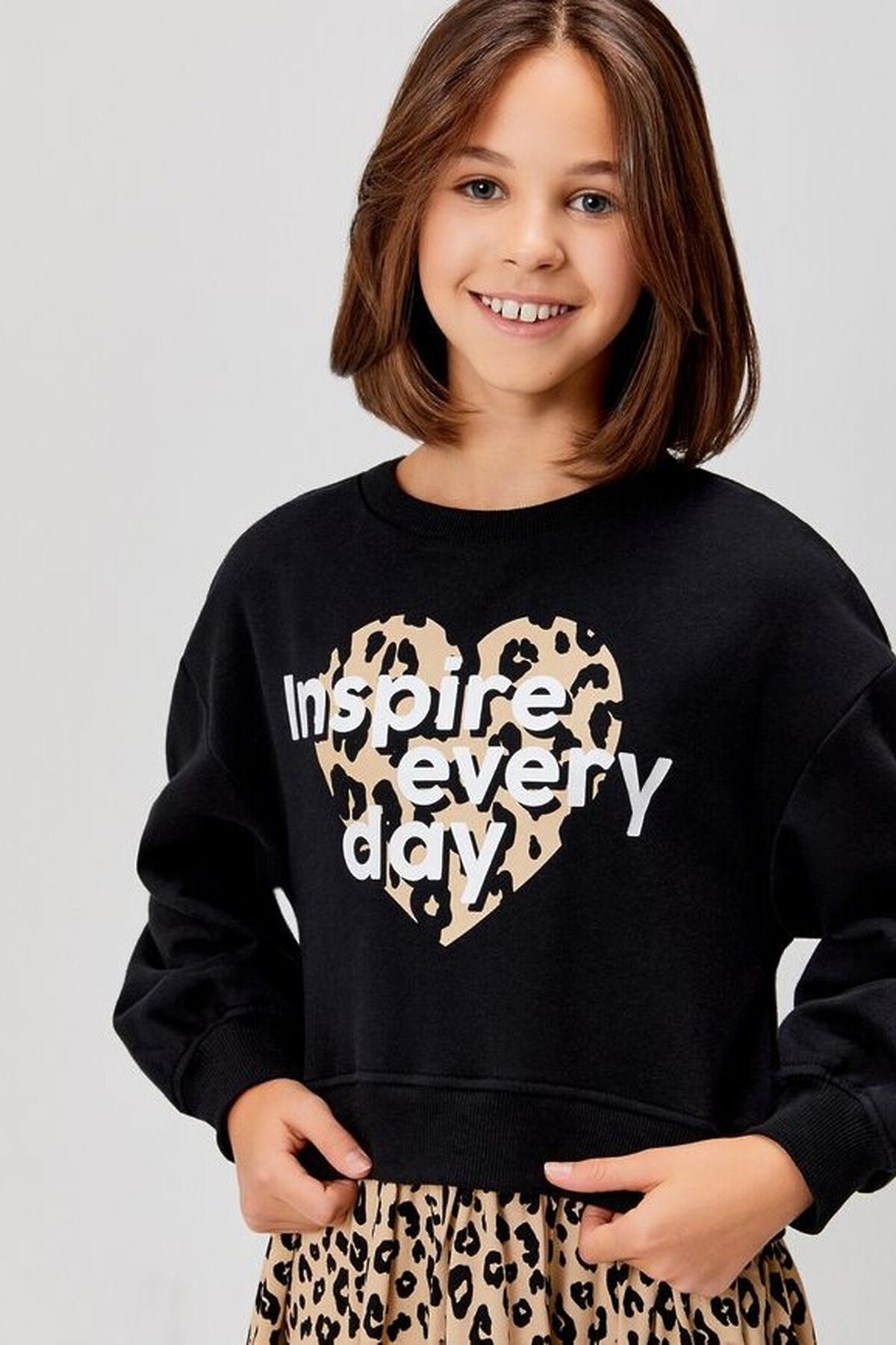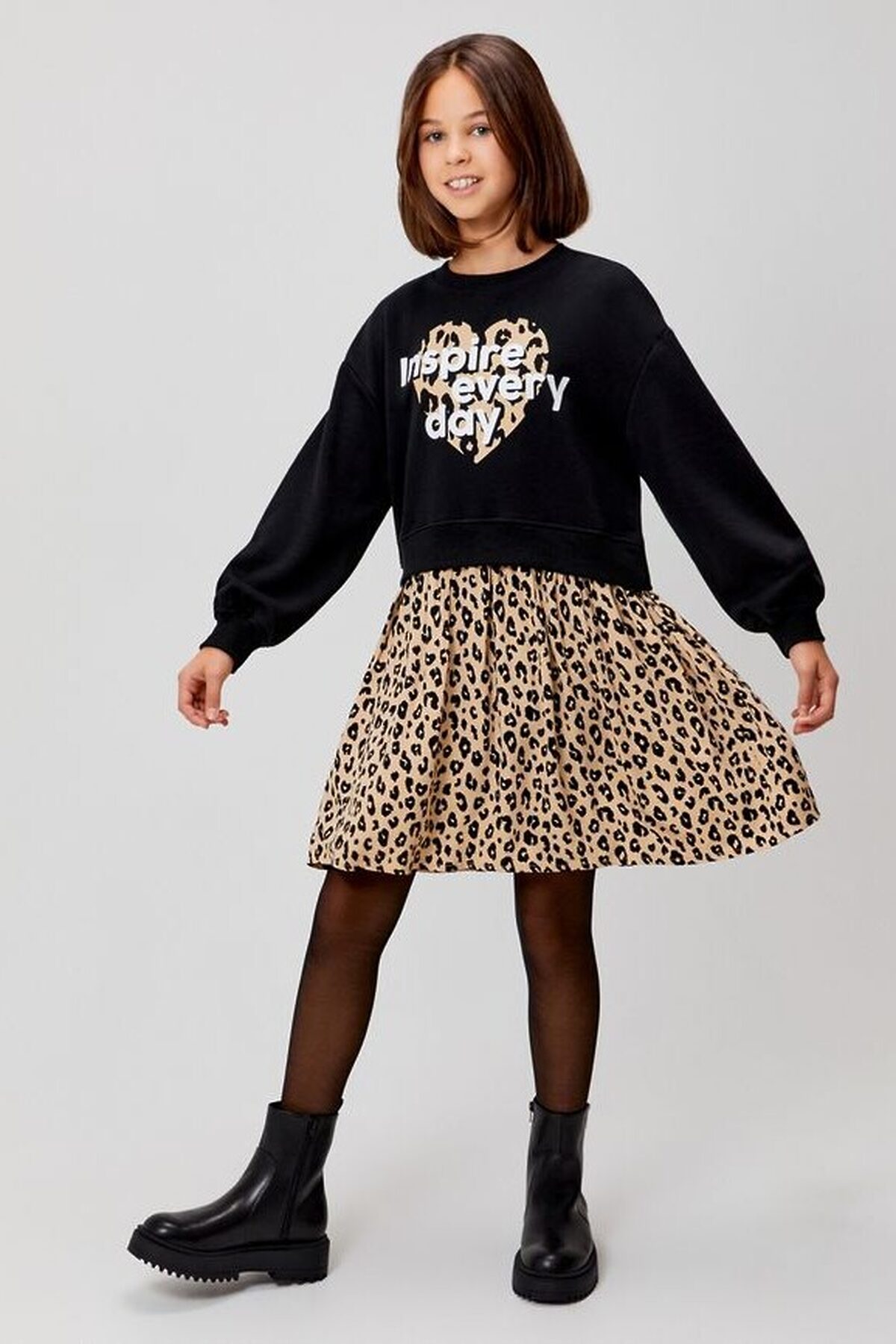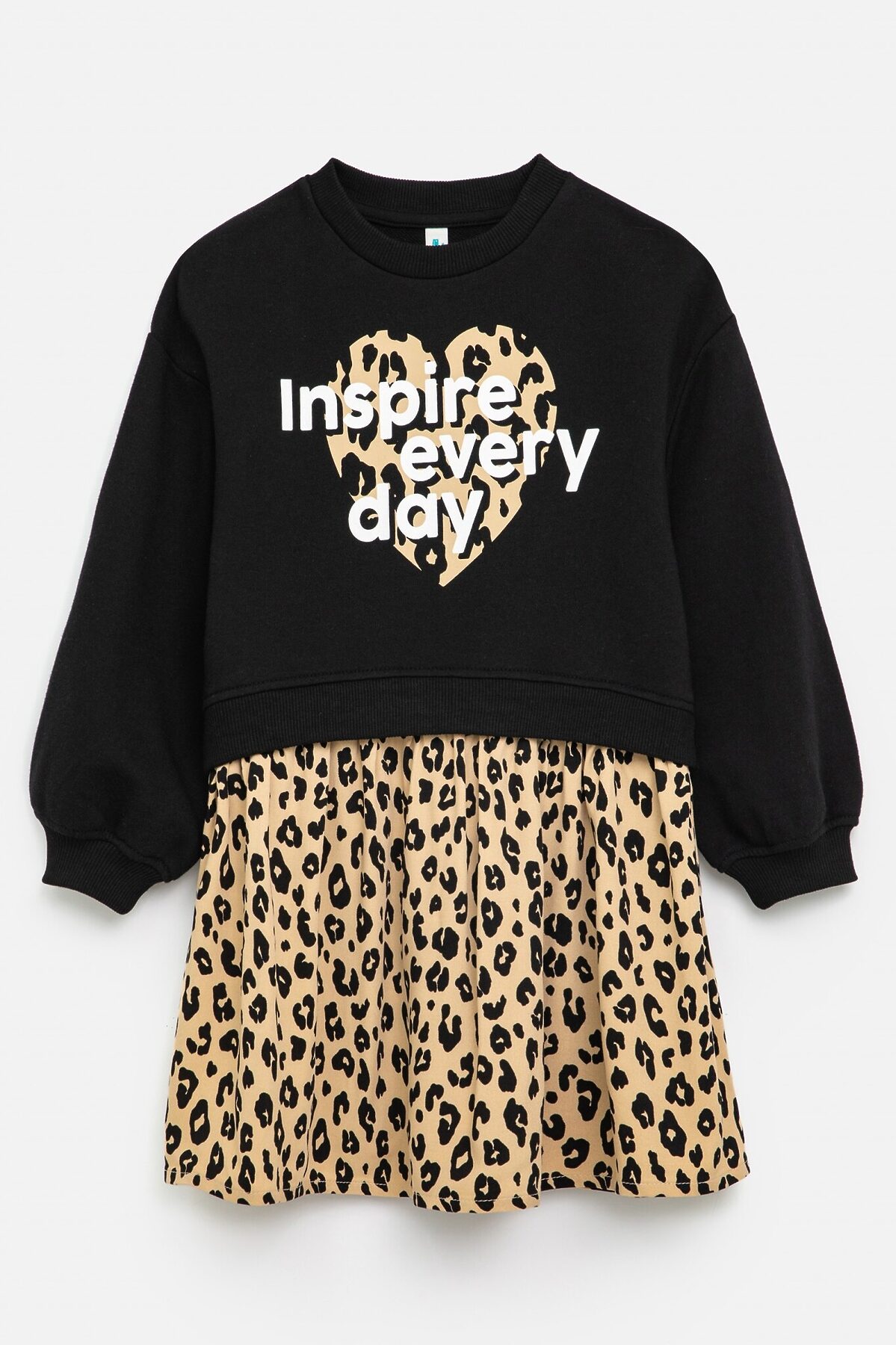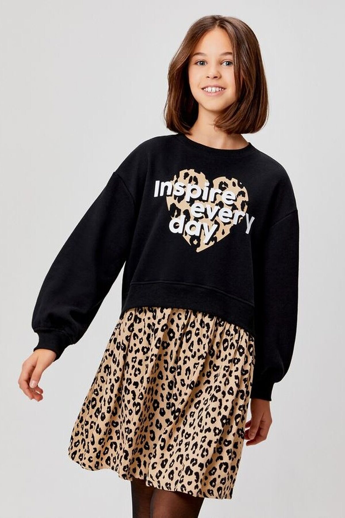 Стильное платье для девочки. Модель свободного силуэта длиной до колена создаёт эффект свитшота-оверсайз, надетого поверх платья с леопардовой расцветкой. Верх выполнен из трикотажной ткани с принтом и надписью* на груди. Юбка сшита из легкой вискозной ткани с дизайнерским анималистичным принтом. * "INSPIRE EVERY DAY" англ. - "Вдохновлять каждый день"