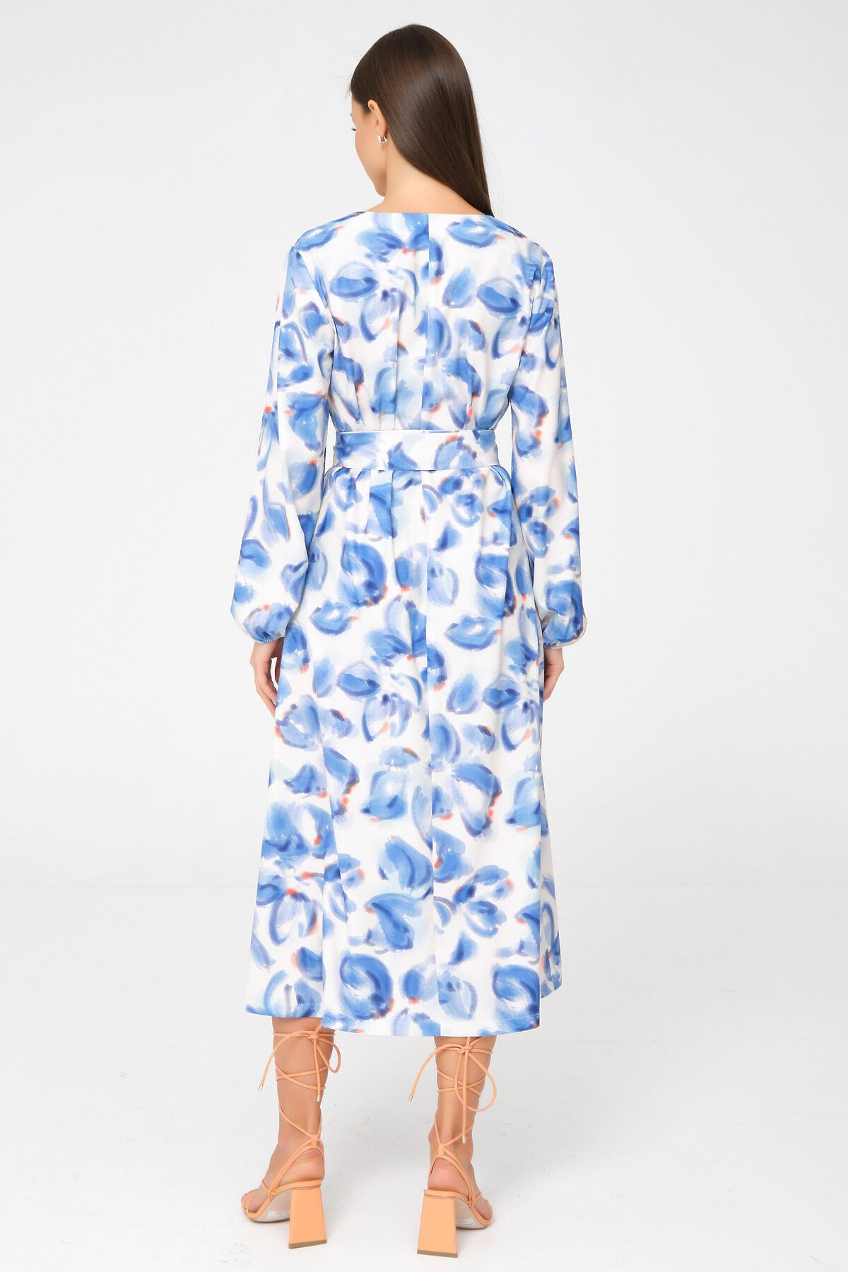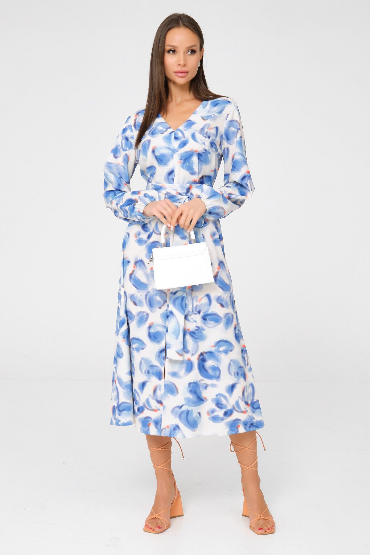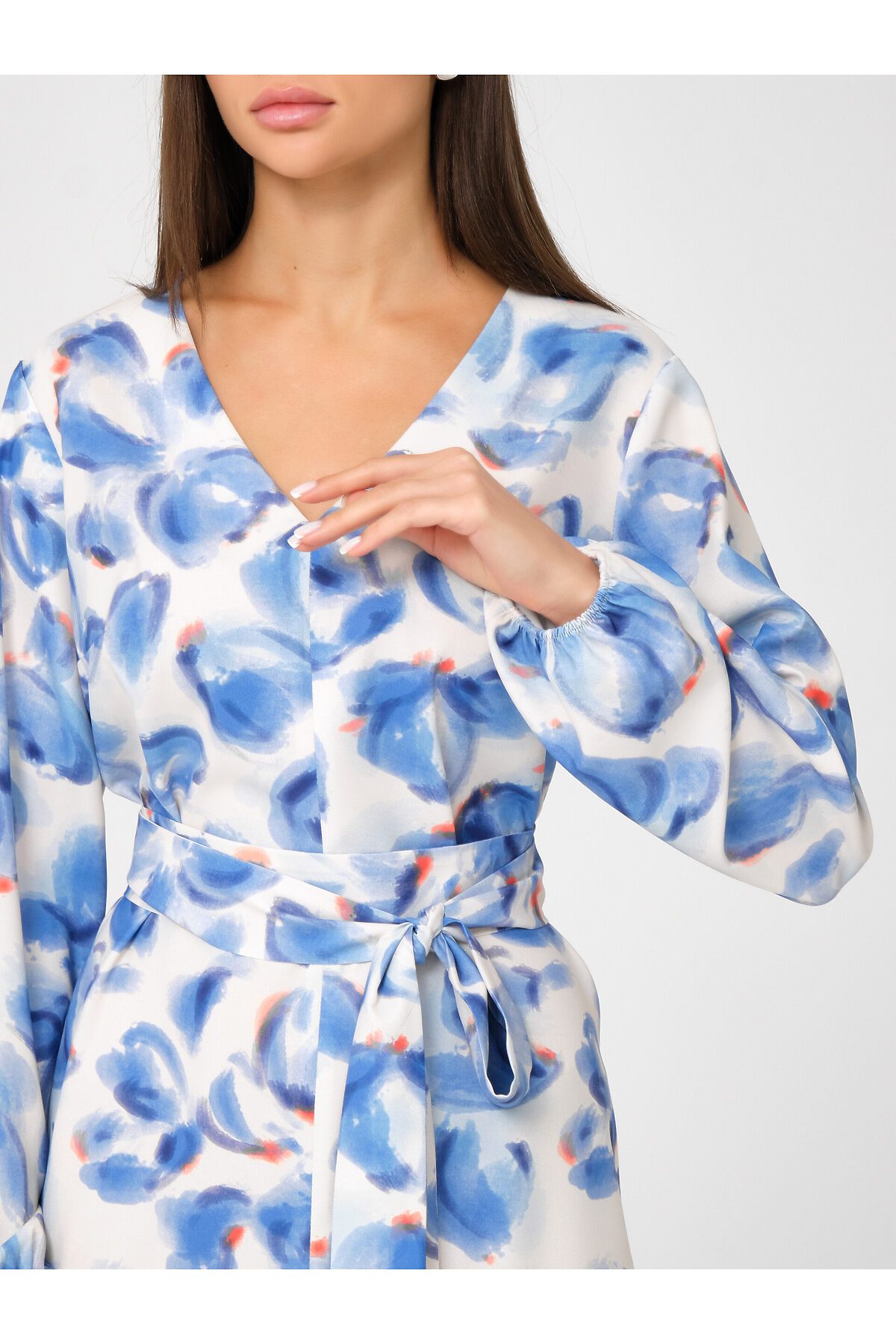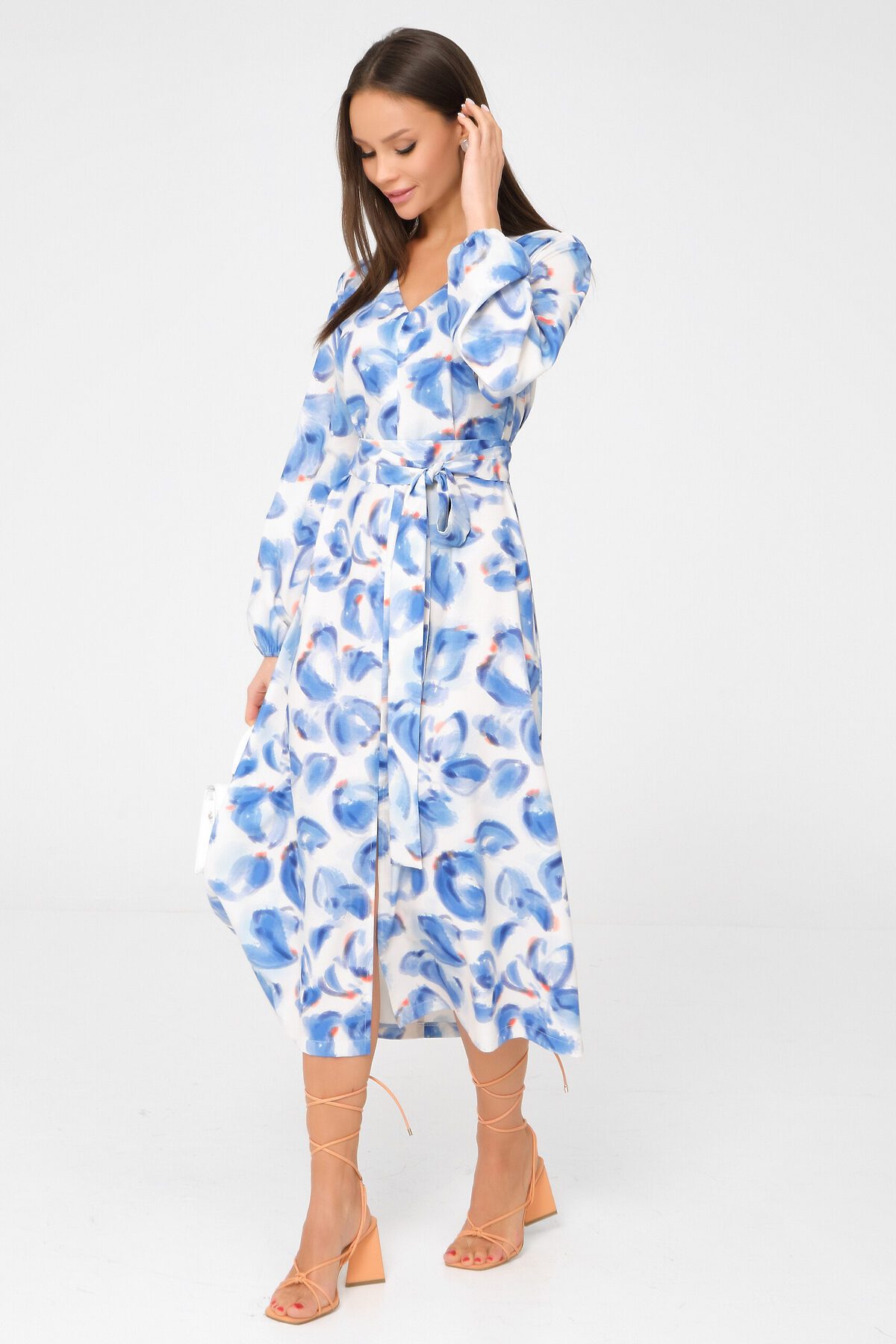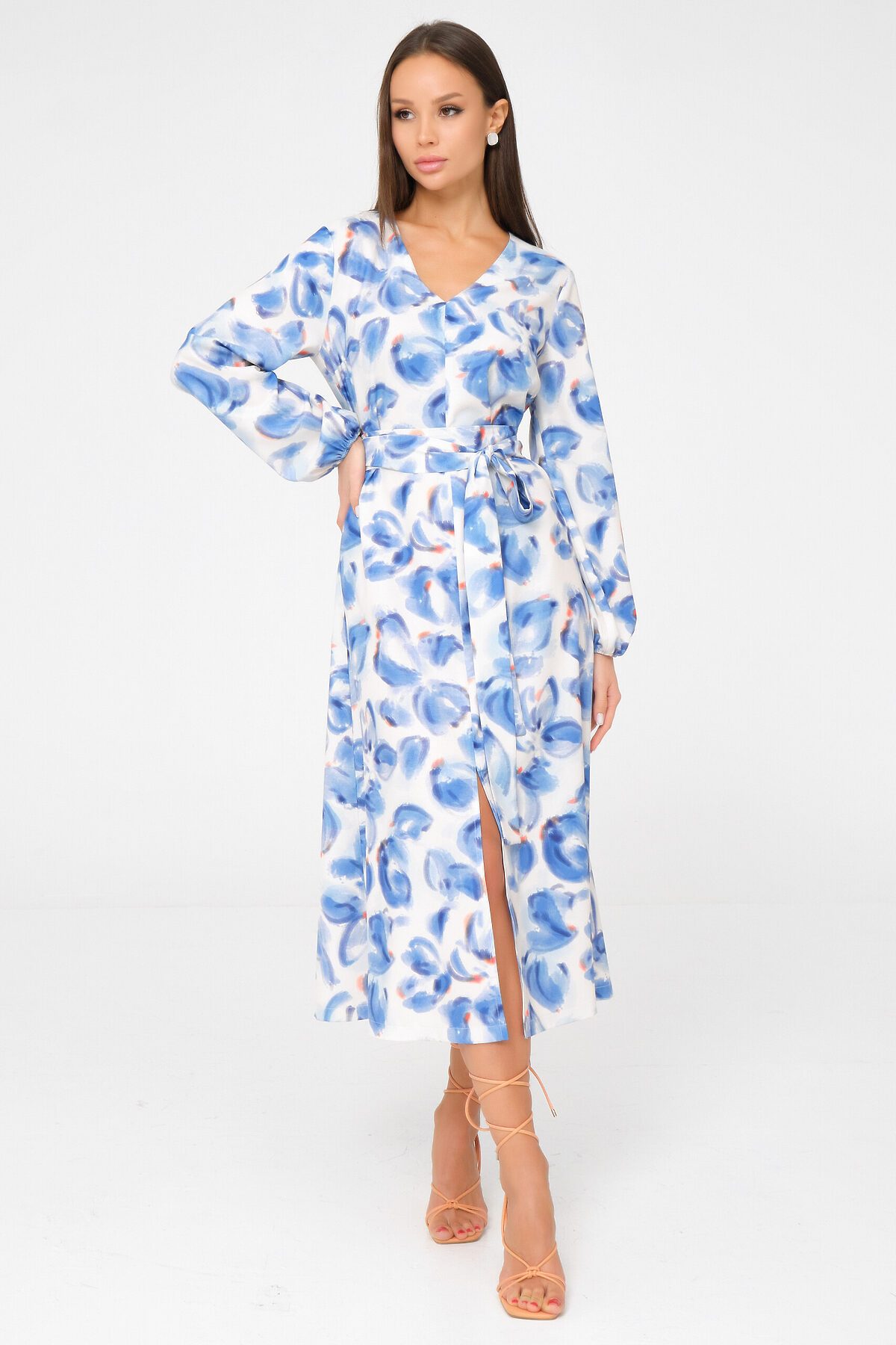 Платье с принтом. Плечо спущенное. Спреди в среднем шве высокий разрез. Спинка со средним швом. Низ рукава собран на резину. Талия подчёркнута длинным завязывающимся поясом из основной ткани.