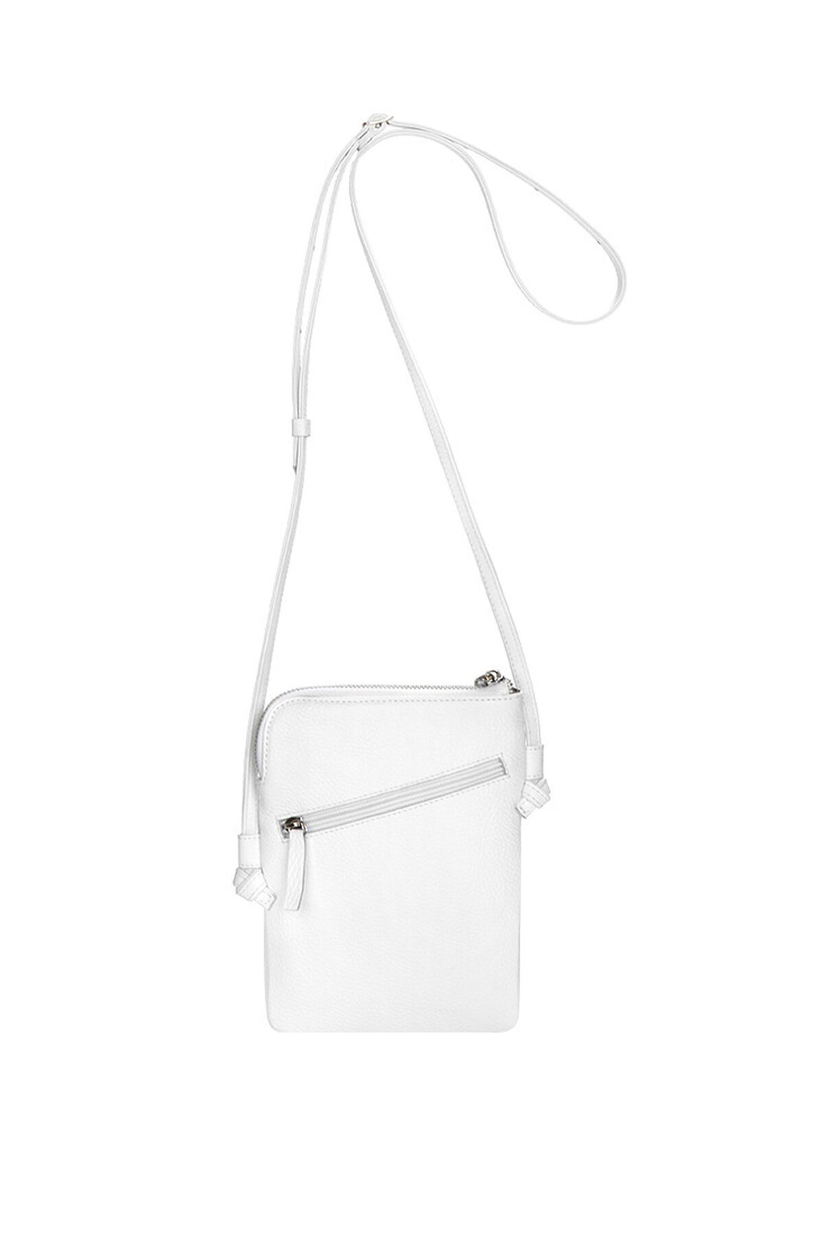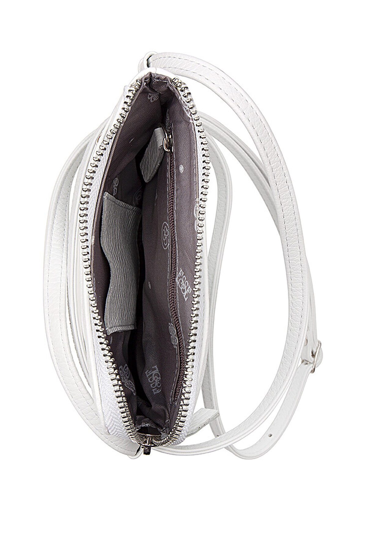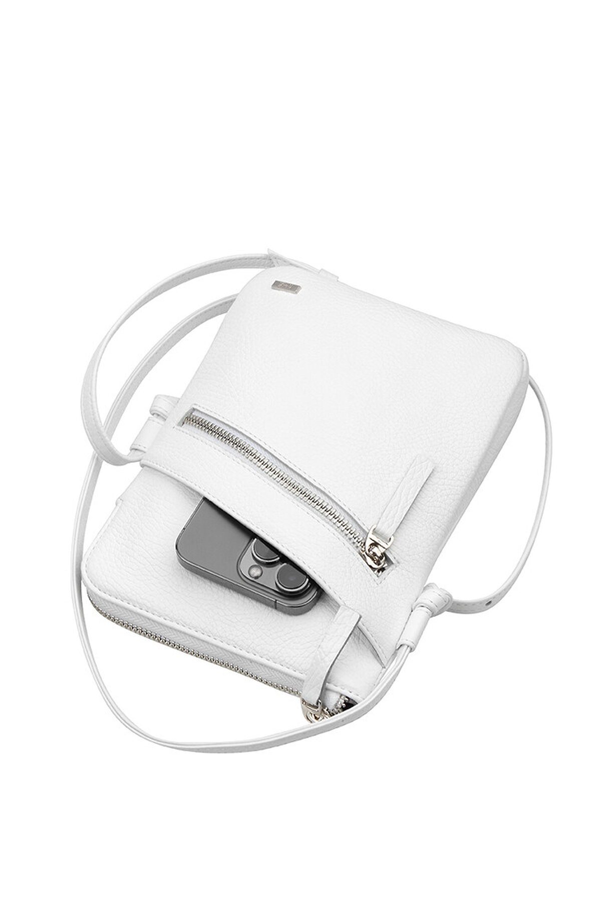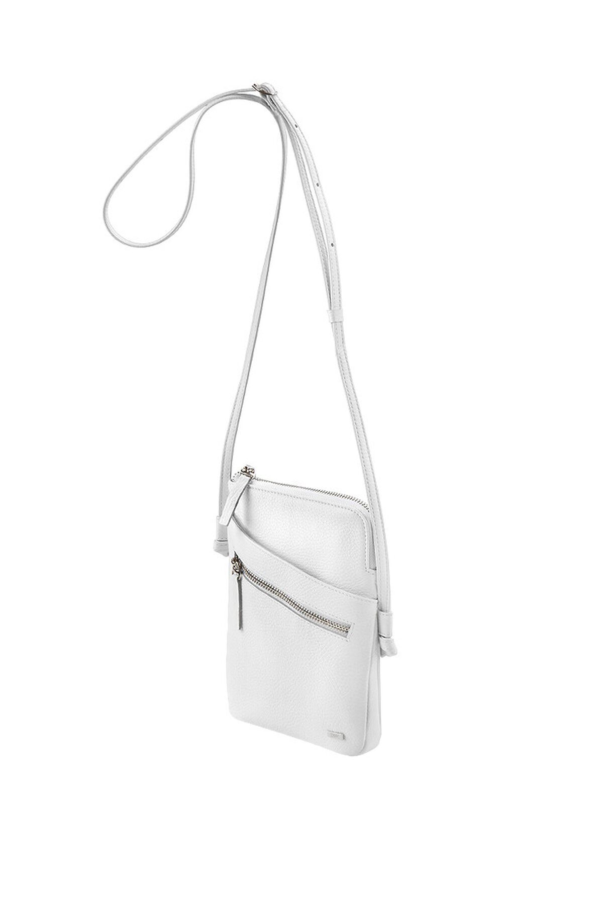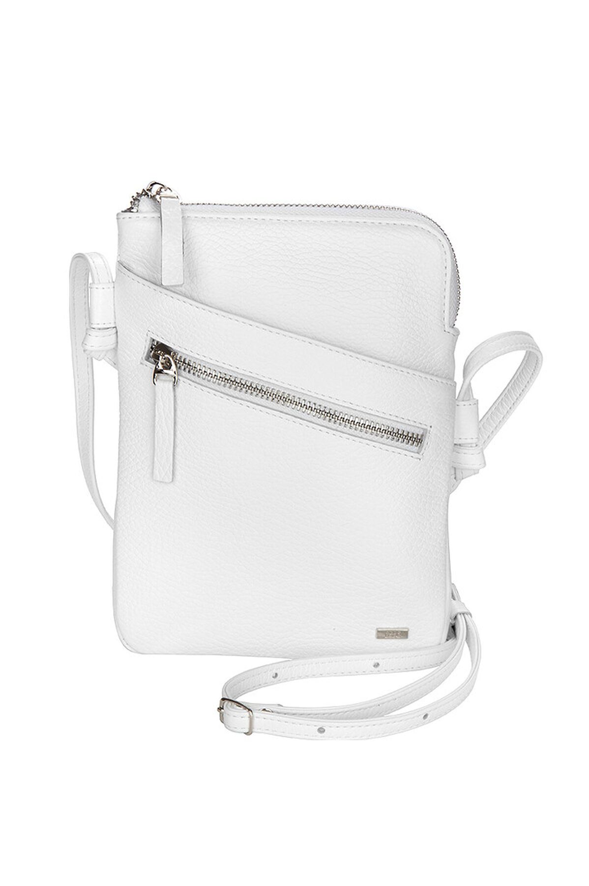 Маленькая женская сумочка из натуральной кожи. Сумка имеет одно отделение, внутри которого карман на молнии и открытый карман для банковской карты. На задней стенке карман на молнии, в который помещается паспорт. На передней стенке открытый карман и карман на молнии. Ремень шириной 1 см и длиной 135 см регулируется с помощью пряжки.