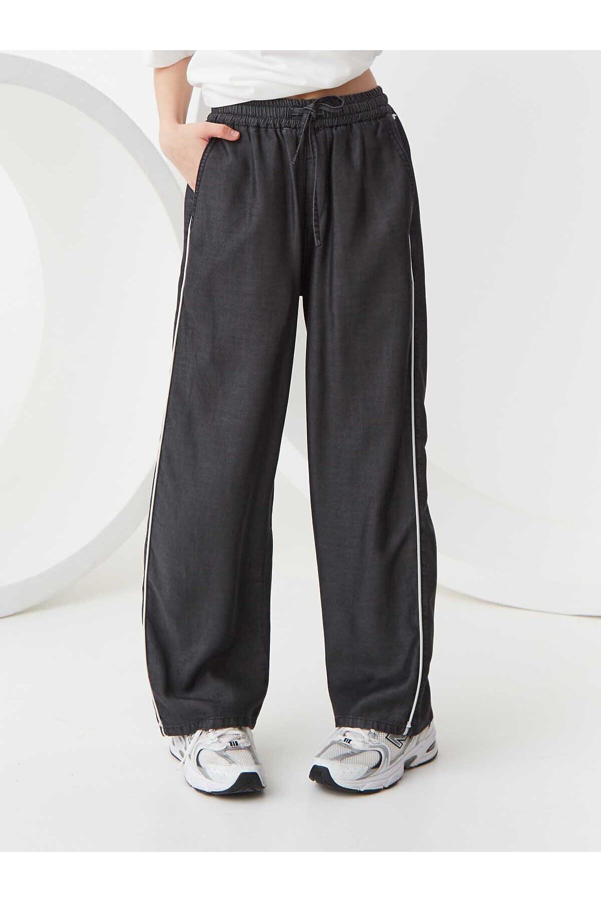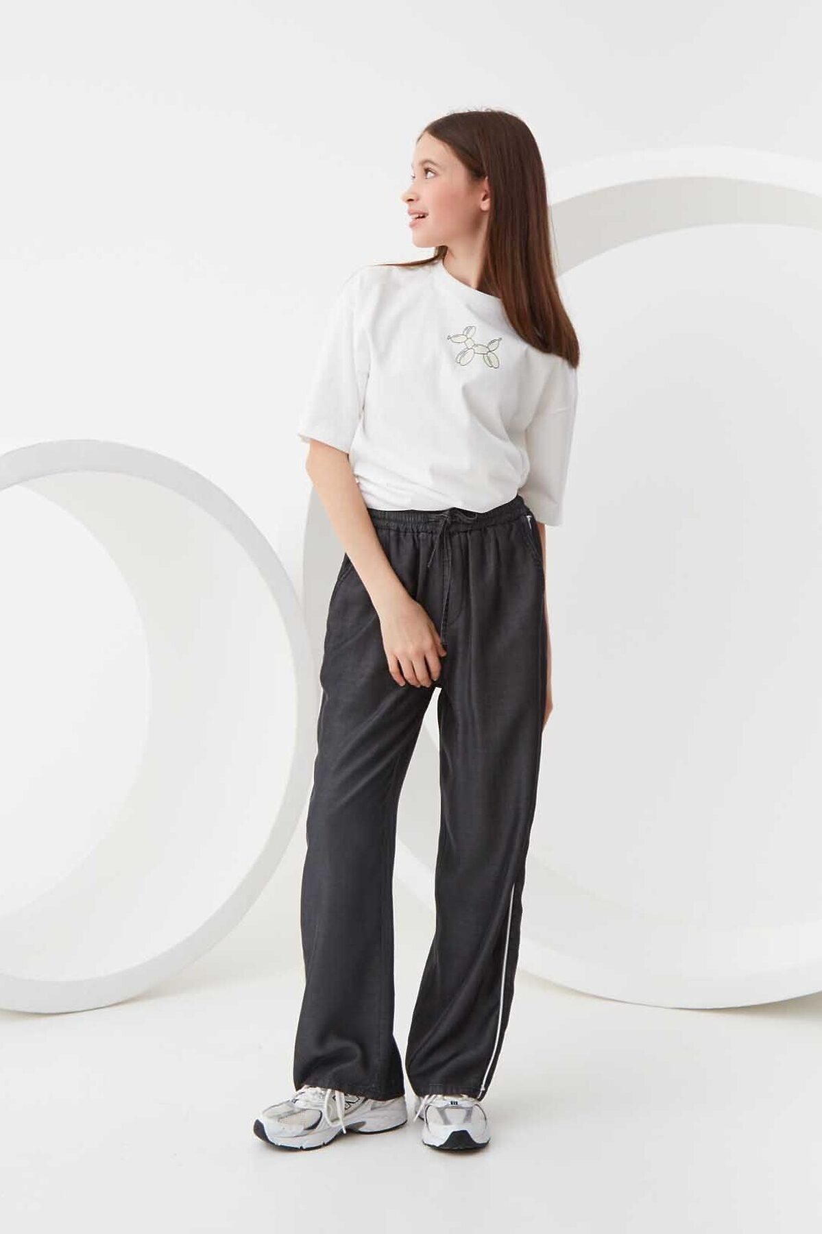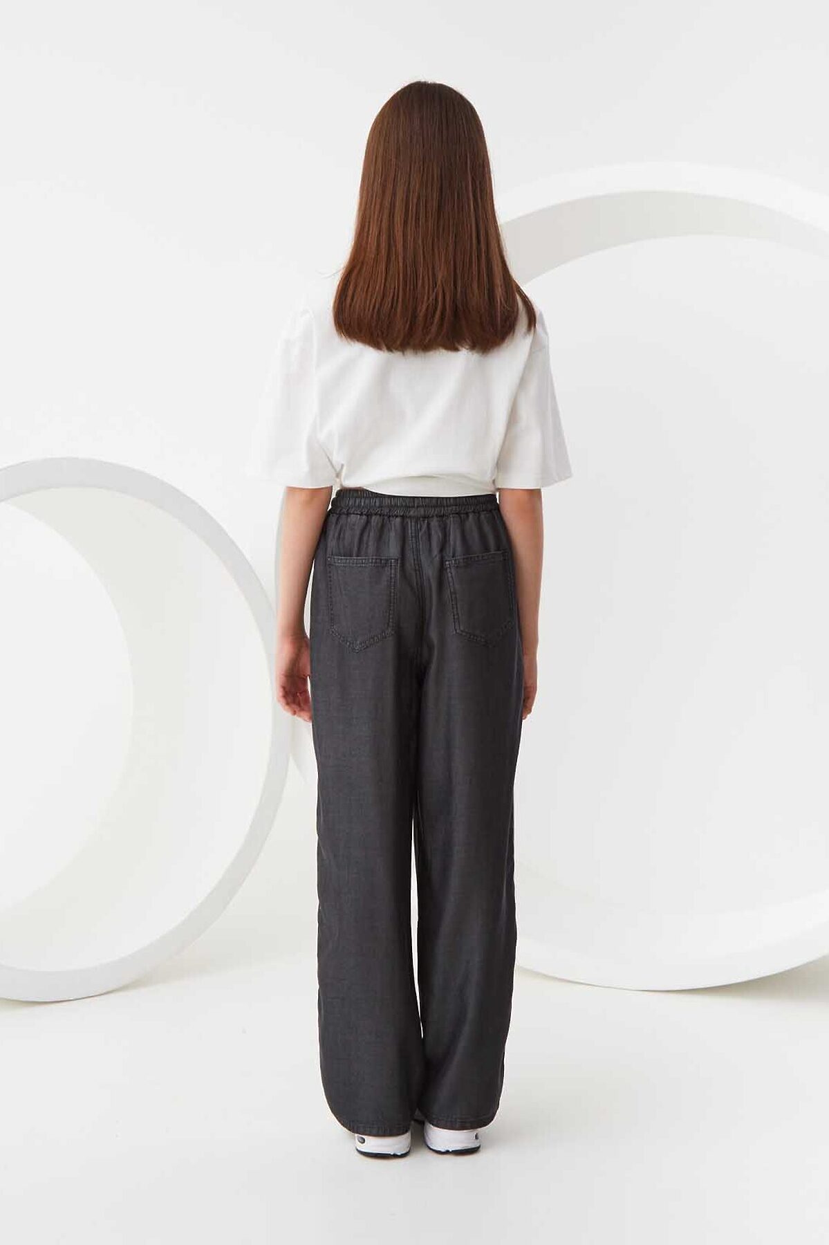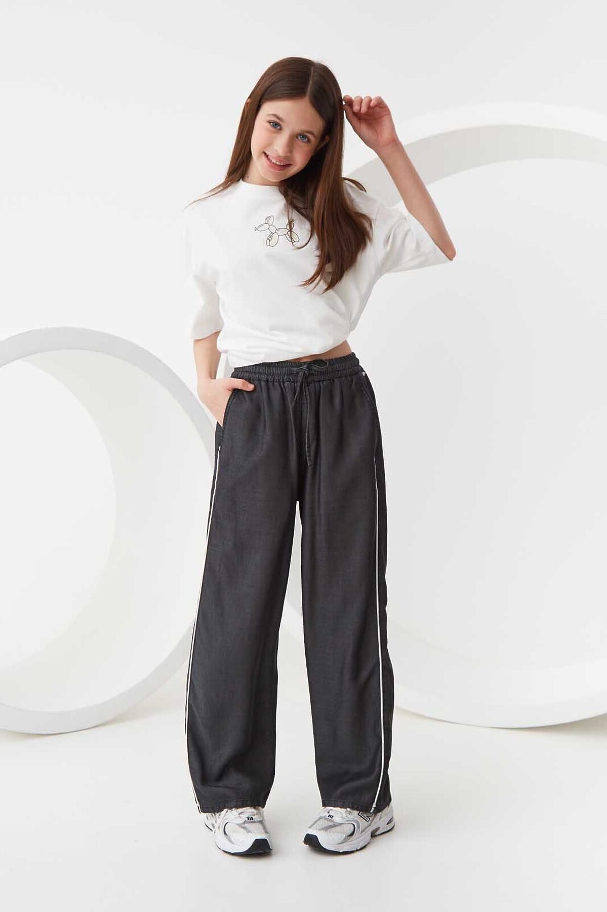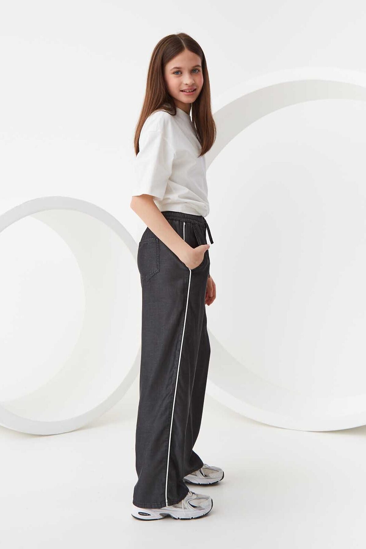 Джинсовые брюки из лиоцелла с эластичным поясом. Расслабленный прямой крой со средней посадкой талии и брючинами полной длины. Пояс на резинке с плоским шнурком. По бокам расположены контрастные лампасы белого цвета. Представлены в 2 цветах – синий и серый. На модели представлен размер 146. Размерный ряд 128 – 176 см.