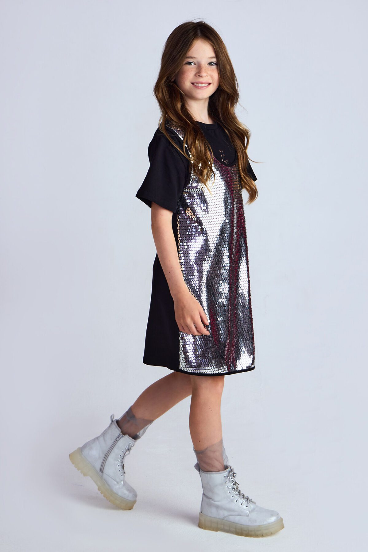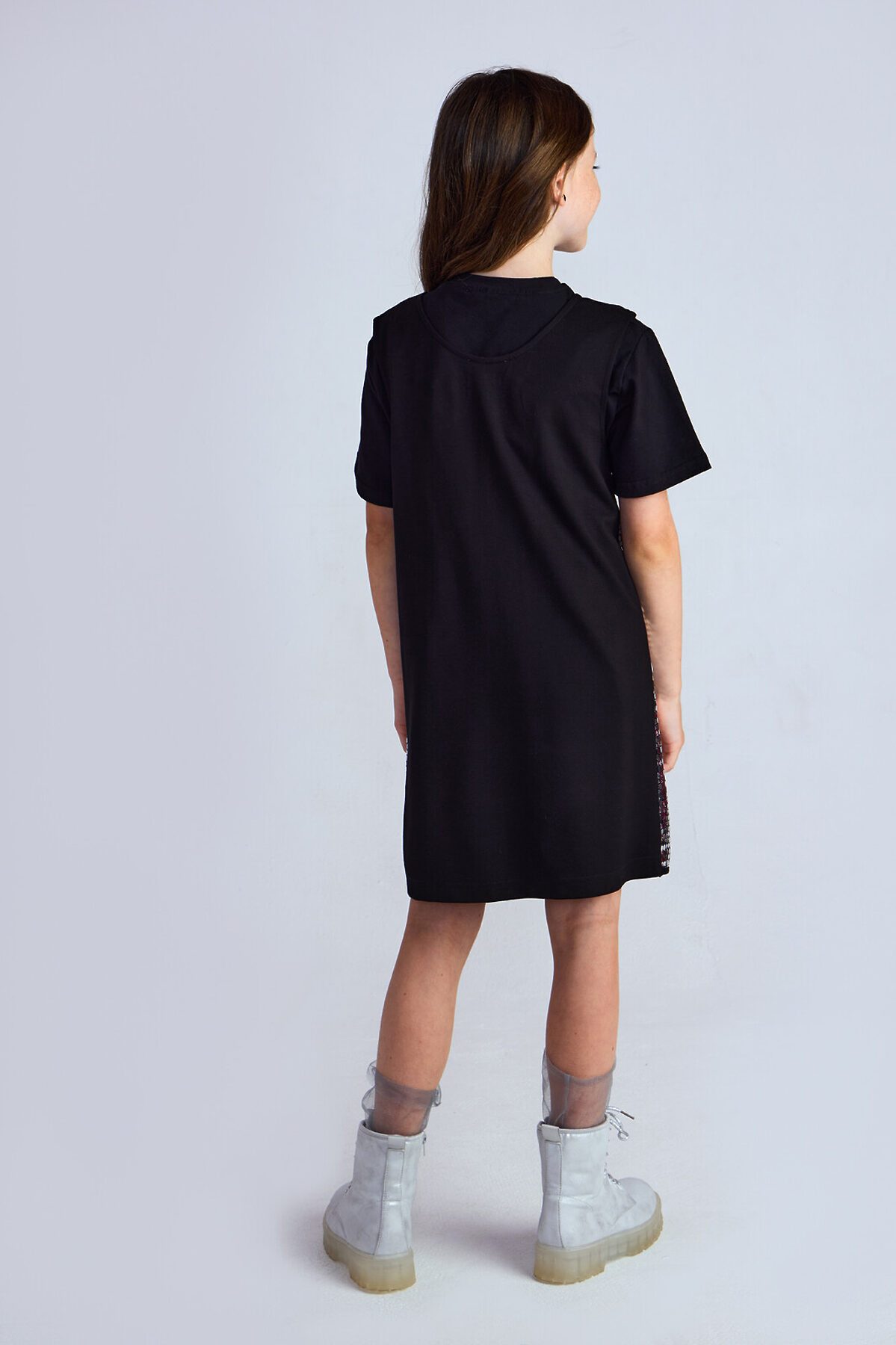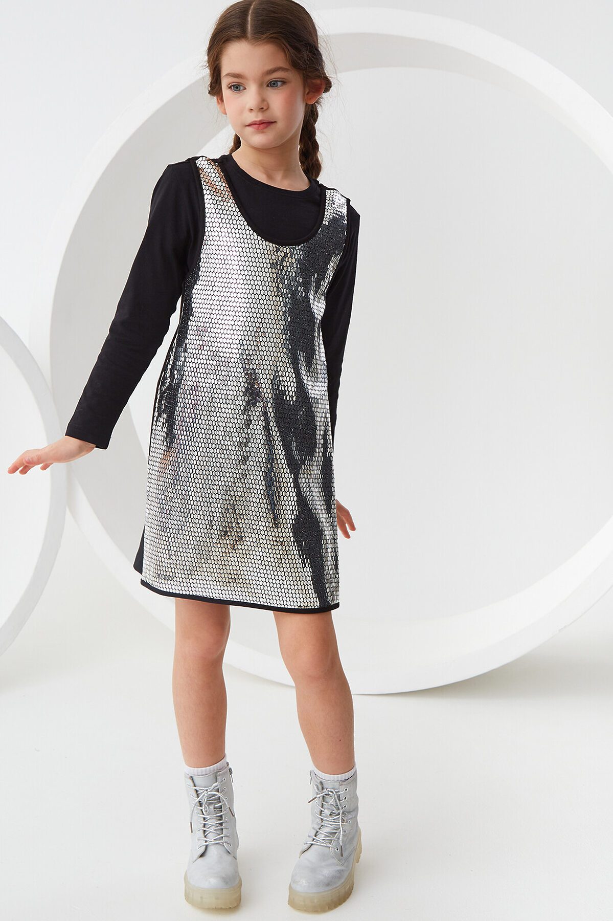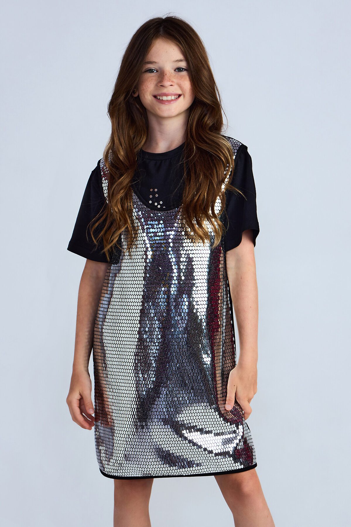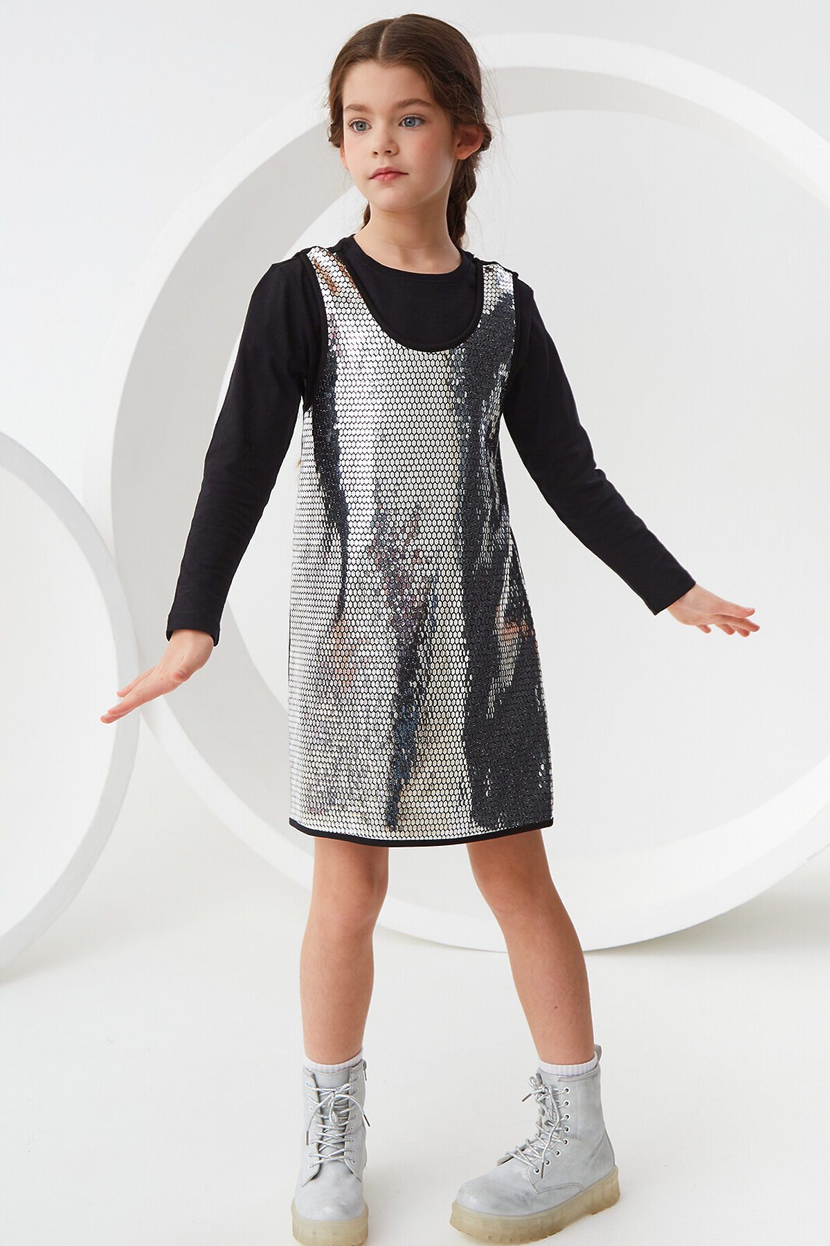Трикотажный сарафан без рукавов. Актуальная модель свободного силуэта, который слегка расширяется к низу, без застежки. Спереди на сарафане сетка с пайетками спереди Сарафан органично впишется как в праздничный гардероб, так и подойдет для повседневных выходов.