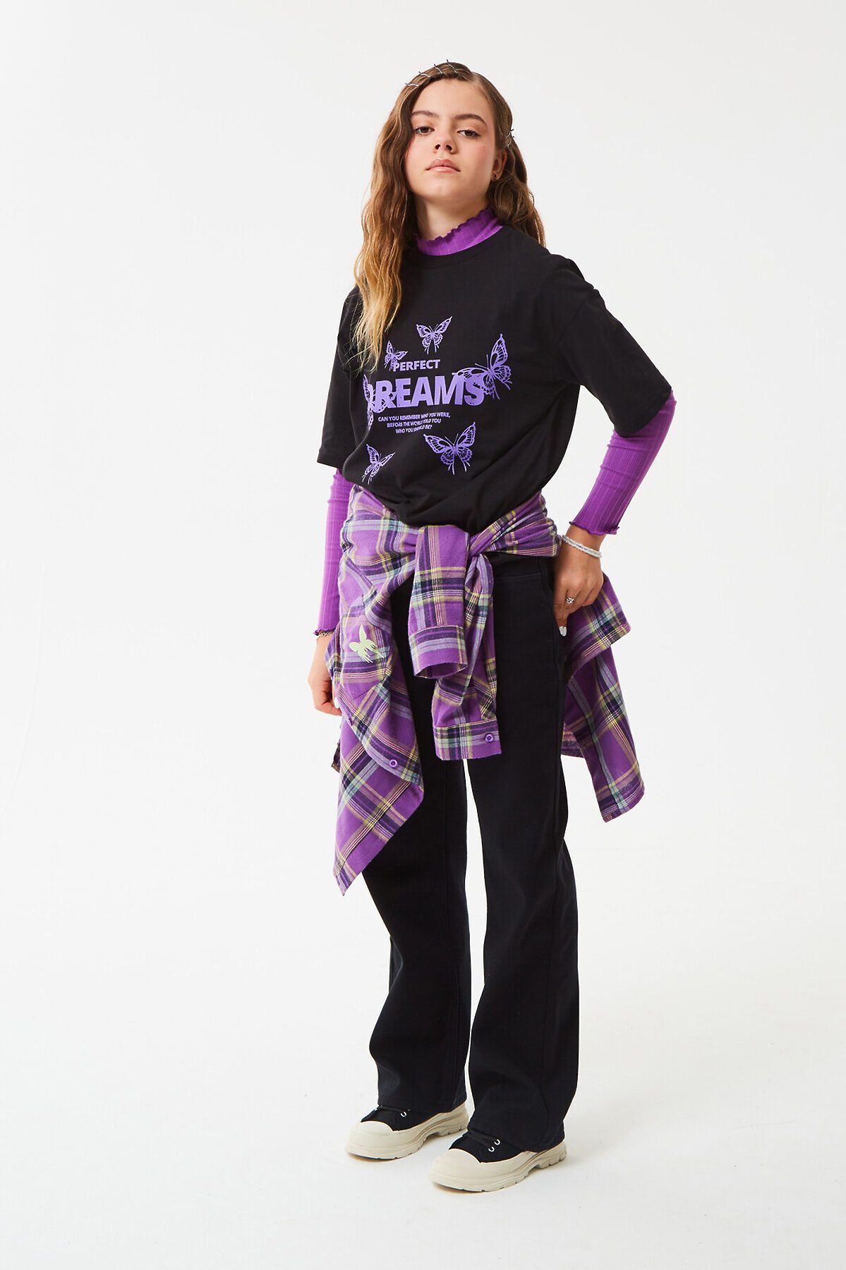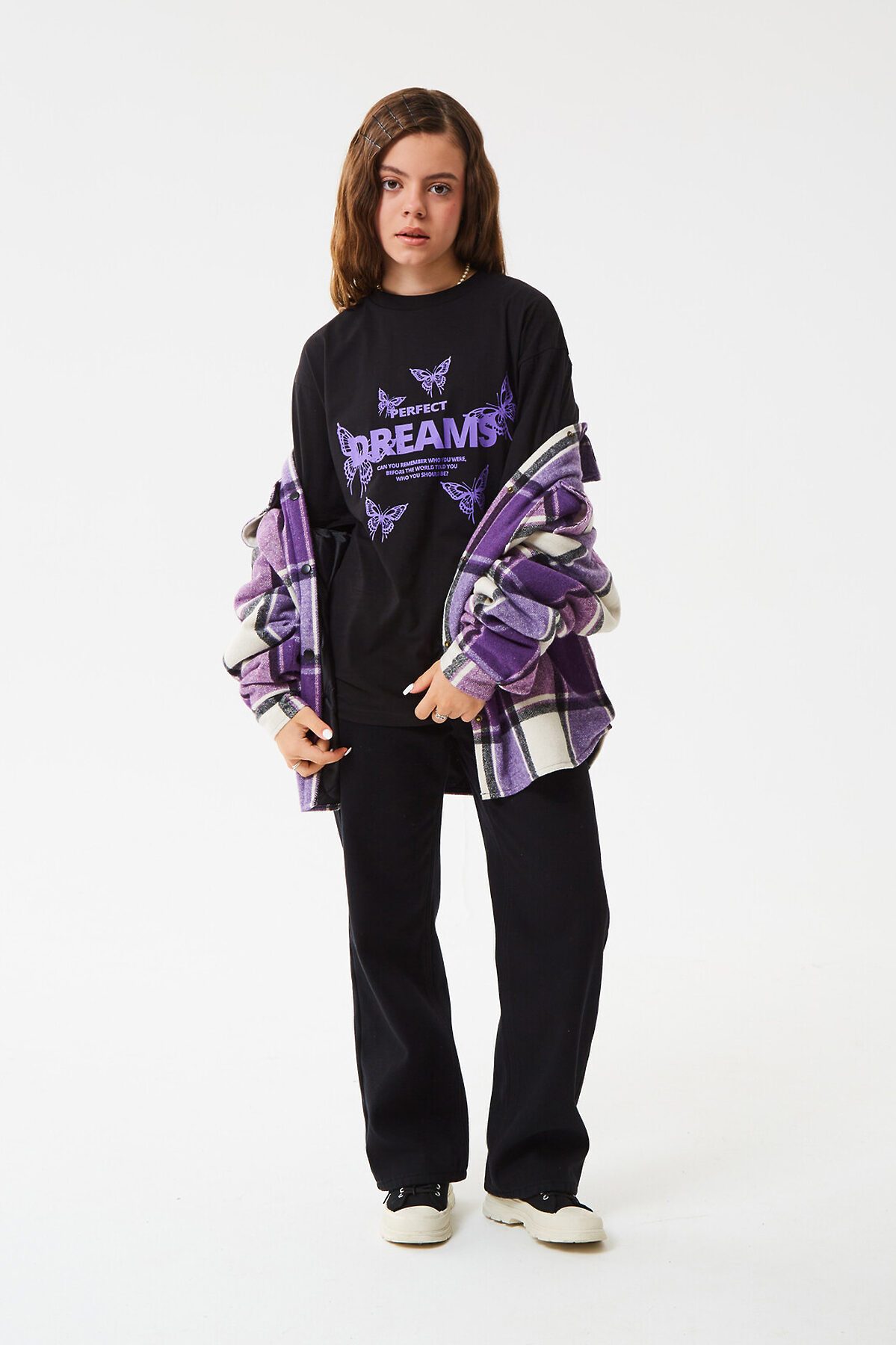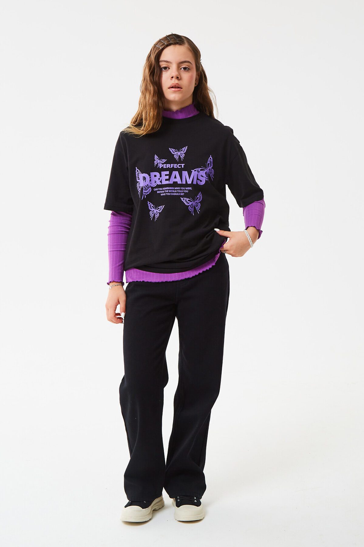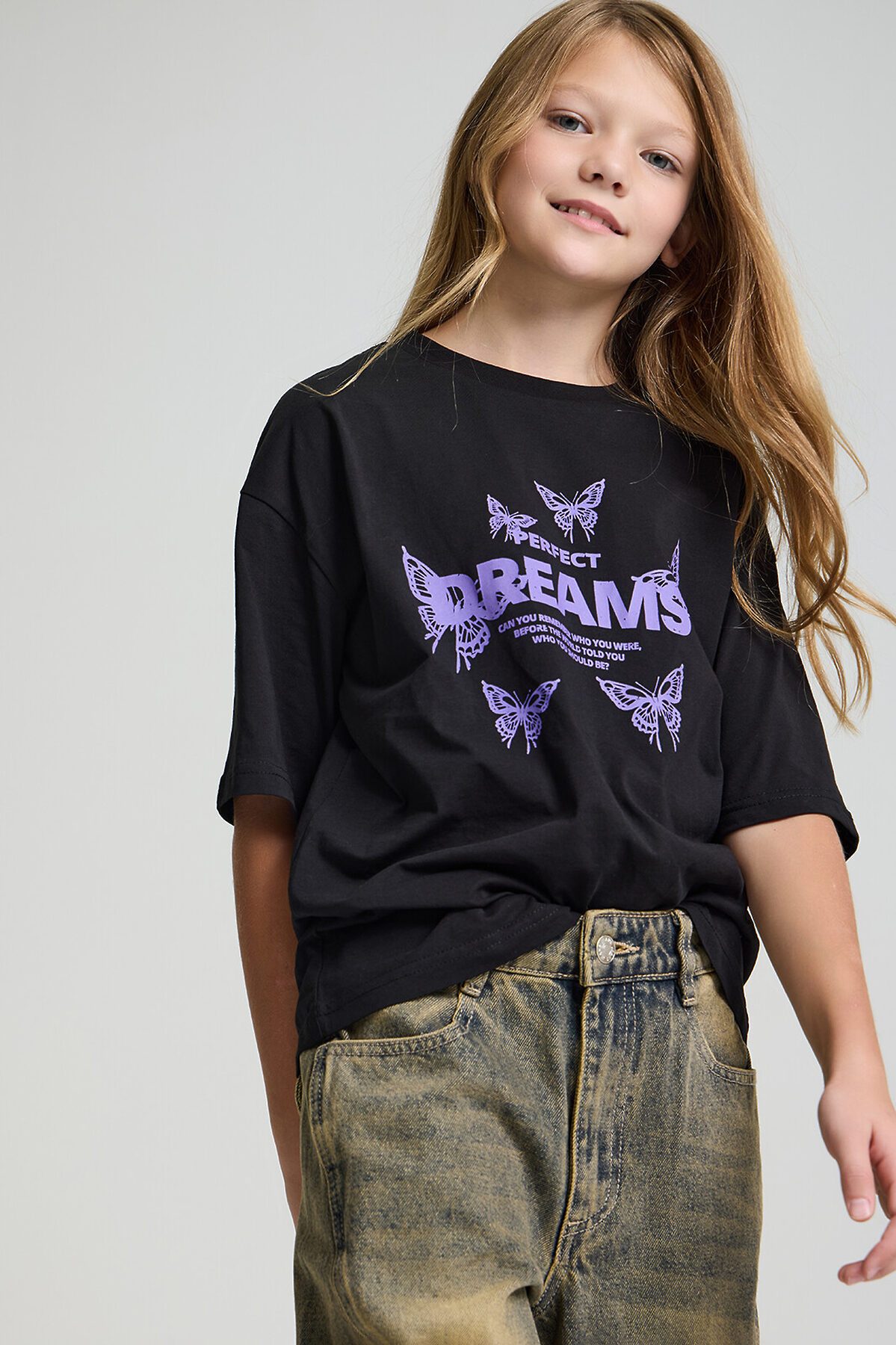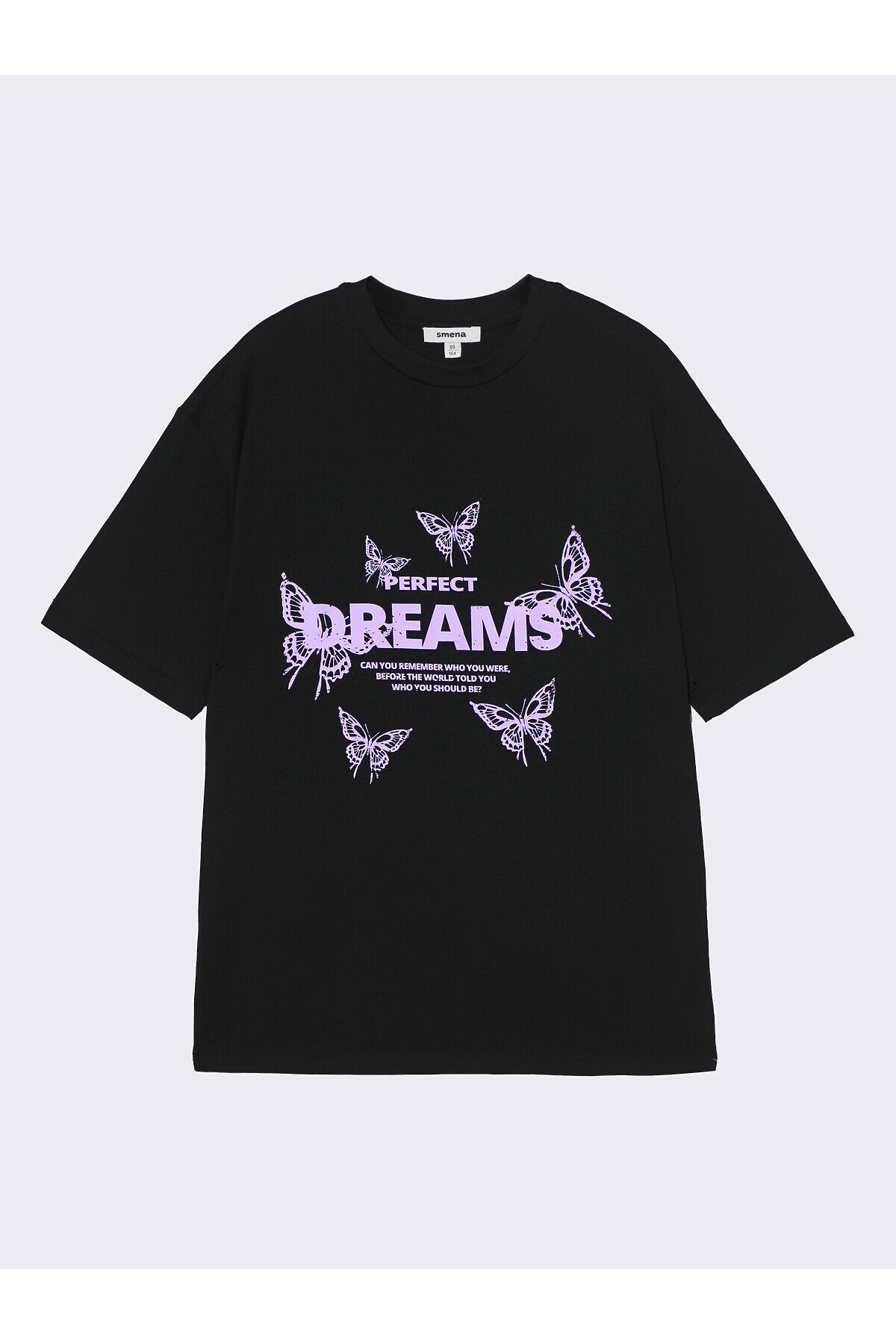 Футболка свободного кроя с короткими рукавами. Модель в трендовом оверсайз силуэте с большим креативным принтом с яркой надписью и бабочками на груди. Отлично подойдет для активного отдыха и повседневной носки. Доступна в 2 цветах.