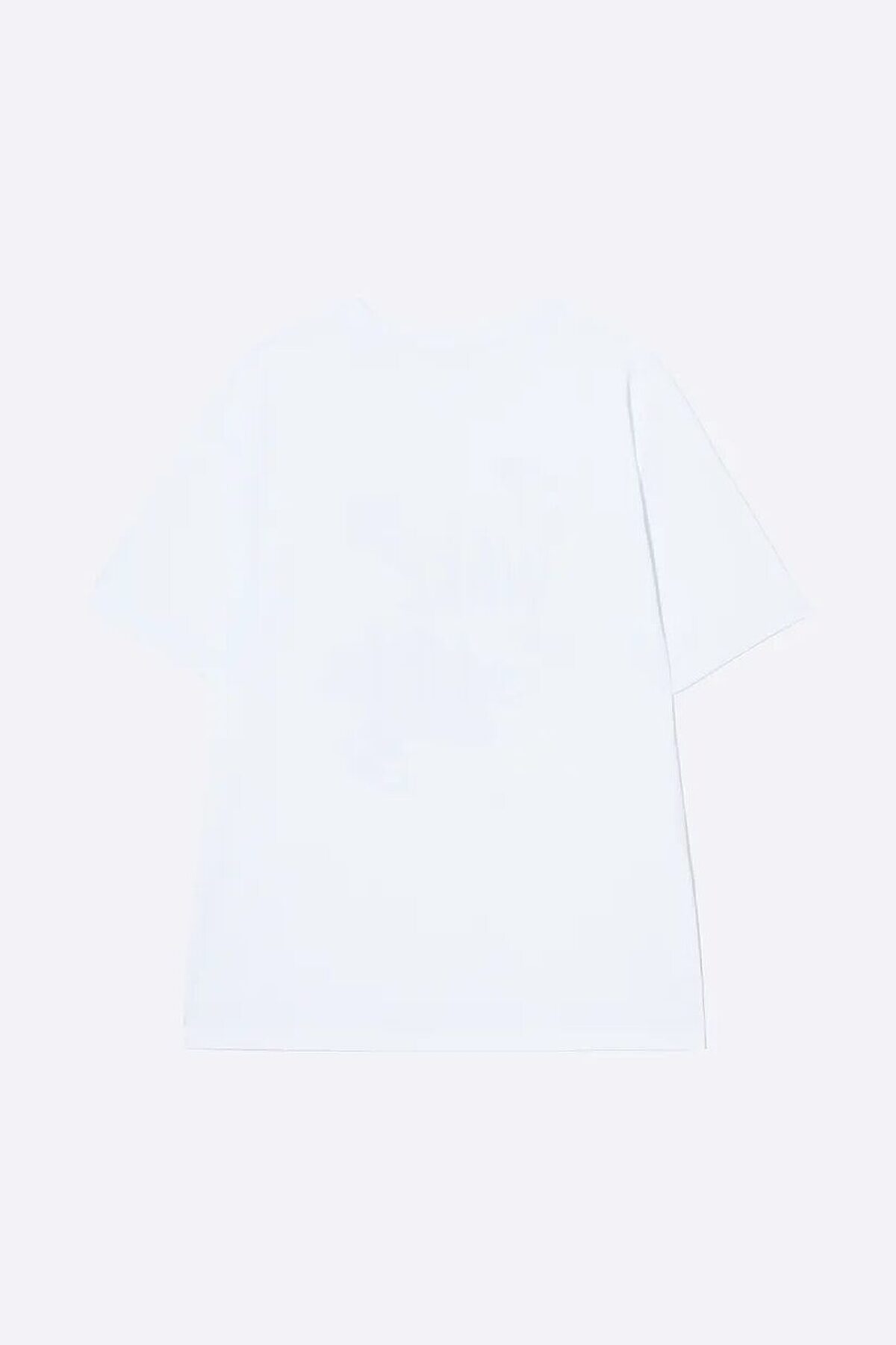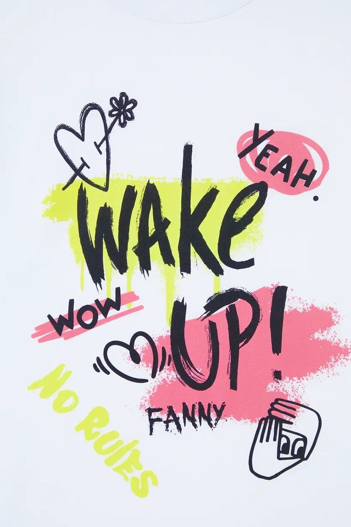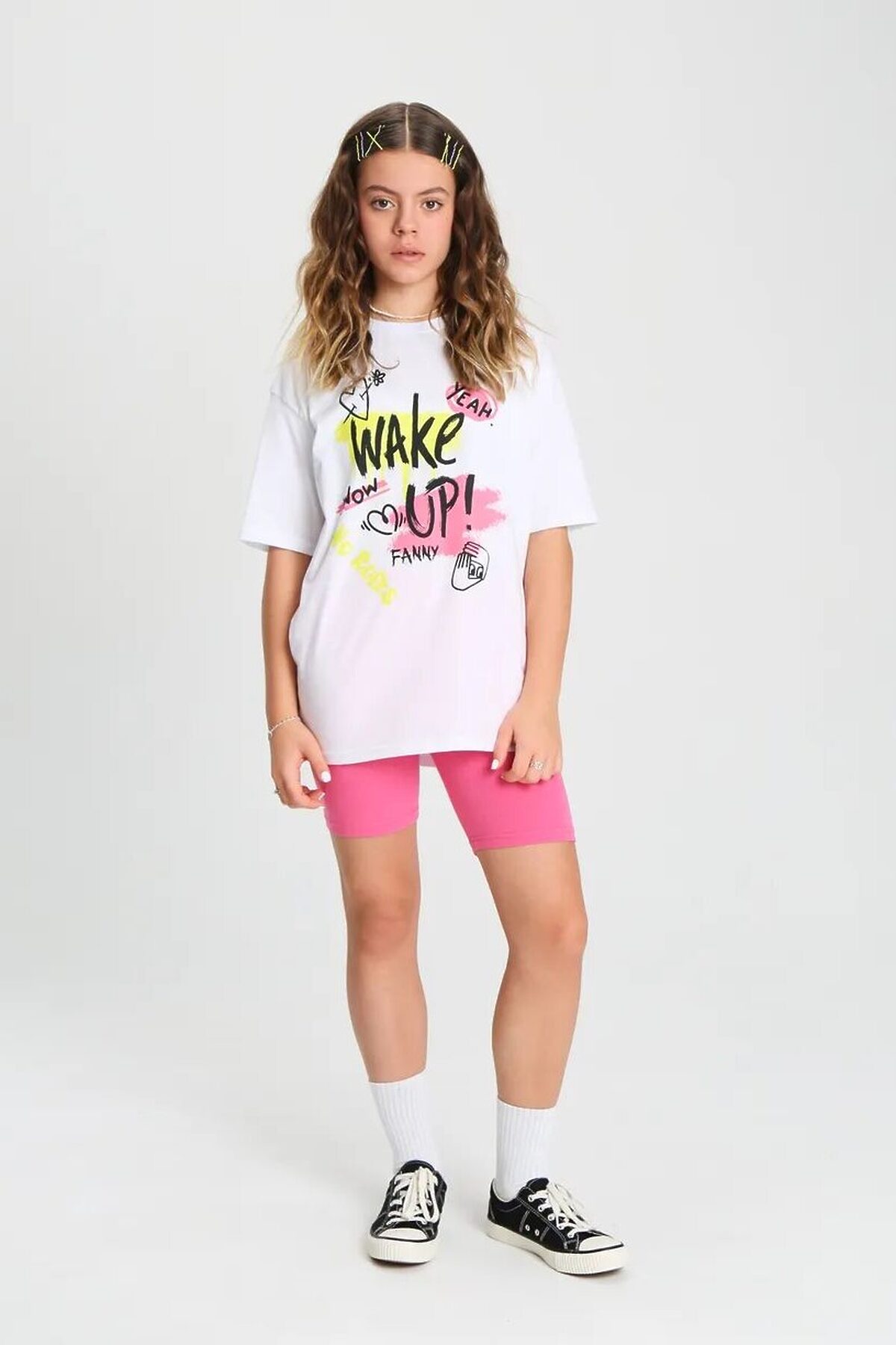 Стильная футболка для девочек. Свободный прямой силуэт, приспущенное плечо и немного увеличенный объём рукава для оверсайз посадки. Модель выполнена из качественного трикотажа, который отводит влагу и подходит для активного отдыха. Спереди расположен принт в стиле граффити с текстовыми надписями. Комбинируйте футболку в ярких образах с джинсами, юбками или шортами.
