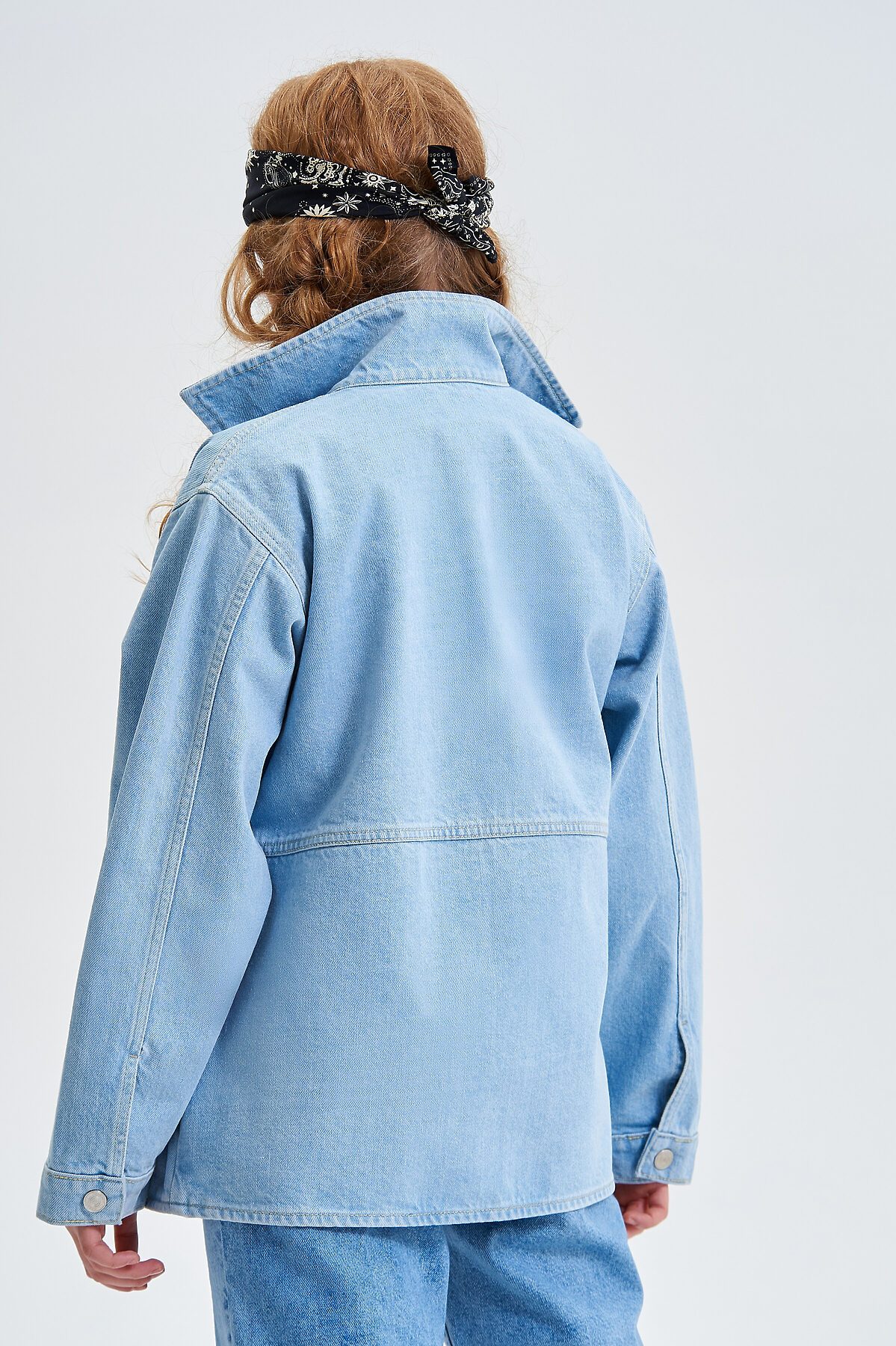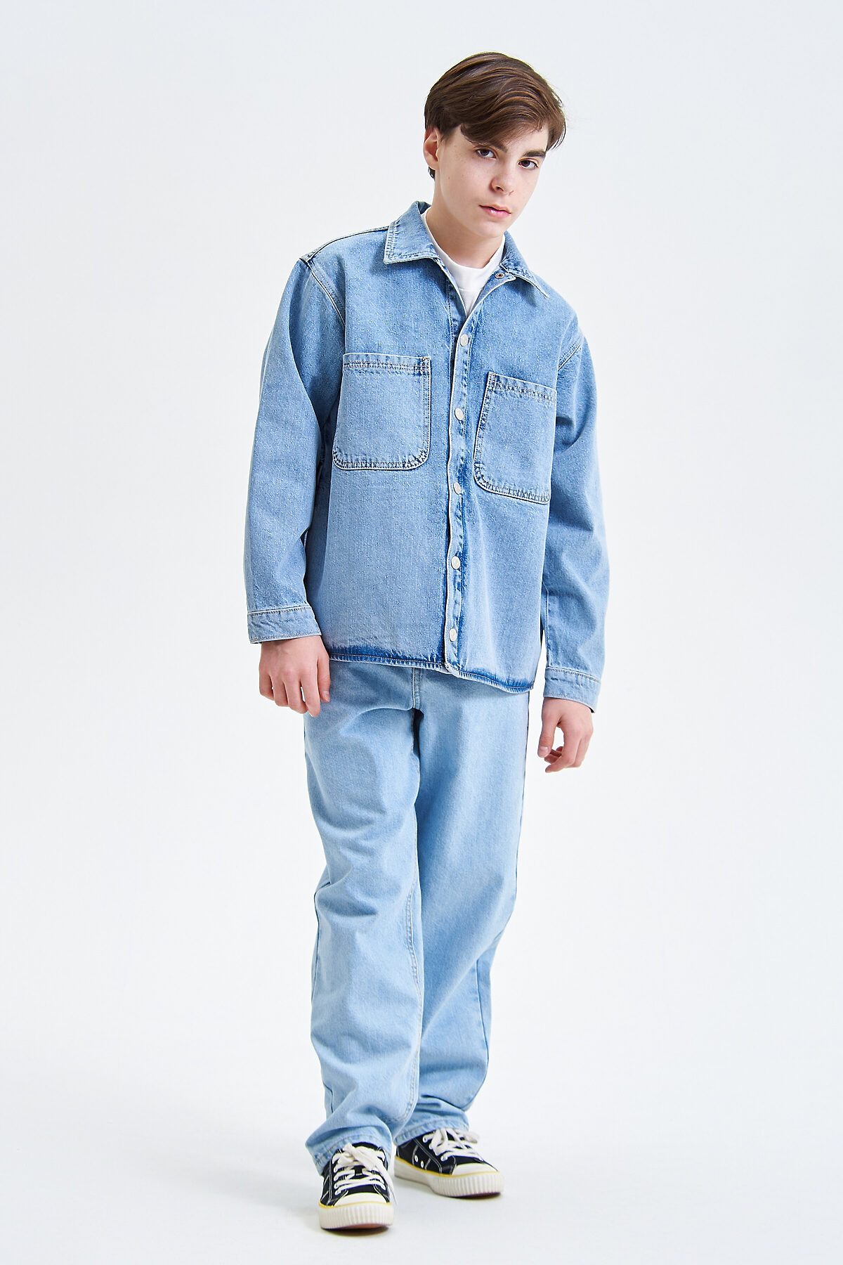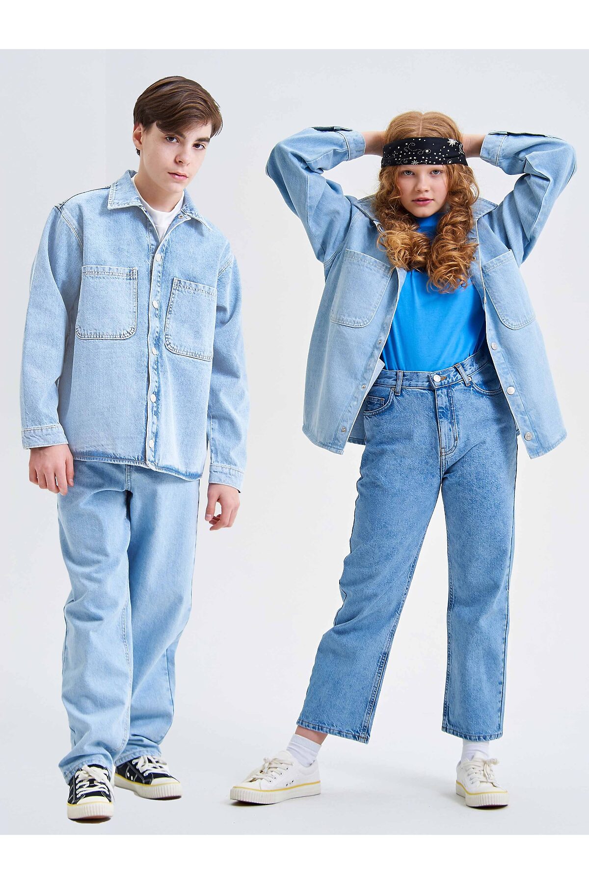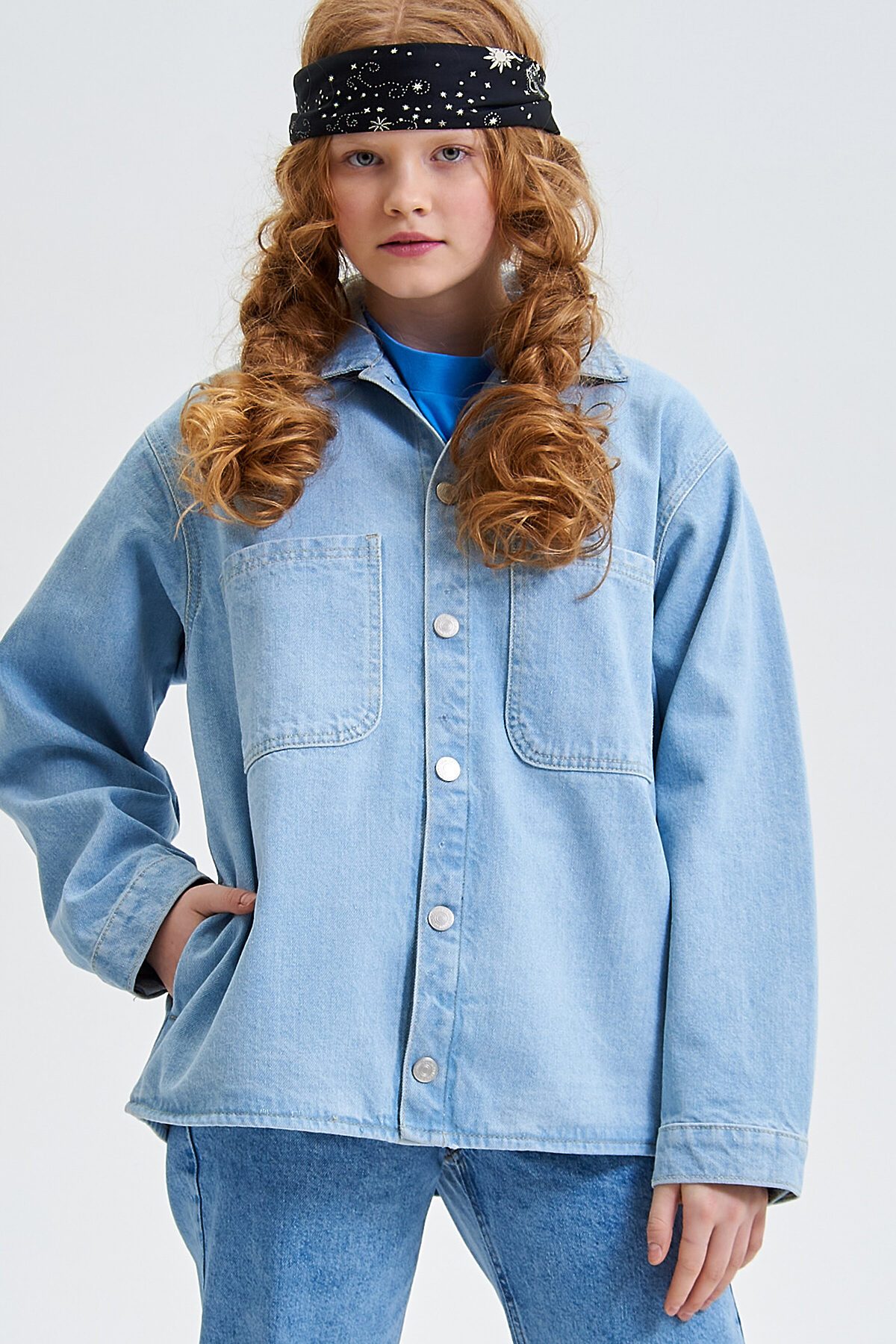 Стильная джинсовая куртка-рубашка свободного кроя из хлопка 12 унций с длинными рукавами, отложным воротником, двумя накладными карманами по груди и контрастной декоративной строчкой. Модель задумана дизайнерами SMENA как унисекс - подходит и мальчикам и девочкам.