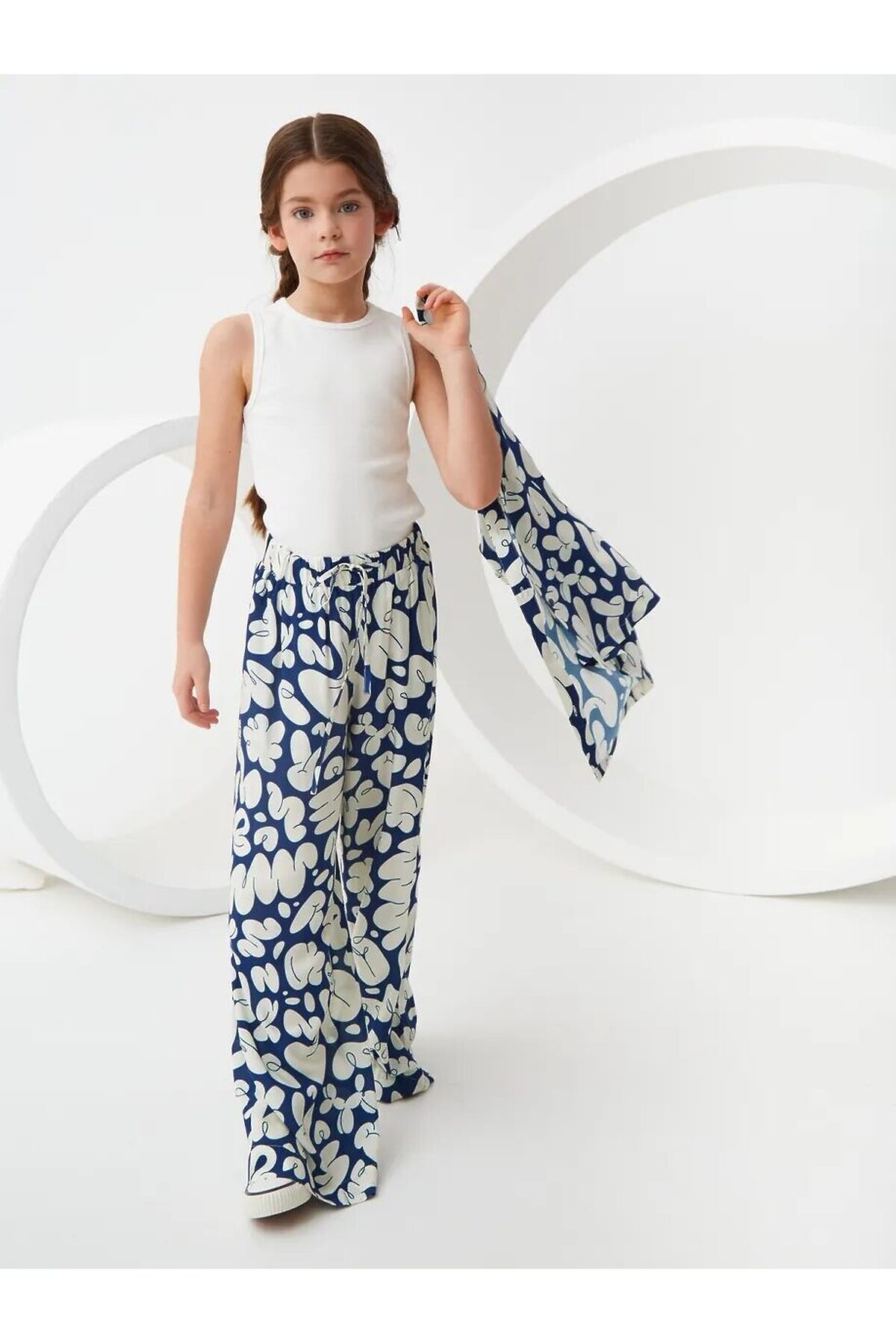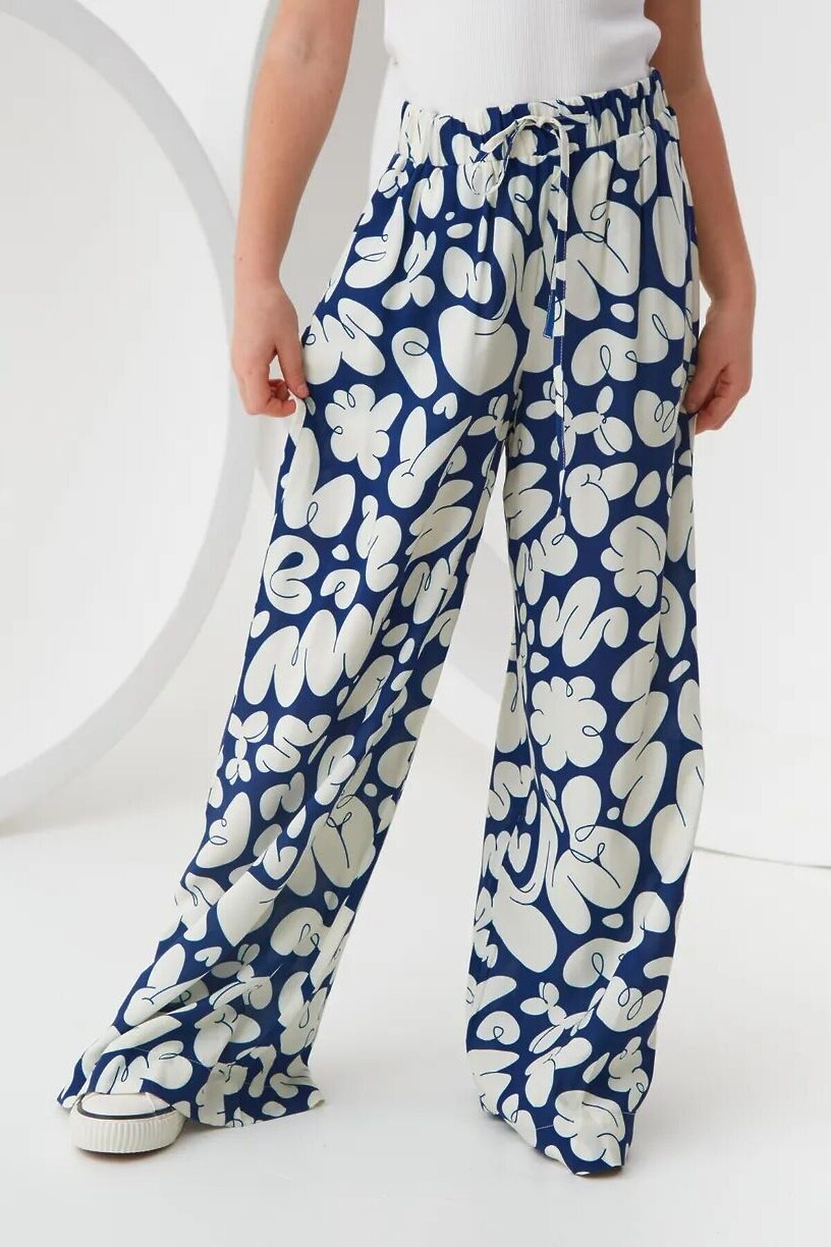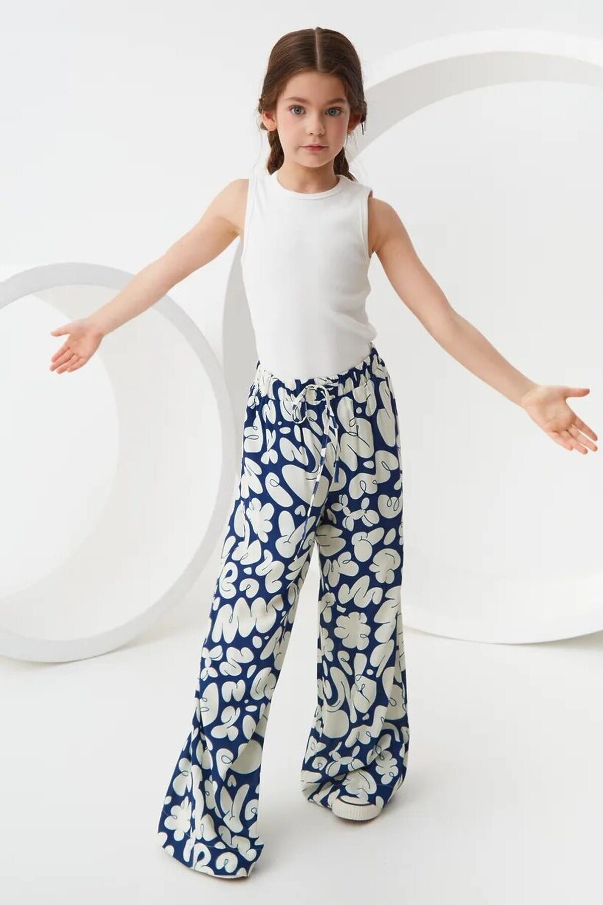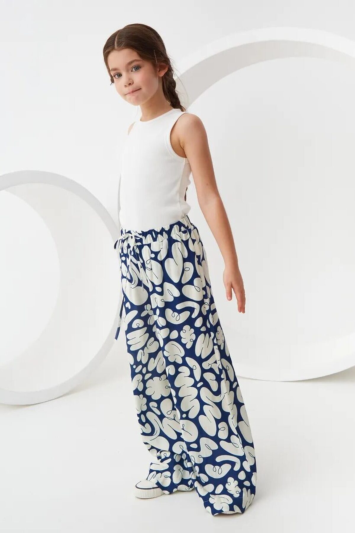 Широкие брюки из легкой струящейся ткани из 100% вискозы. Приятная на ощупь ткань не потеряет своего первоначального вида после множества стирок. Ткань хорошо пропускает воздух и не закатывается. Расслабленный силуэт с комфортной средней посадкой талии. Эластичный пояс с кулиской. Прорезные карманы в боковых швах и брючины полной длины. Размерный ряд 128 – 176 см.