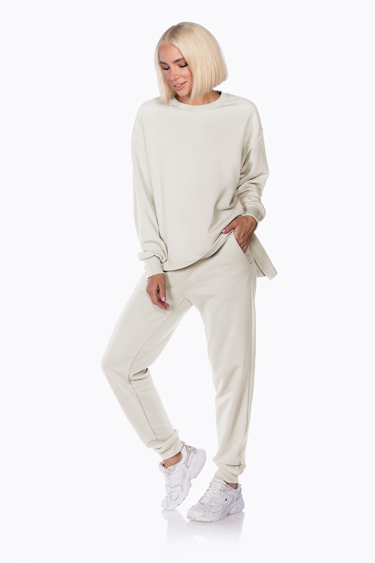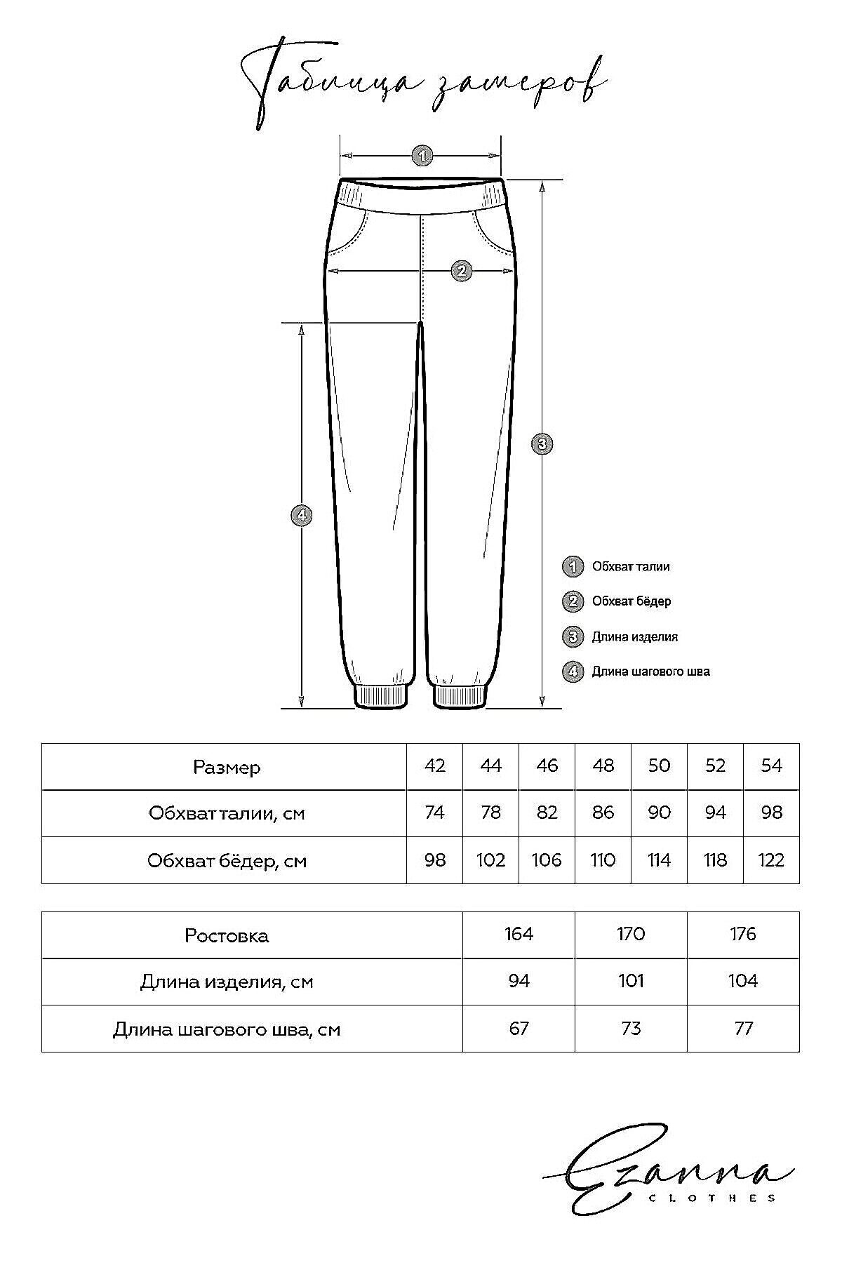 Базовые брюки с классической универсальной посадкой. Пояс на резинке с двойной отстрочкой и с манжетами на брючинах. Удобные боковые карманы.