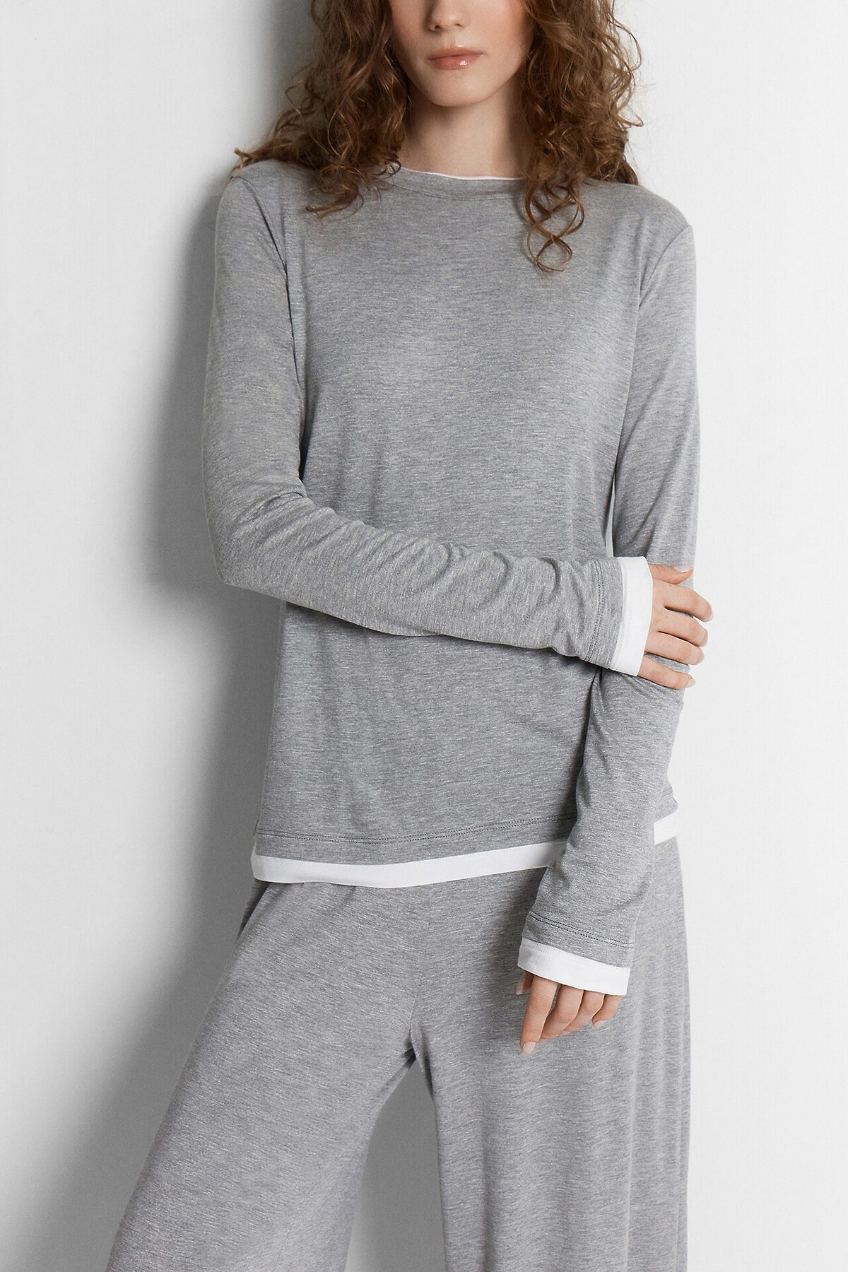 Комплект состоит из джемпера и брюк. Джемпер полуприлегающего силуэта. Горловина круглой формы обработана обтачкой из основного полотна, с имитацией двойной обтачки. Рукава втачные длинные. По низу рукава и джемпера отрезная деталь имитация поддетого джемпера. Брюки прямые свободные. Посадка средняя. Пояс цельнокроеный с эластичной тесьмой внутри (внутр 20мм 20RV). Нижний срез обработан швом вподгибку.