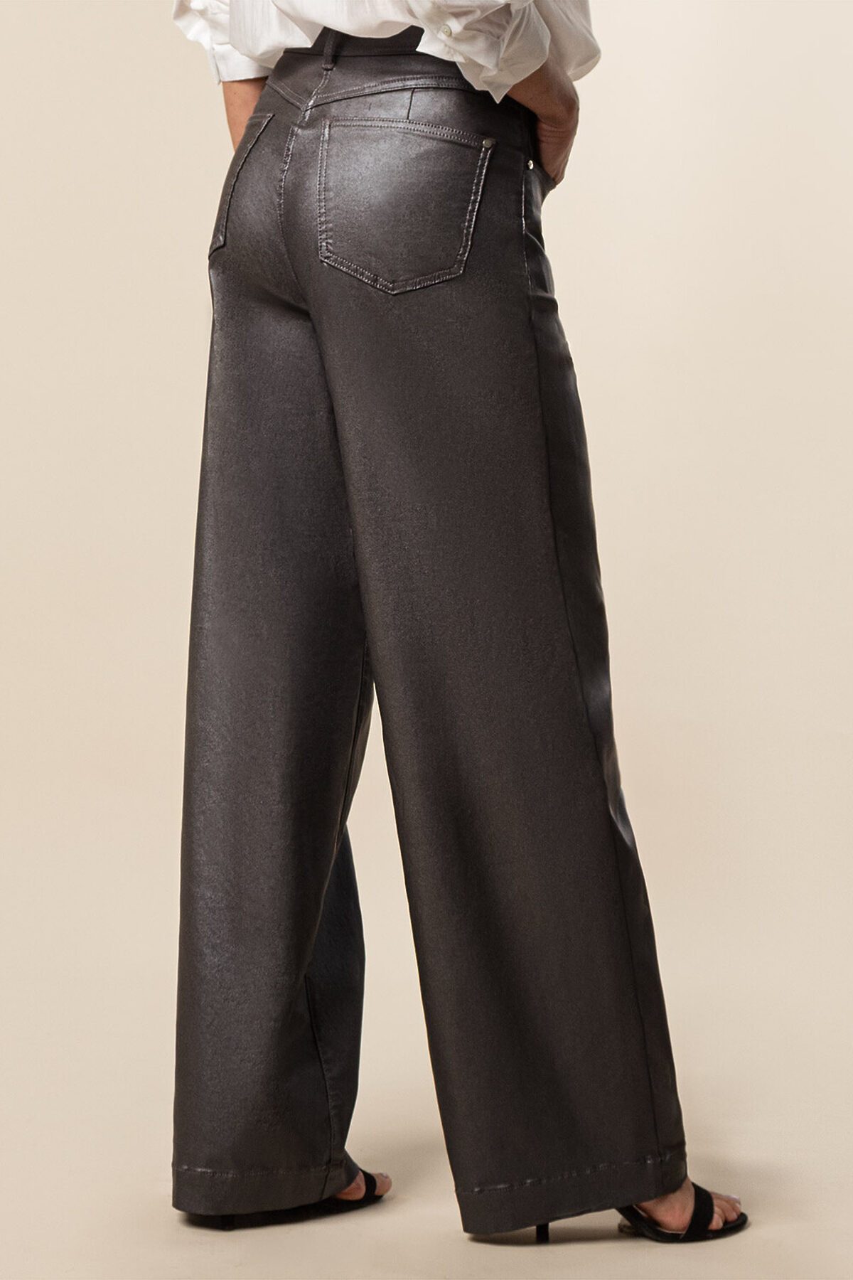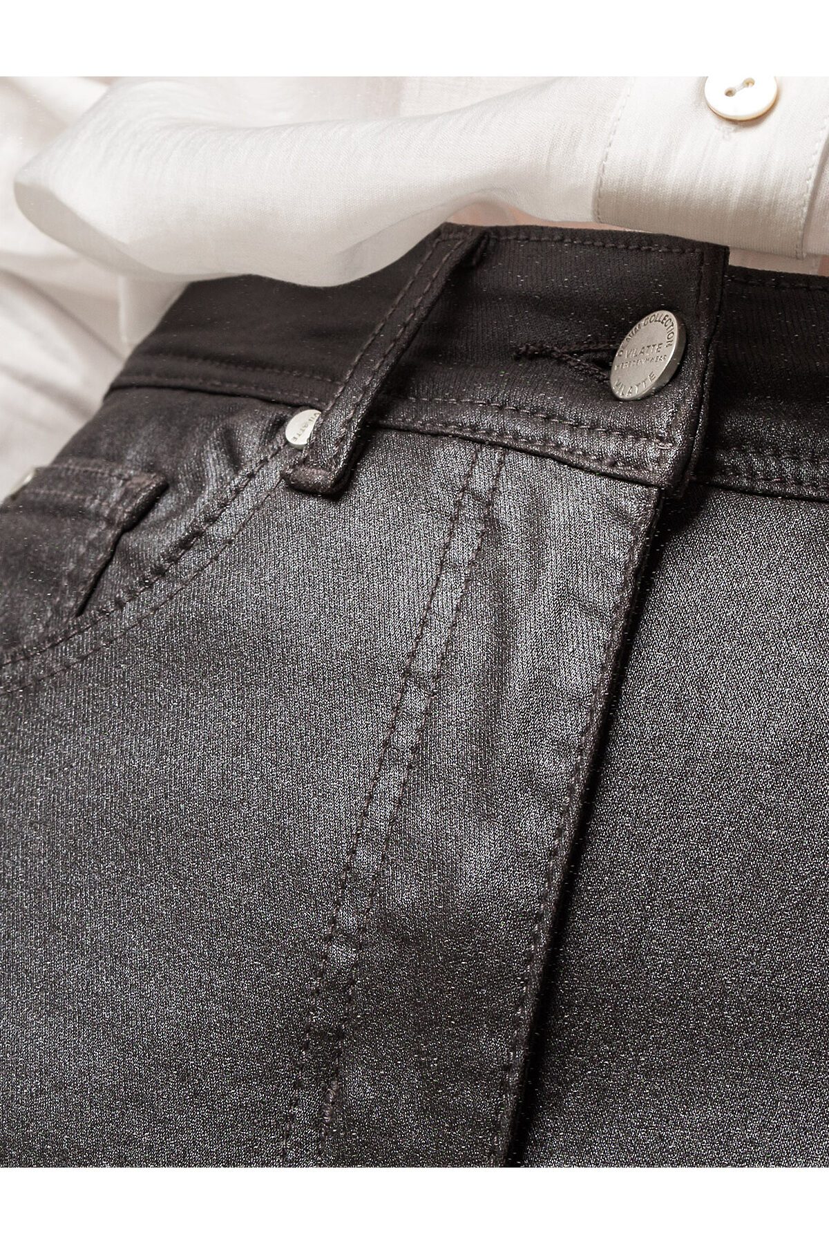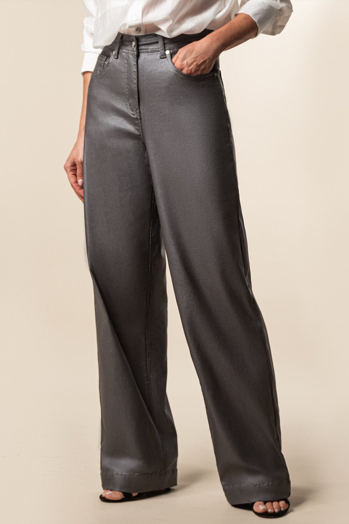 Брюки свободного кроя выполнены из эластичного хлопка с металлизированным покрытием под кожу. Материал отлично отталкивает влагу, защищает от ветра и за счет большого содержания хлопка, изделие поддерживает оптимальный микроклимат. Внутренняя тканевая сторона мягкая и очень комфортная к телу. Трендовая модель с мягким сияющим эффектом будет сочетаться с любым верхом и впишется не только в праздничный образ, но и в повседневный гардероб.