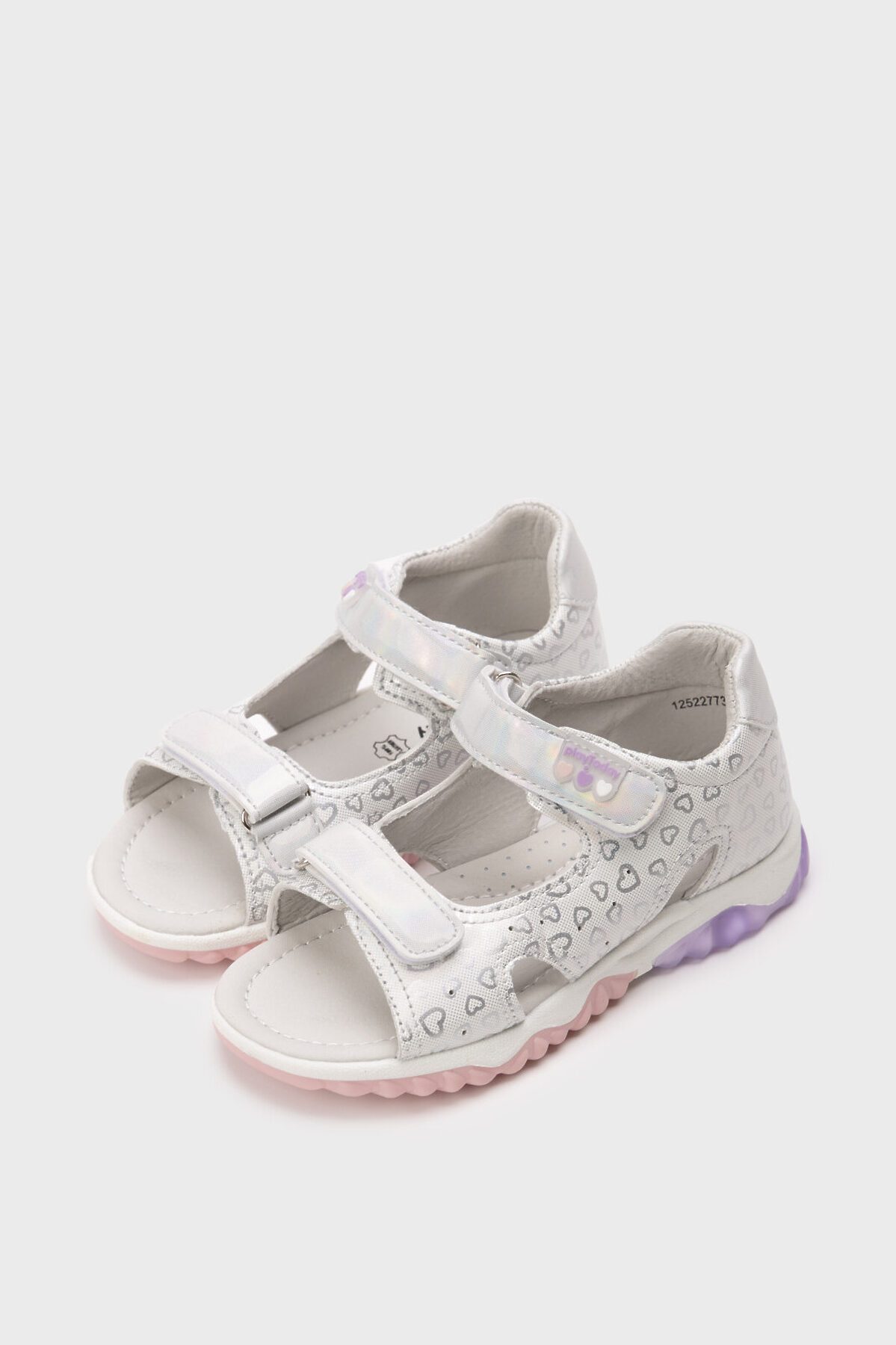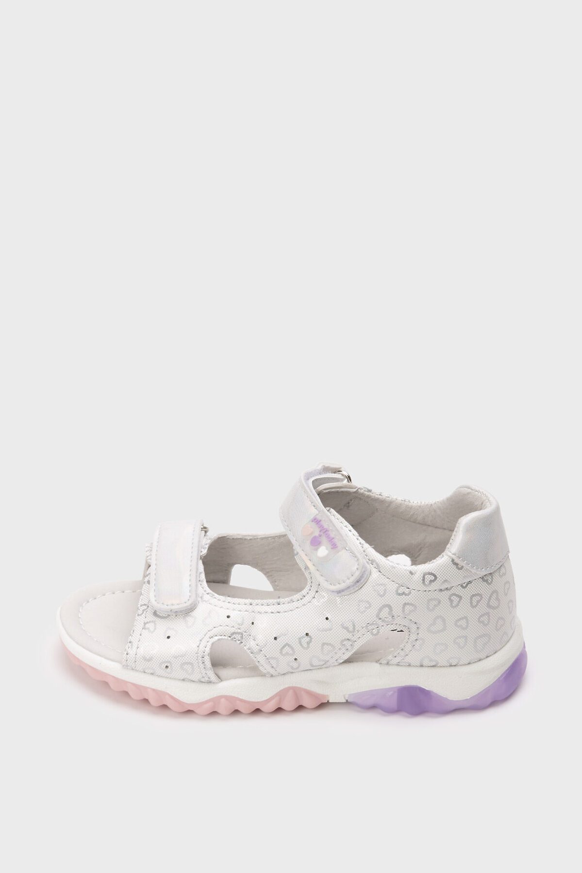 Сандалии детские для девочки. Сандалии с закрытой пяткой выполнены из перламутровой искусственной кожи. Удобные ремни с липучками позволяют регулировать обувь на любой подъем. Подкладка и стелька выполнены из натуральной свиной кожи. Стелька имеет анатомический элемент для поддержания свода стопы в правильном положении. Подошва из ТПР очень гибкая. Подошва с мигающим элементом flashlight.