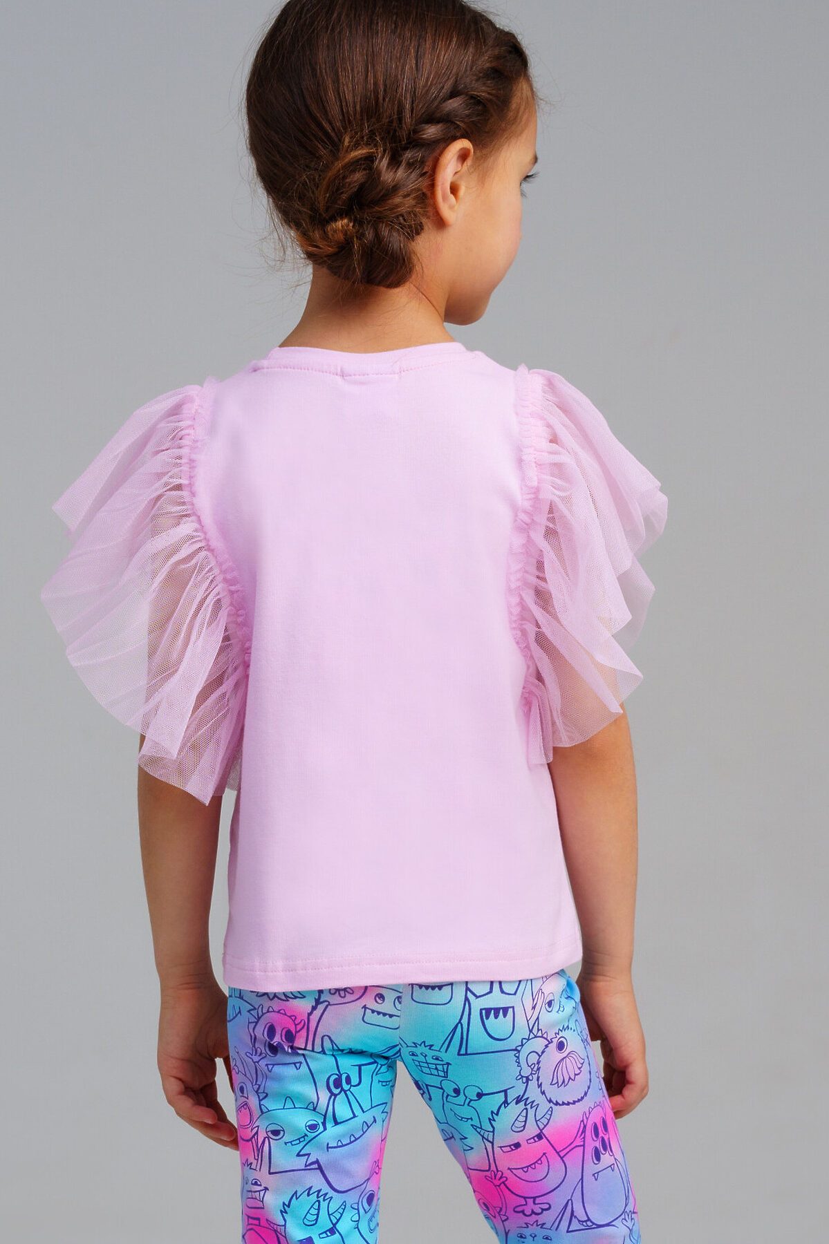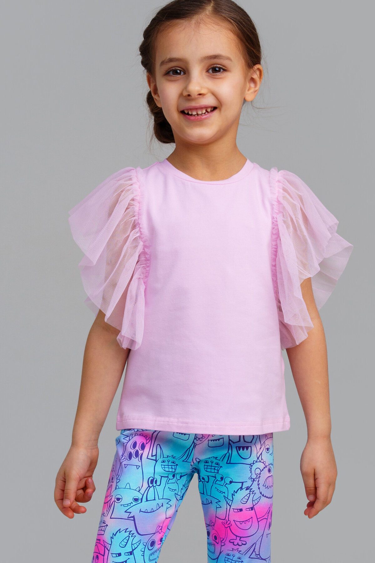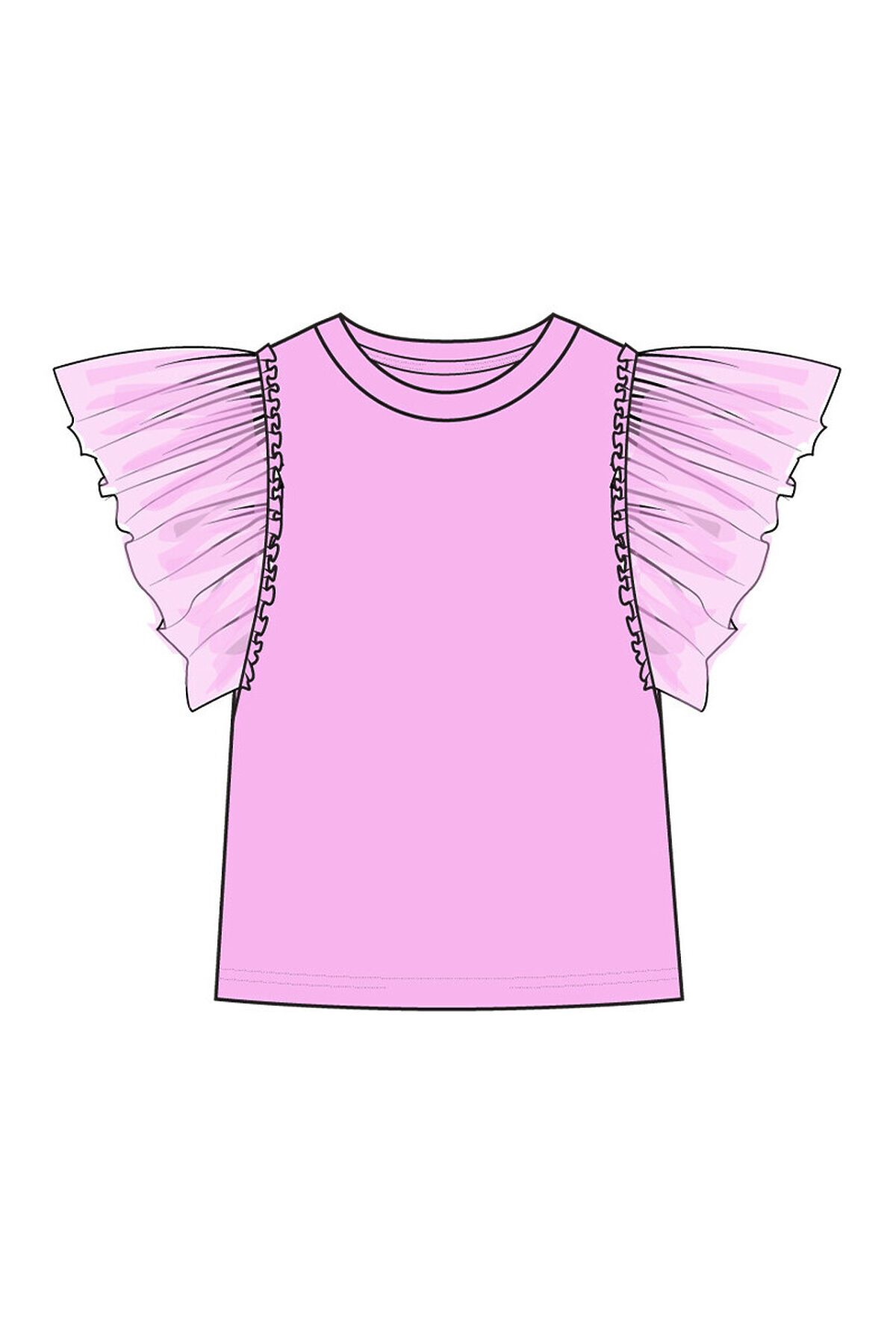 Футболка детская для девочки. Футболка с высоким содержанием хлопка 95%. Благодаря наличию эластана в составе ткани изделие проще в уходе и держит форму. Рукава-крылышки из сетки. Модель выполнена из качественного и приятного на ощупь трикотажа.