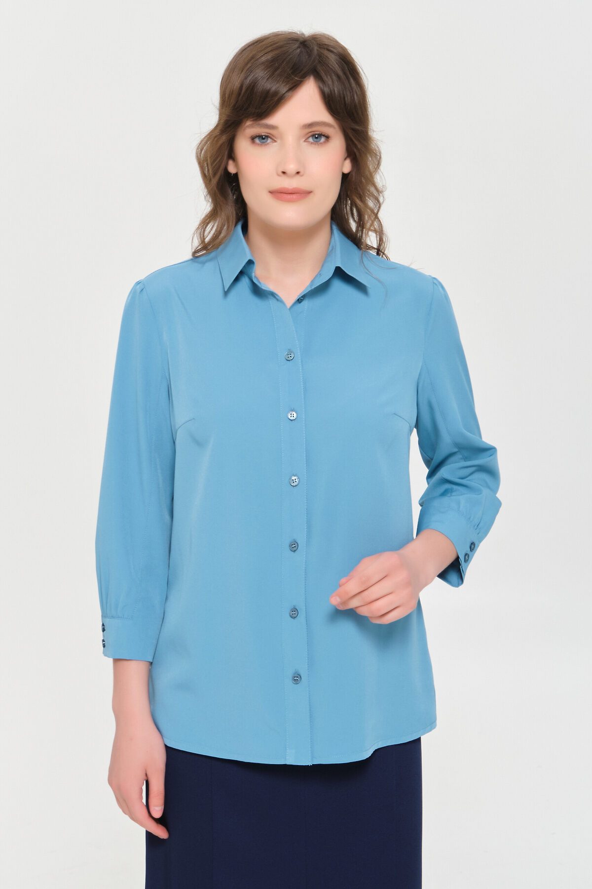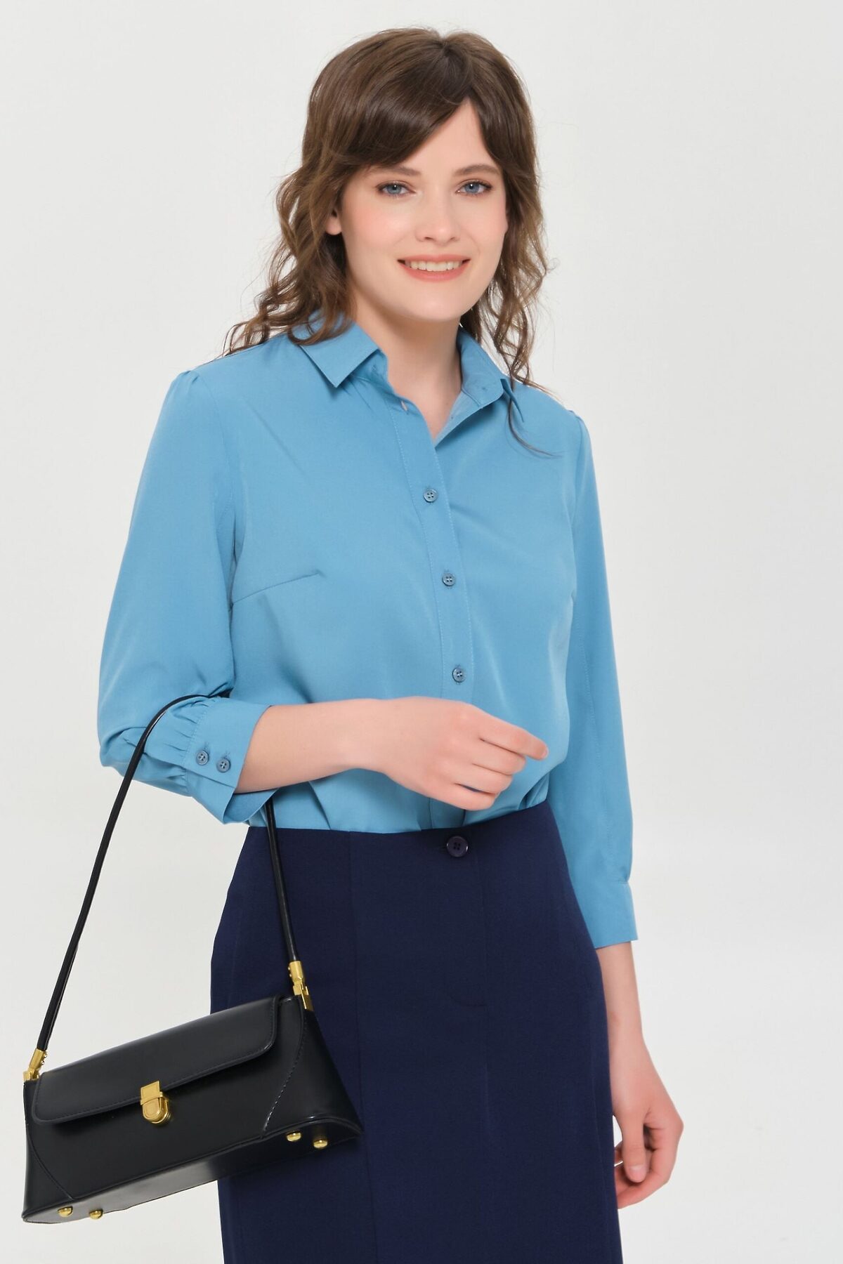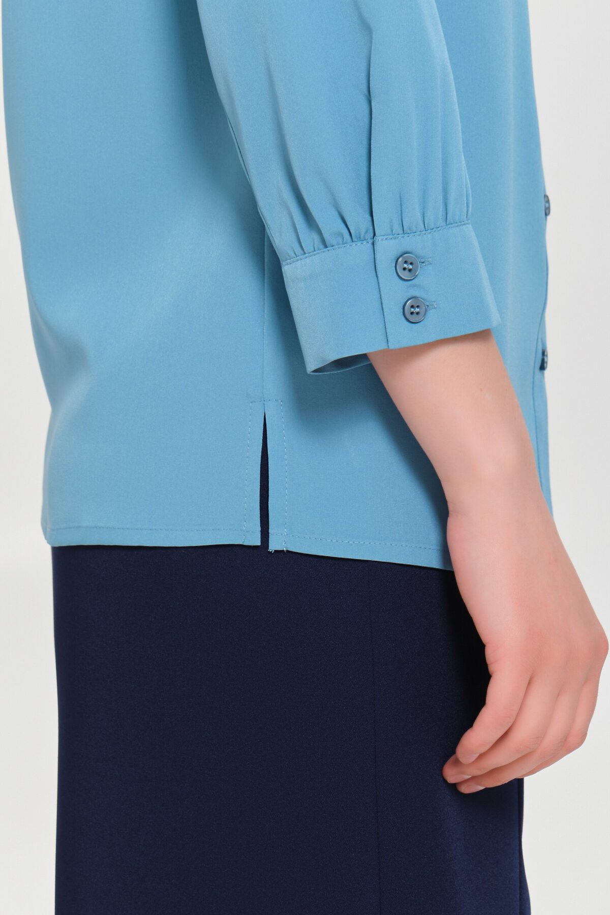 Блузка с оригинальным кроем рукава. Модель прямого силуэта. Спереди планка с застёжкой на петли и пуговицы. Спинка с двухслойной кокеткой, под кокеткой сборка. Рукав с небольшой сборкой по окату и низу, застегивается на 2 петли и пуговицы. Воротник сорочечный. В боковых швах декоративные разрезы.