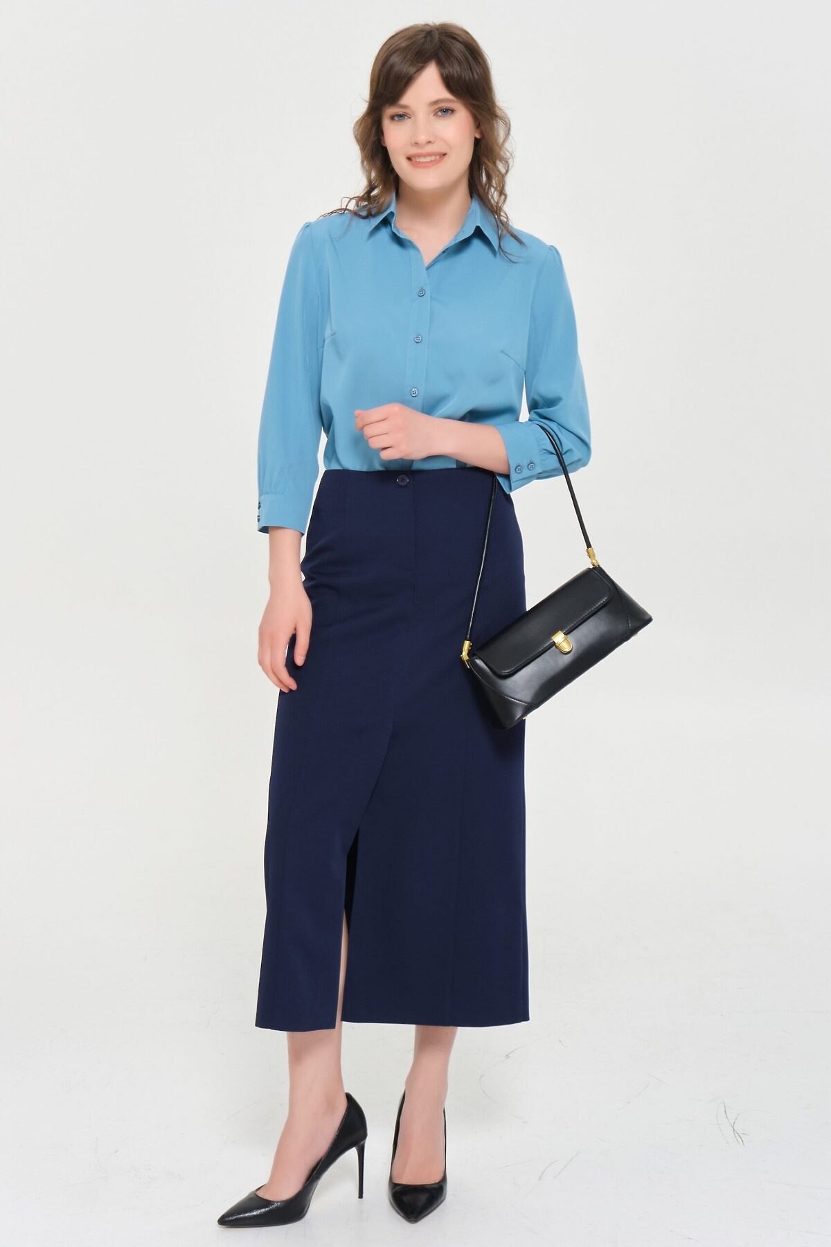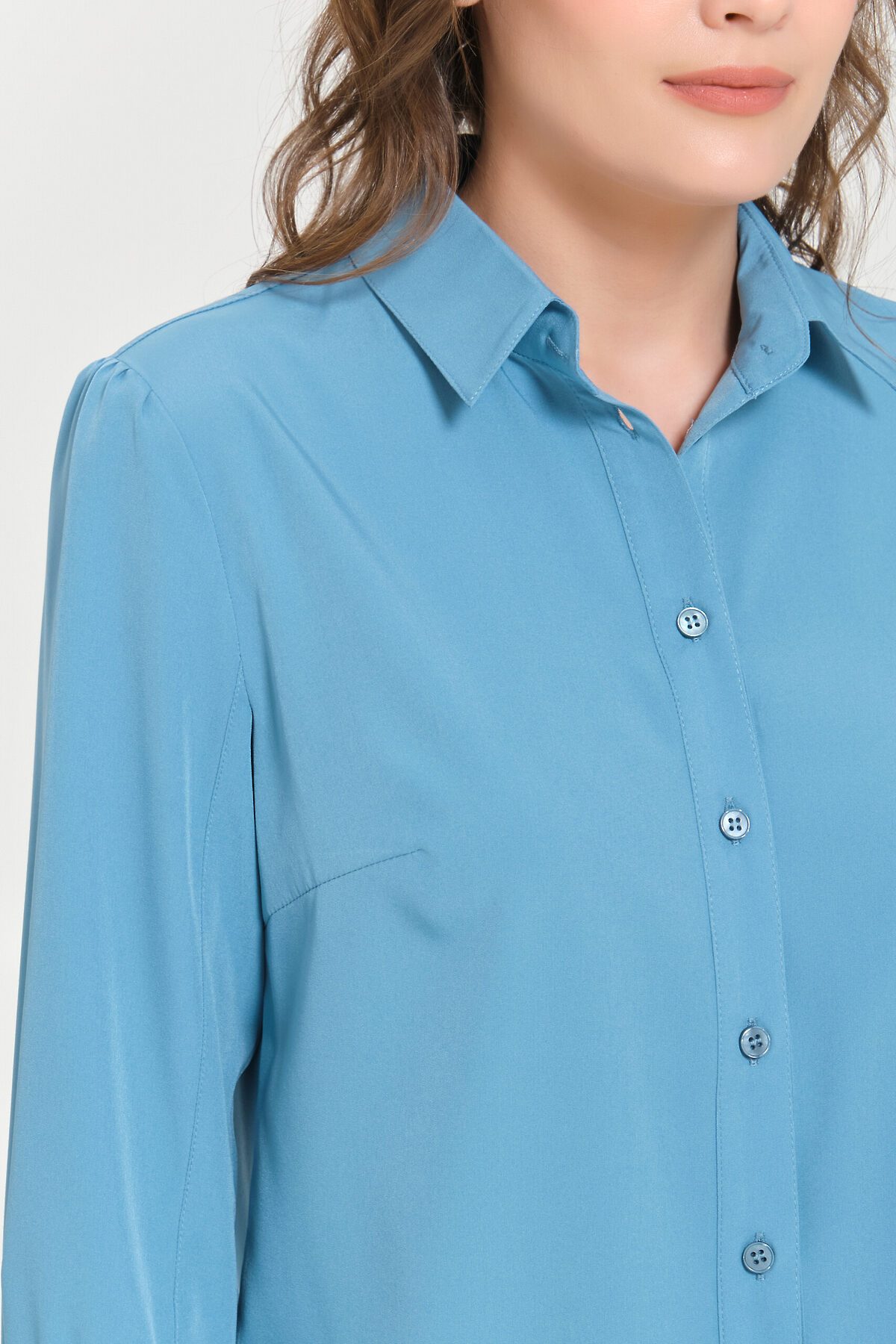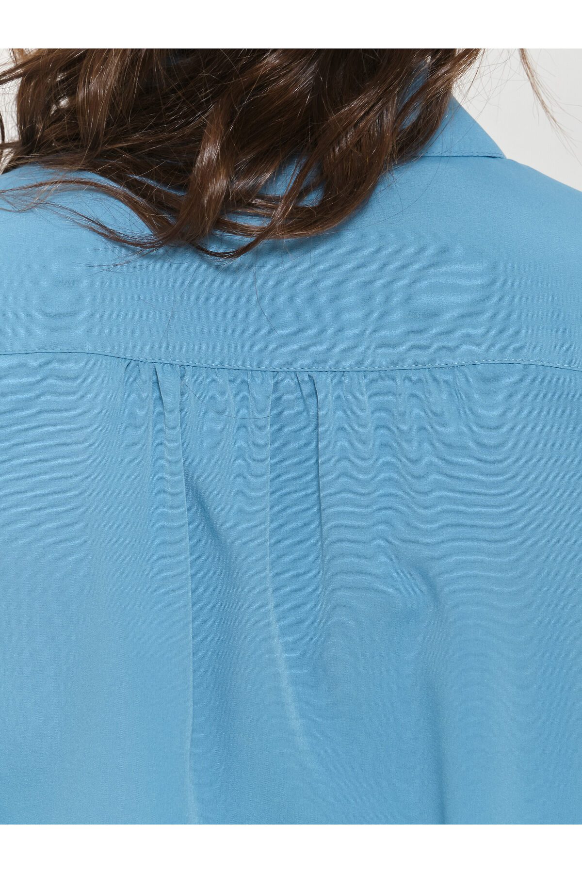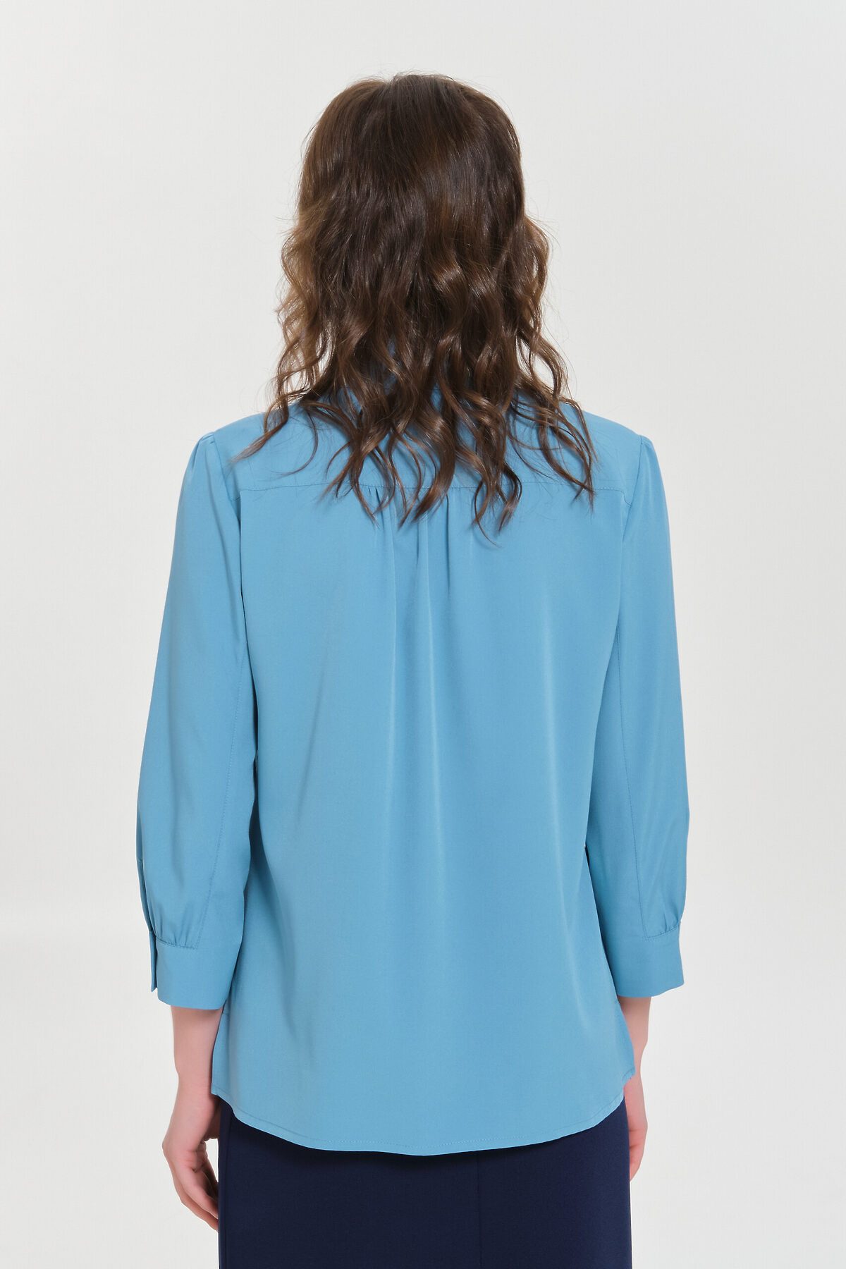 Блузка с оригинальным кроем рукава. Модель прямого силуэта. Спереди планка с застёжкой на петли и пуговицы. Спинка с двухслойной кокеткой, под кокеткой сборка. Рукав с небольшой сборкой по окату и низу, застегивается на 2 петли и пуговицы. Воротник сорочечный. В боковых швах декоративные разрезы.