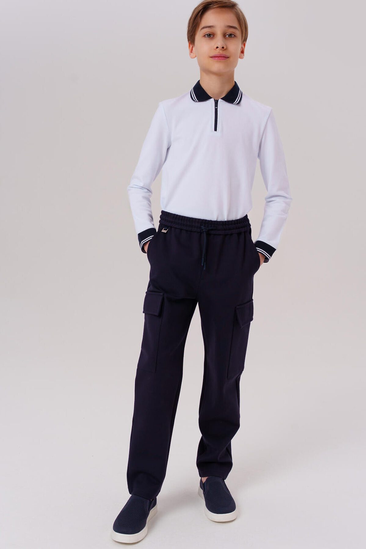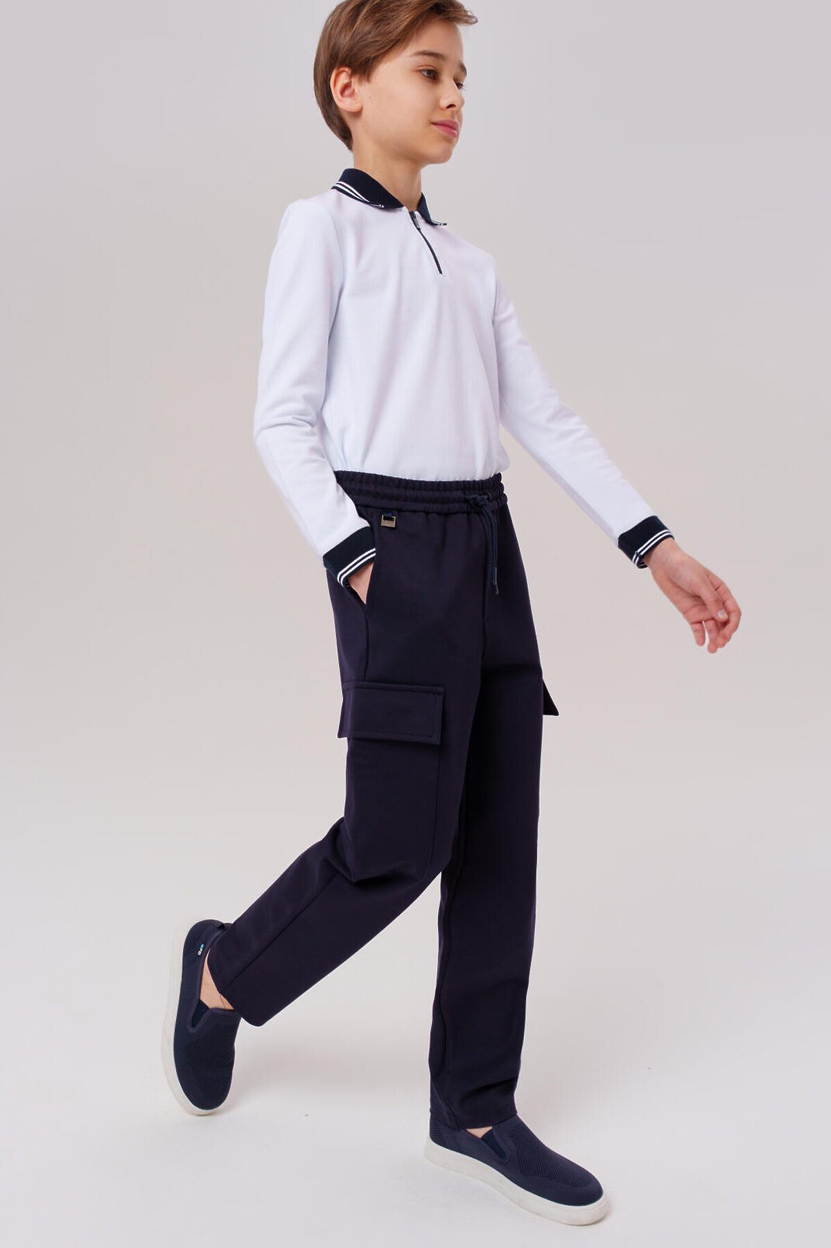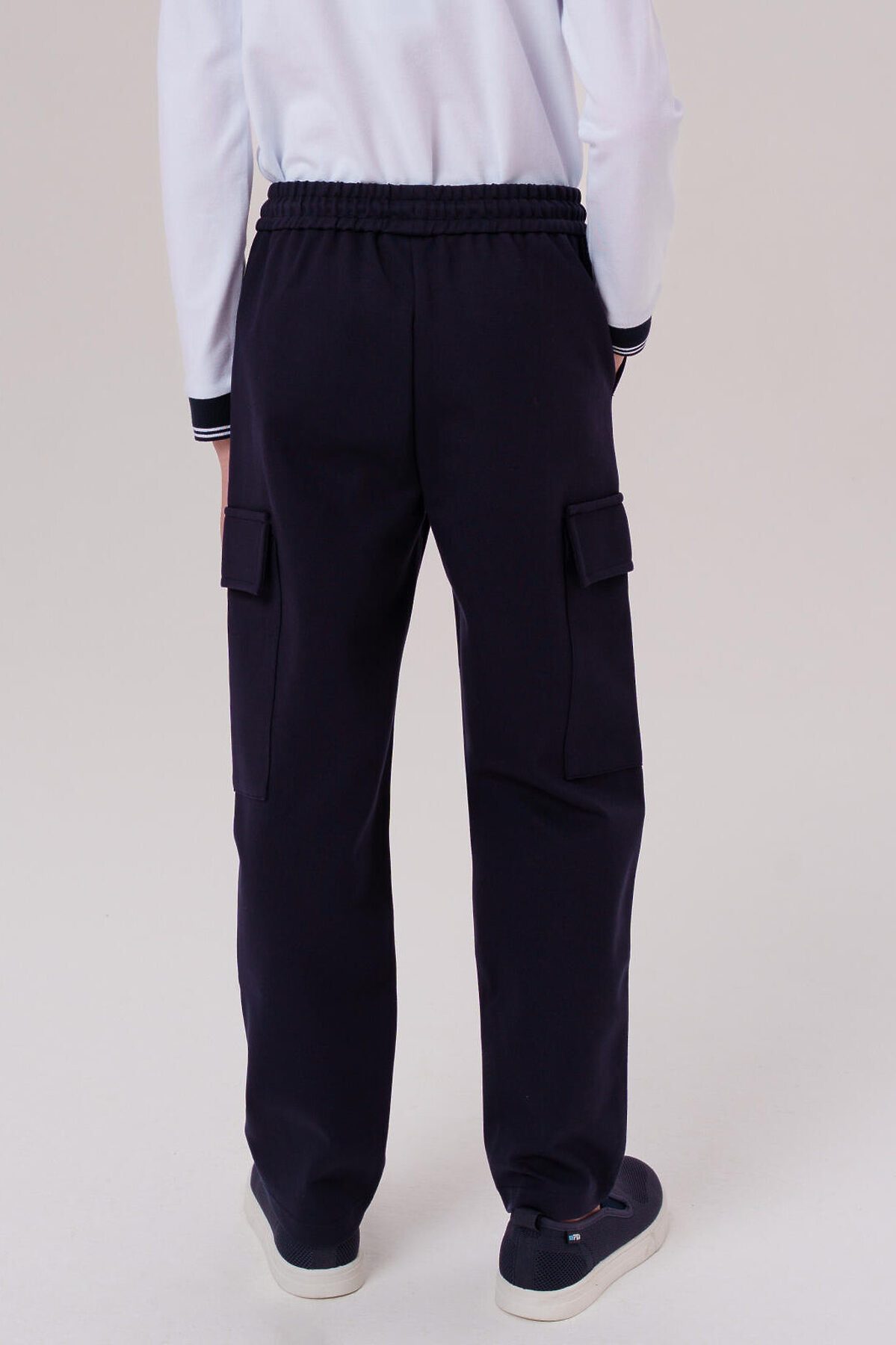 Классические трикотажные тёмно-синие школьные брюки для мальчика подростка от PlayToday — универсальный вариант для школы, который сочетает комфорт, аккуратный вид и свободу движений. Преимущества модели: + мягкий трикотаж с вискозой + классическая посадка regular fit + эластичный пояс на резинке со шнурком + четыре кармана — два спереди и два накладных сзади + универсальный темно-синий цвет + легкий уход Эти синие подростковые брюки для школы выполнены из мягкого трикотажного полотна с высоким содержанием вискозы — материал дарит комфорт даже в течение всего учебного дня. Эластан в составе делает ткань более эластичной: эти классические детские штаны отлично держат форму, не вытягиваются и не деформируются после стирки. Практичный тёмно-синий цвет и аккуратный крой делают модель подходящей как для школьной формы, так и для повседневной носки. Продуманные детали — шнурок, пояс-резинка, карманы — добавляют функциональности и удобства. Совет по стилю: сочетайте эти стильные брюки для школы для мальчиков с белой рубашкой и жилетом от PlayToday — получится строгий образ для школьных мероприятий. А в будни — с футболкой или свитшотом для максимального комфорта.