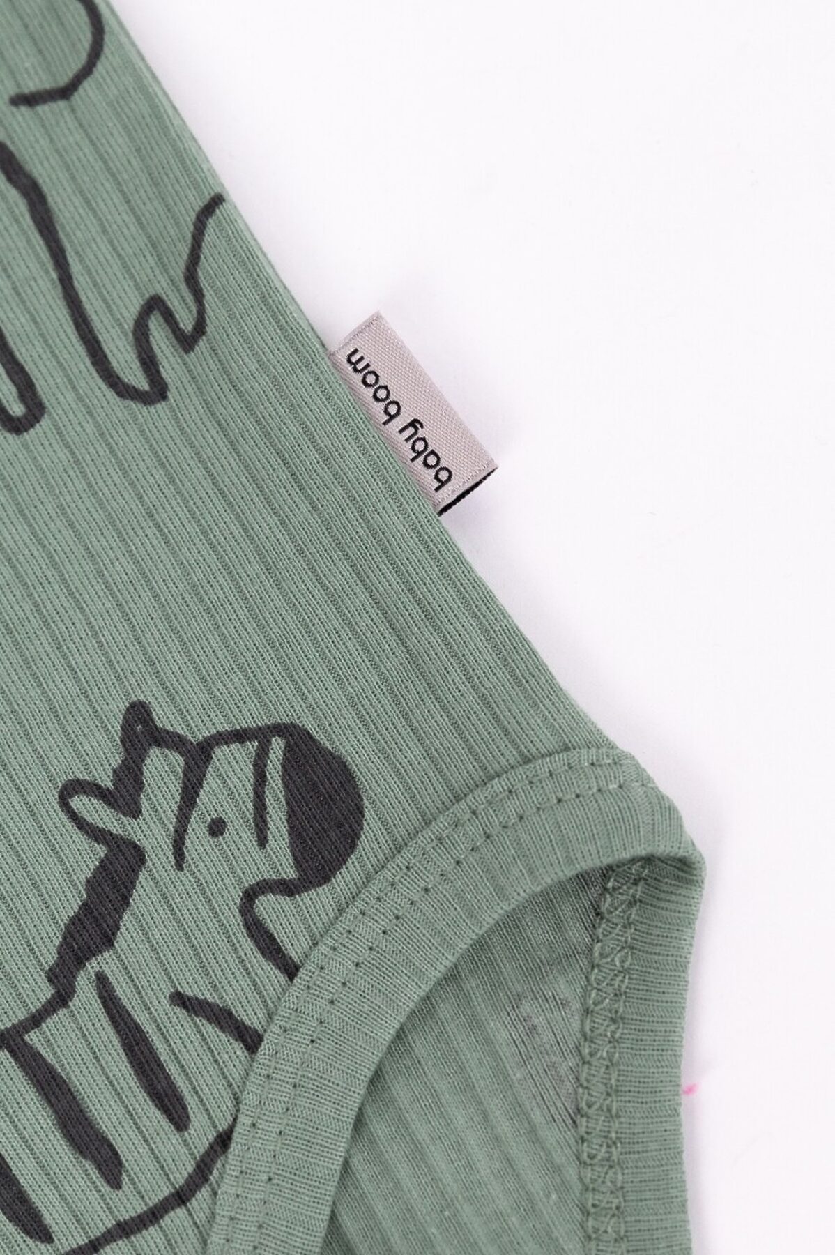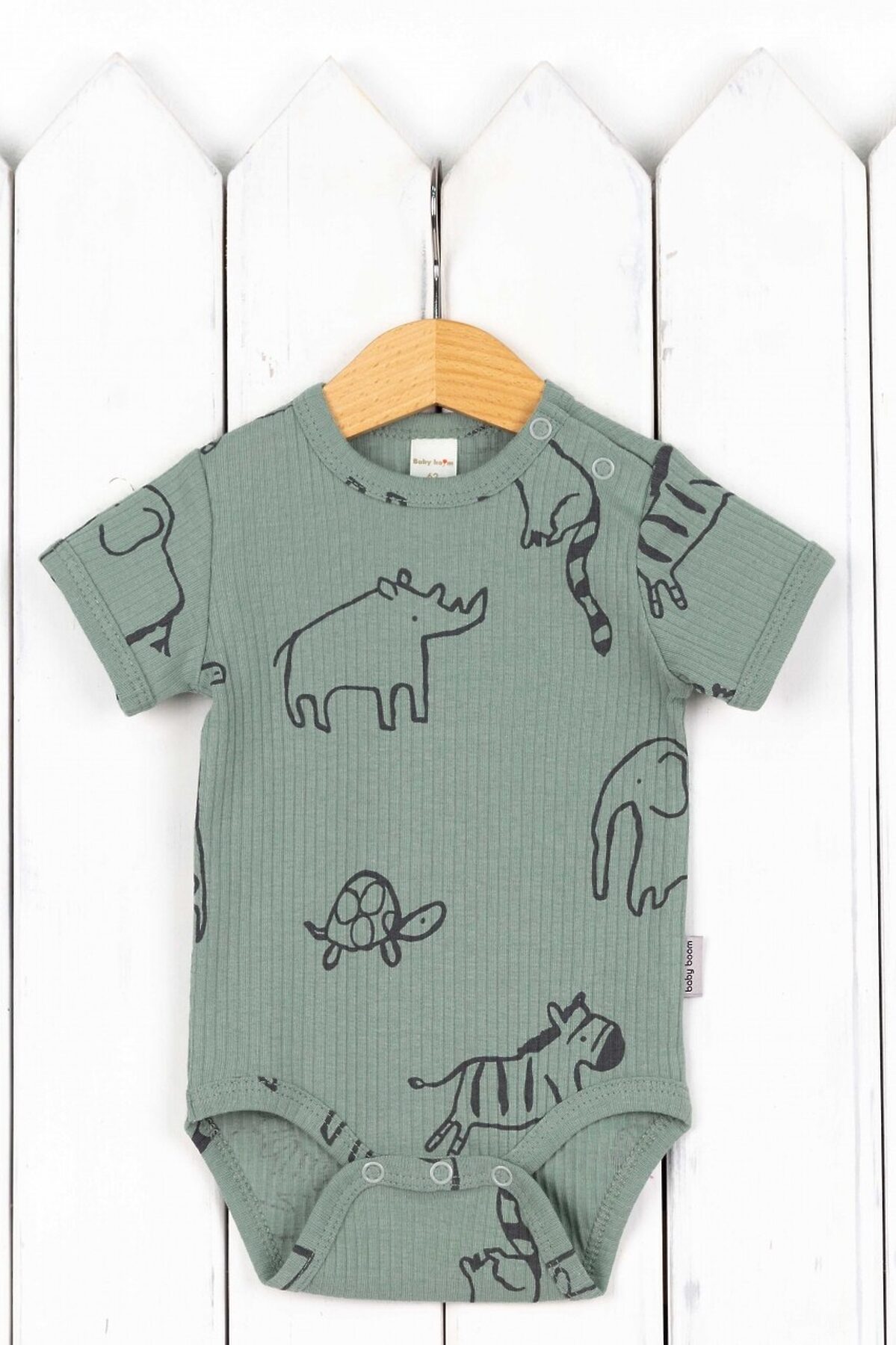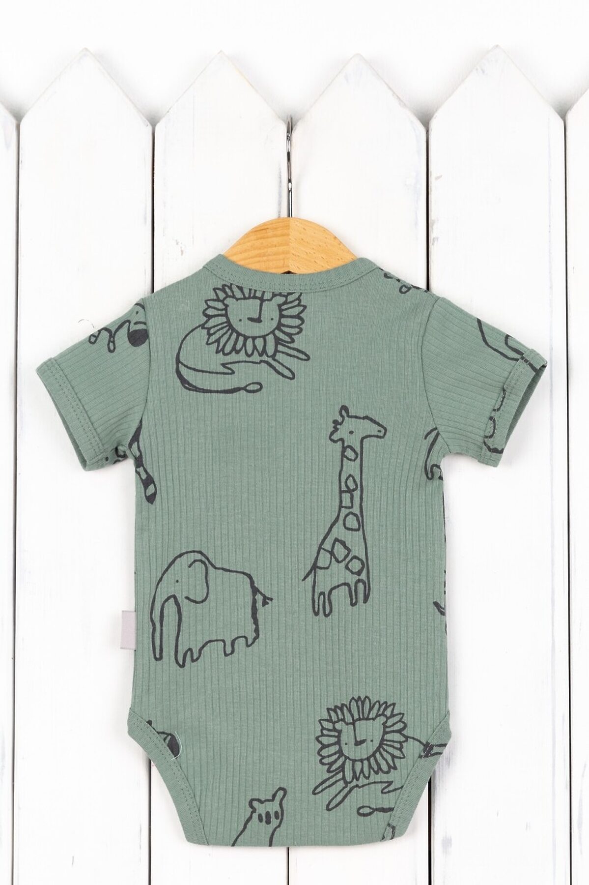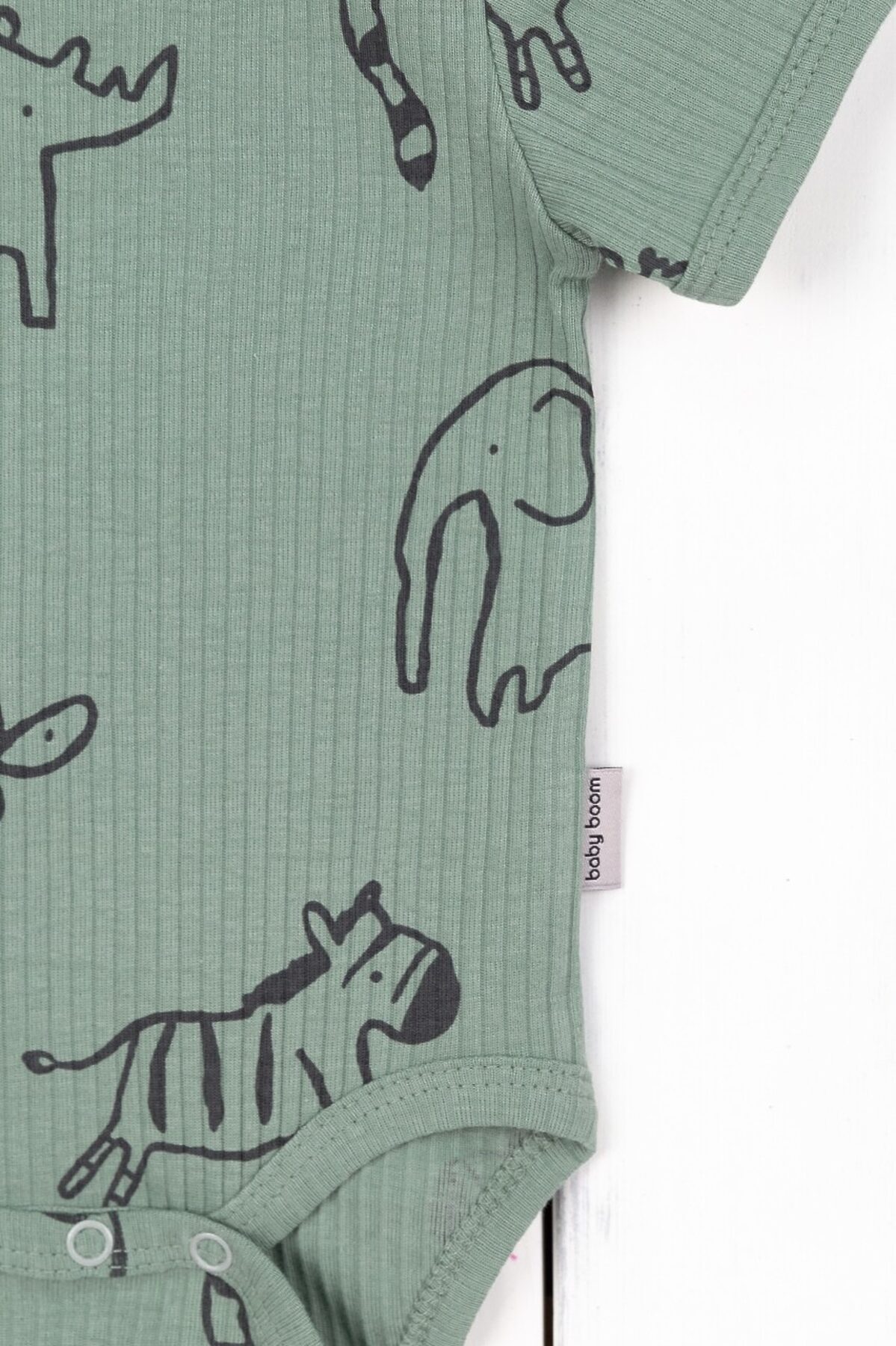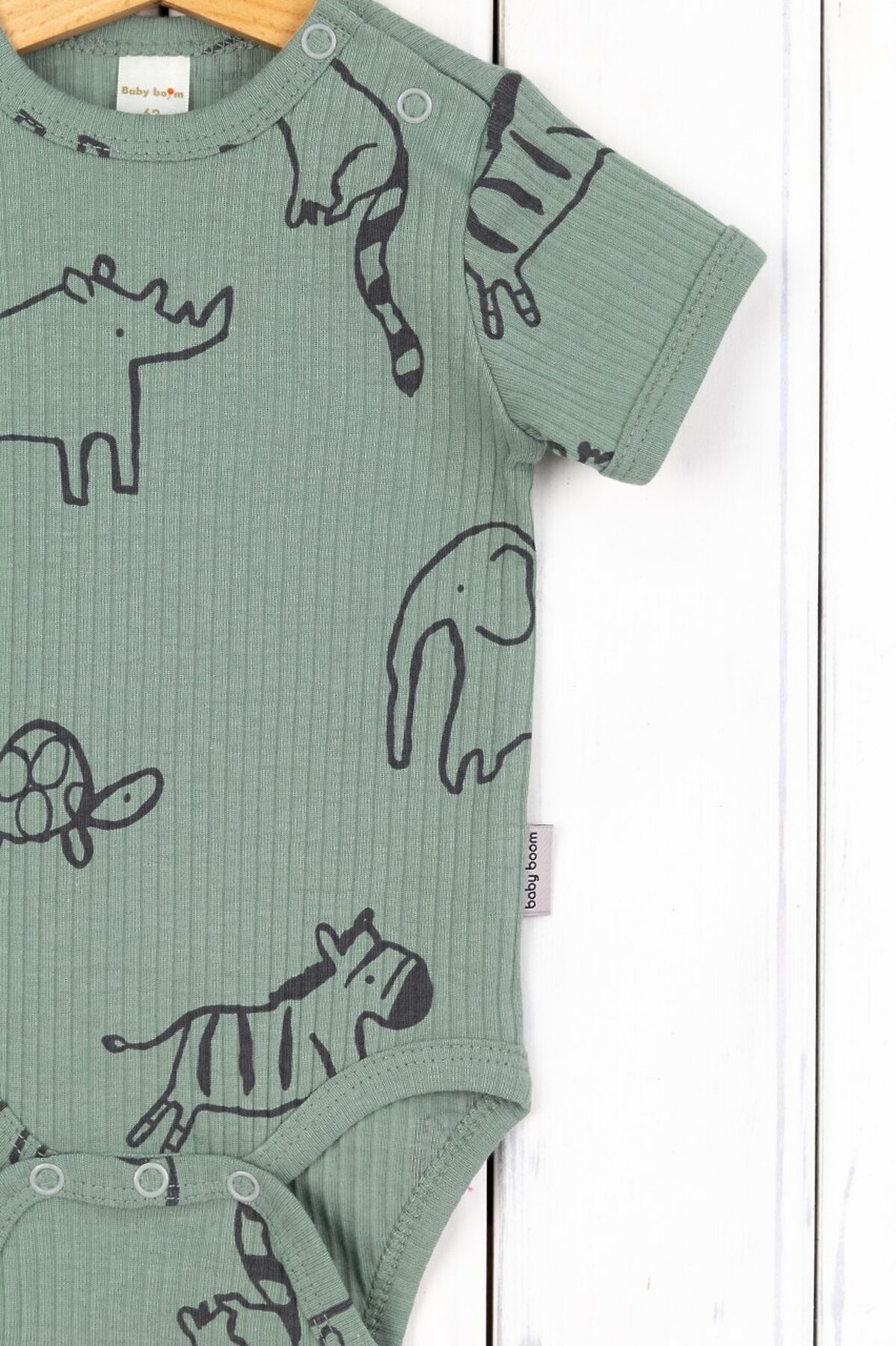 Боди с коротким рукавом из набивного кашкорсе "лапша" (100% хлопок). Застежка на кнопках по плечу и по низу изделия.