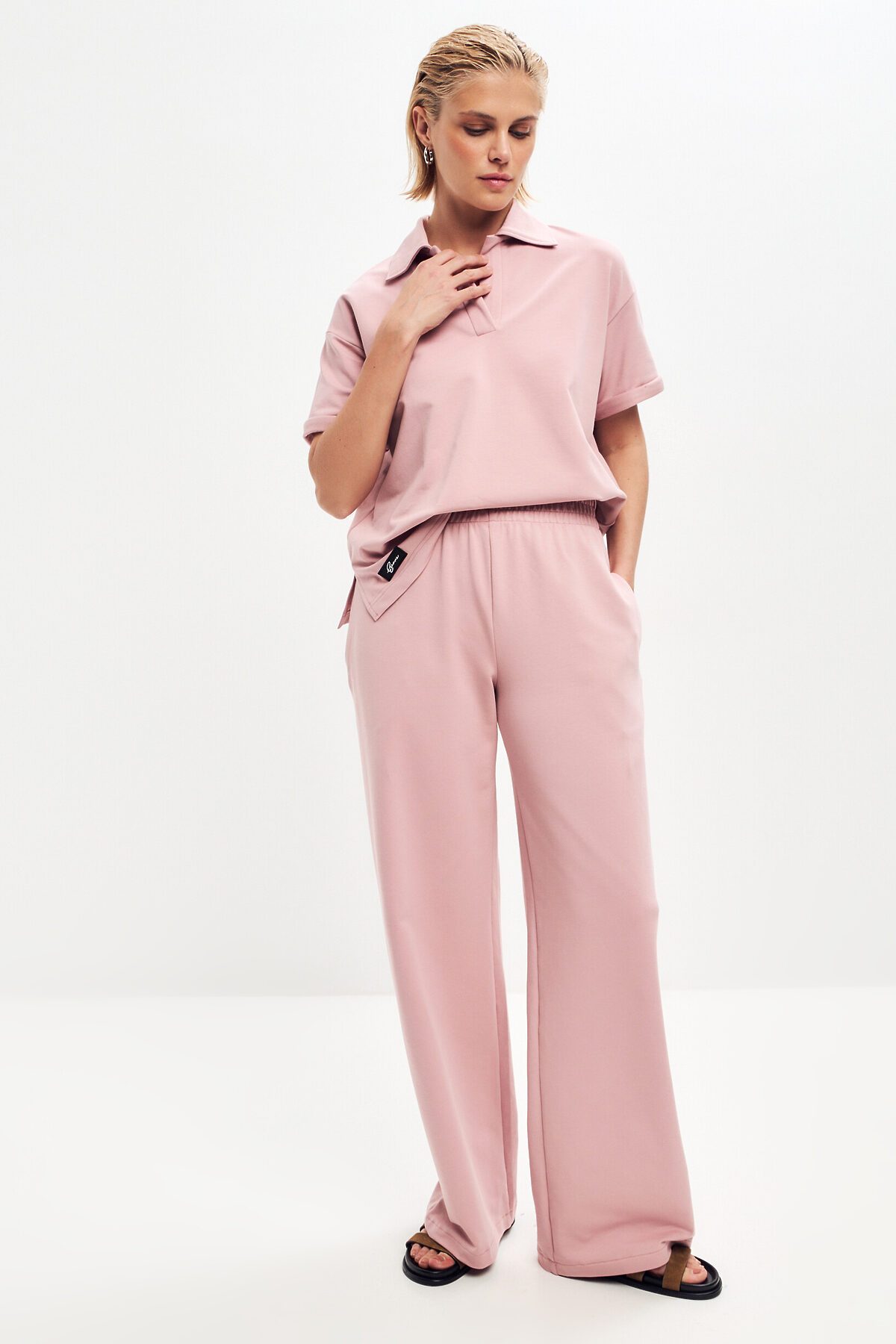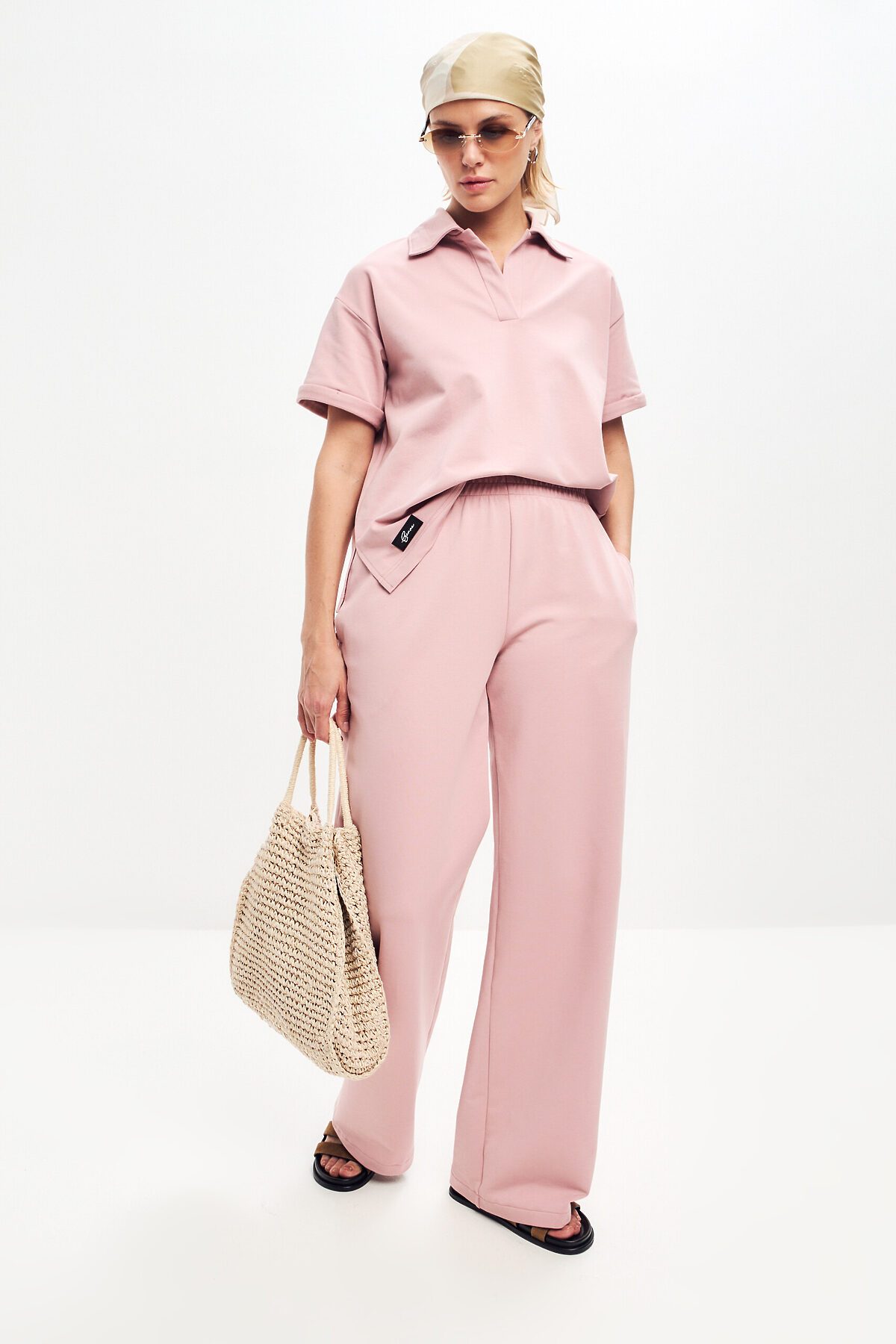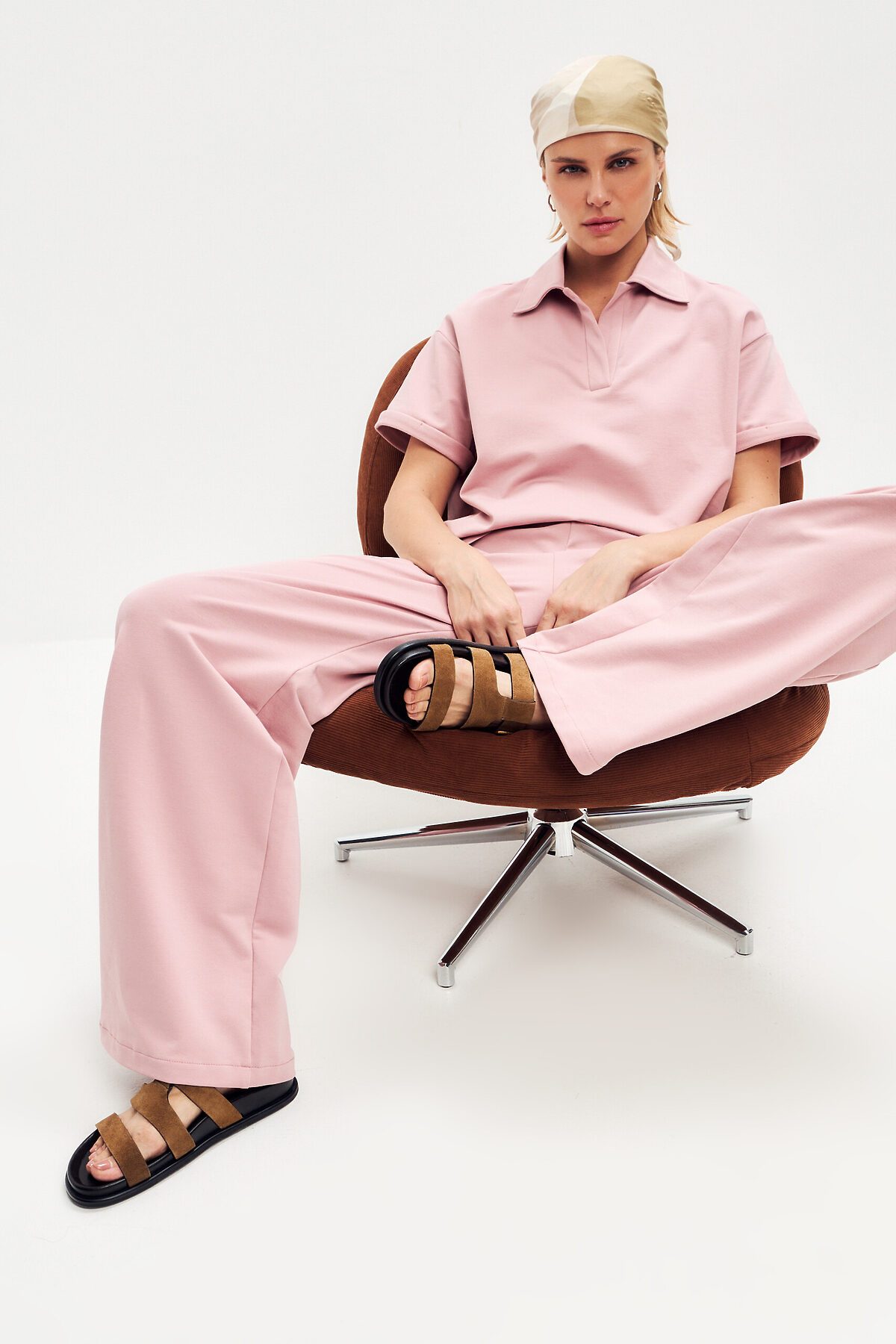 Тренд сезона - широкие брюки на высокой талии с футболкой оверсайз. Поло свободного кроя, с отложным воротником и боковыми разрезами. Короткий рукав с отворотами.