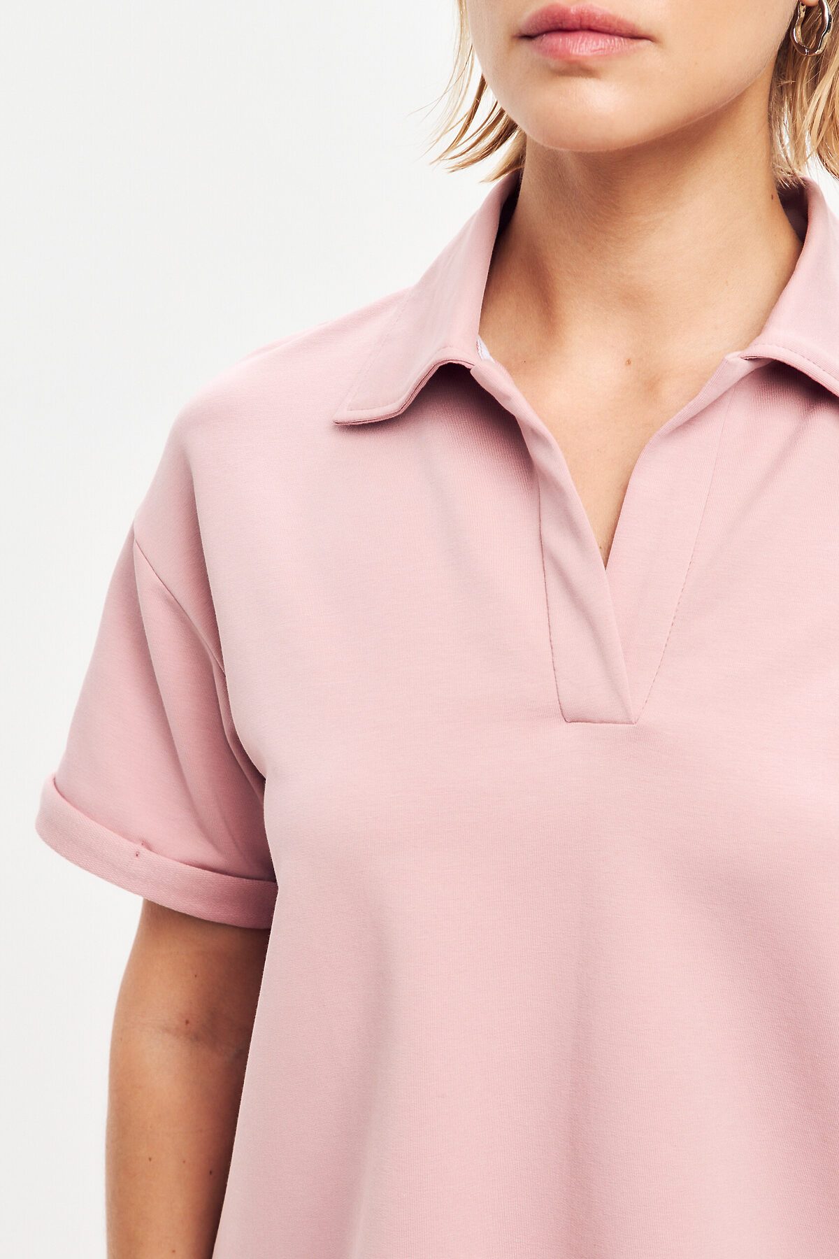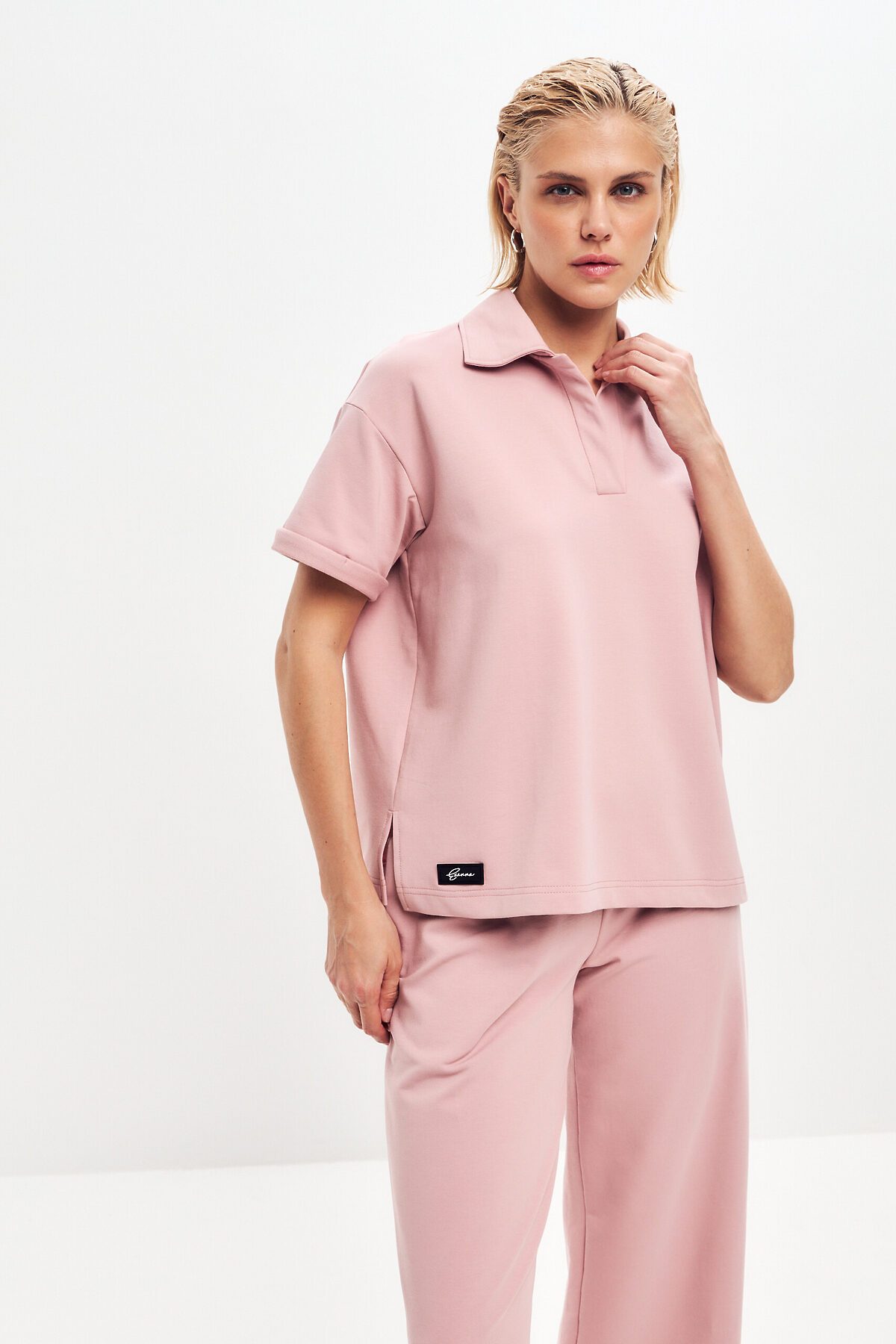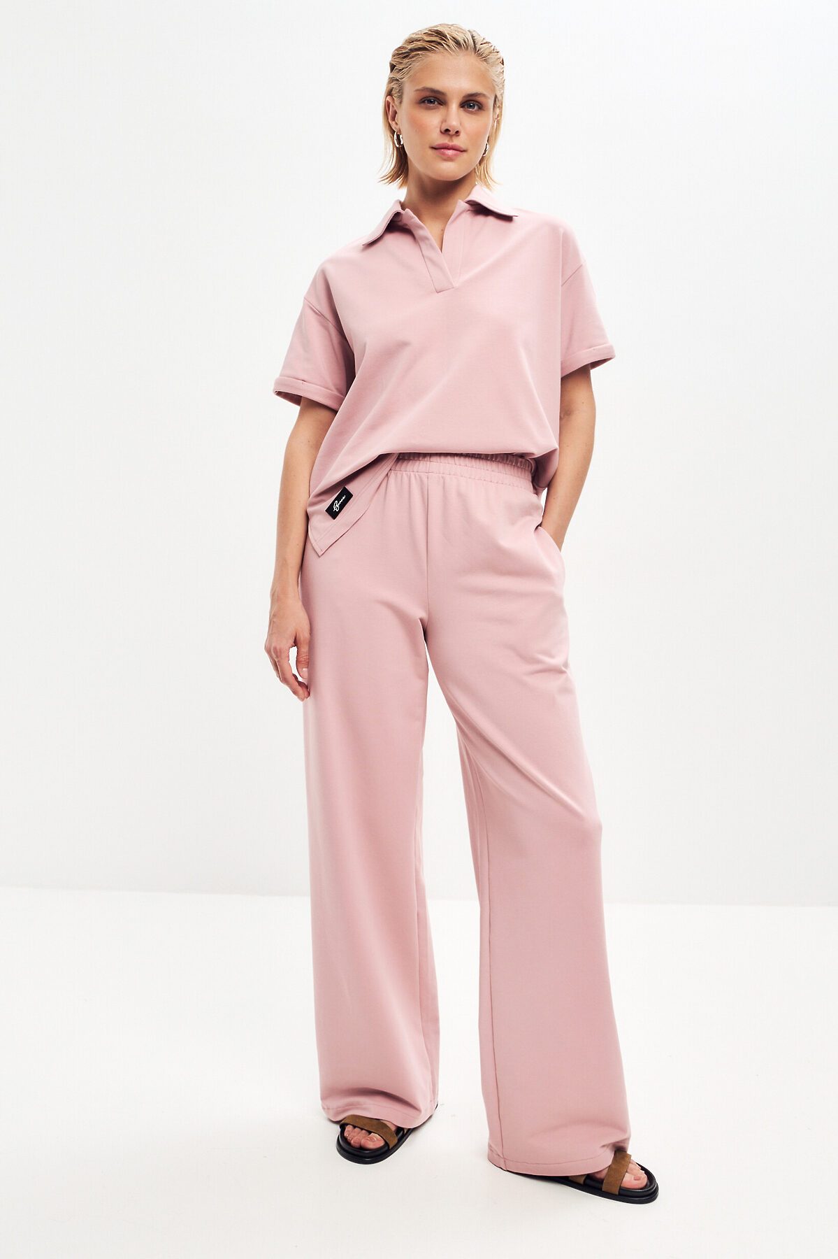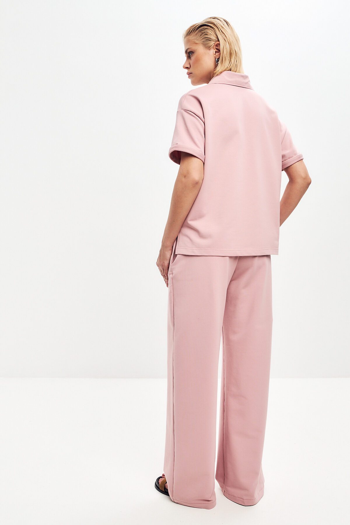 Тренд сезона - широкие брюки на высокой талии с футболкой оверсайз. Поло свободного кроя, с отложным воротником и боковыми разрезами. Короткий рукав с отворотами.