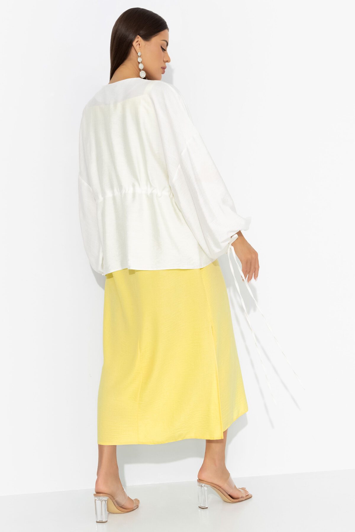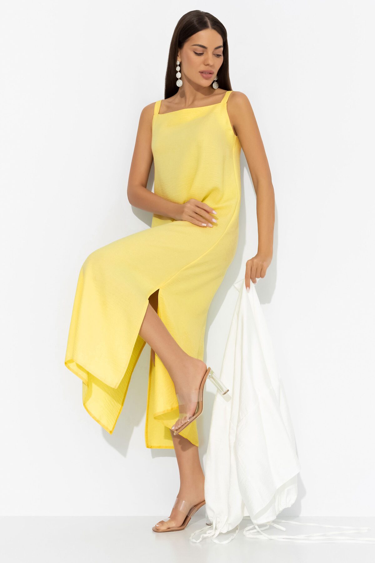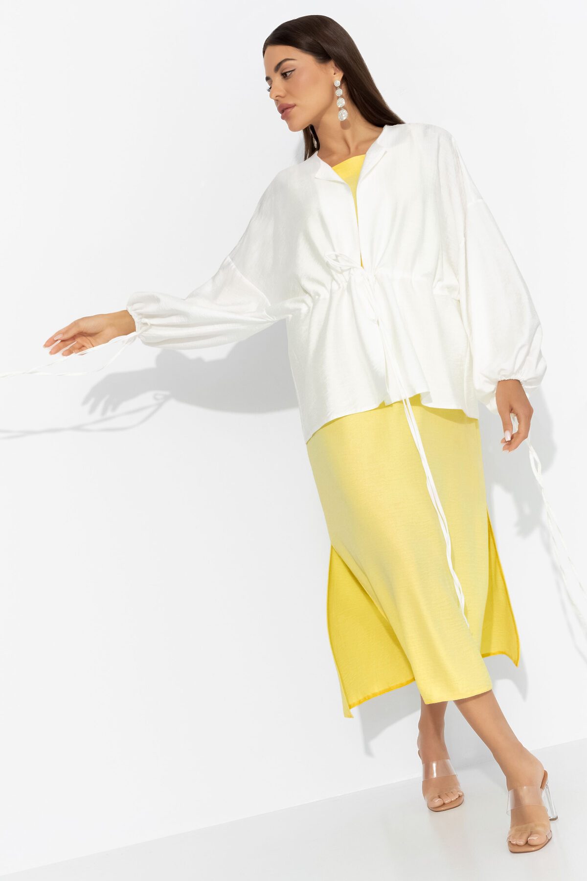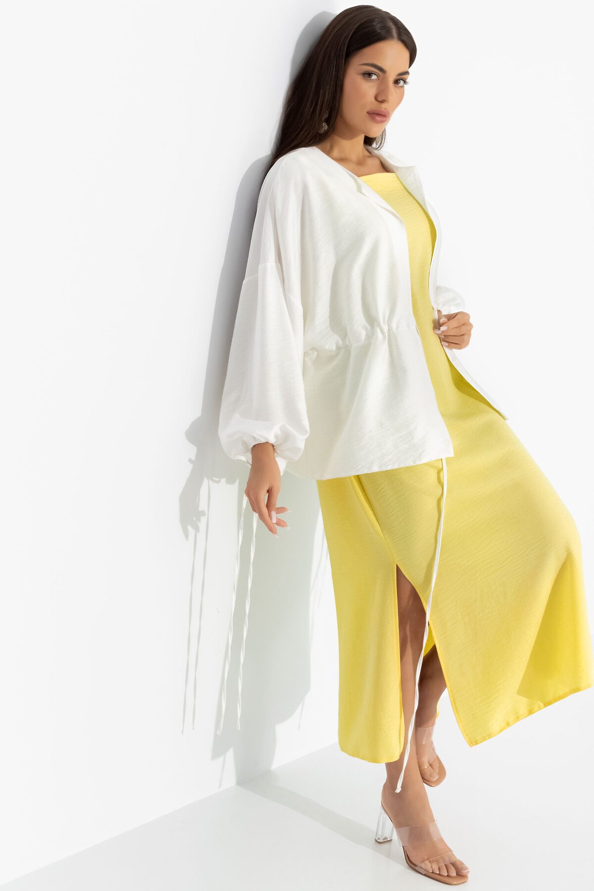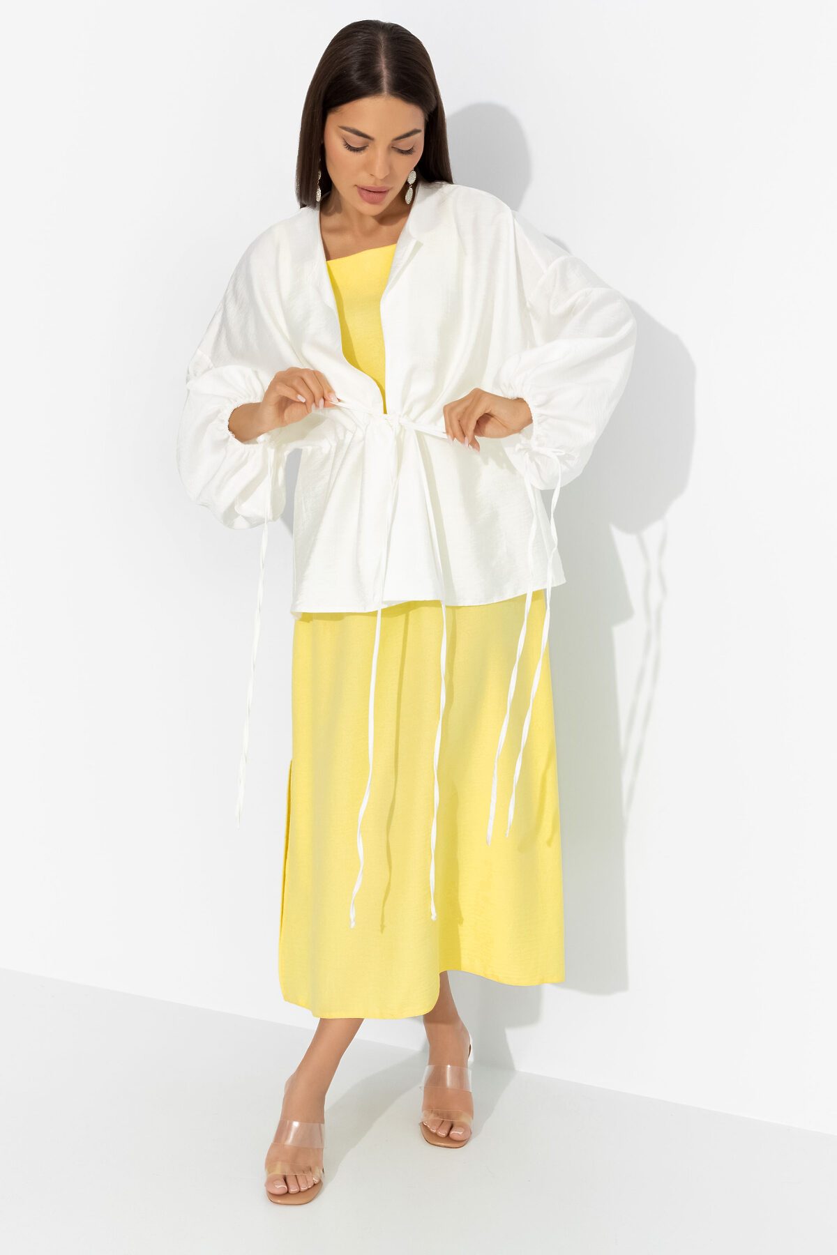 После нескольких умопомрачительных свиданий, которые он устроил для тебя, ты решила порадовать его фирменным лимонным пирогом со взбитыми сливками. В комплекте ЧАРУТТИ из сарафана в приглушенном лимонном и молочного кардигана, ты принесла пару кусочков ему на работу. Он был в восторге! От тебя. Комплект состоит из сарафана прямого силуэта в длине миди и рубашки расслабленного силуэта. Сарафан на тонких бретелях, с разрезами по сторонам изделия. Второй слой – кардиган из хлопка с кулиской. Изделие с тонкими завязками на линии талии. Рукава оформлены тонкими скрытыми резинками.