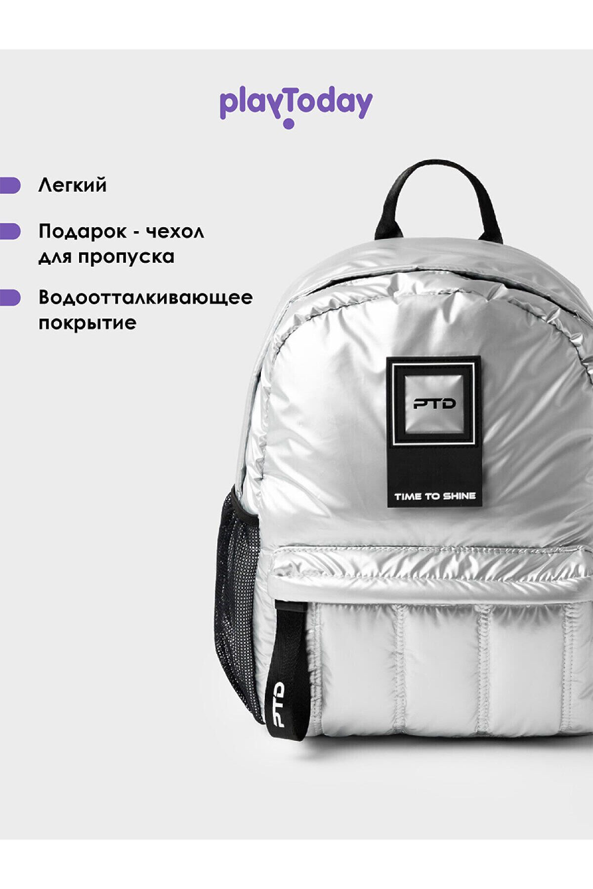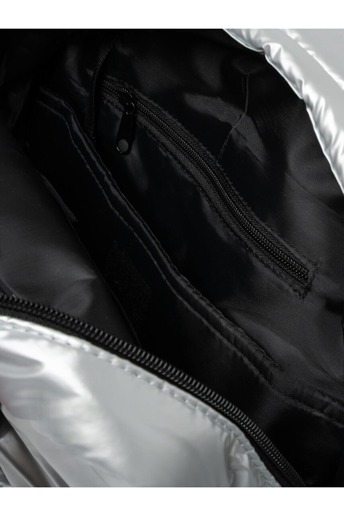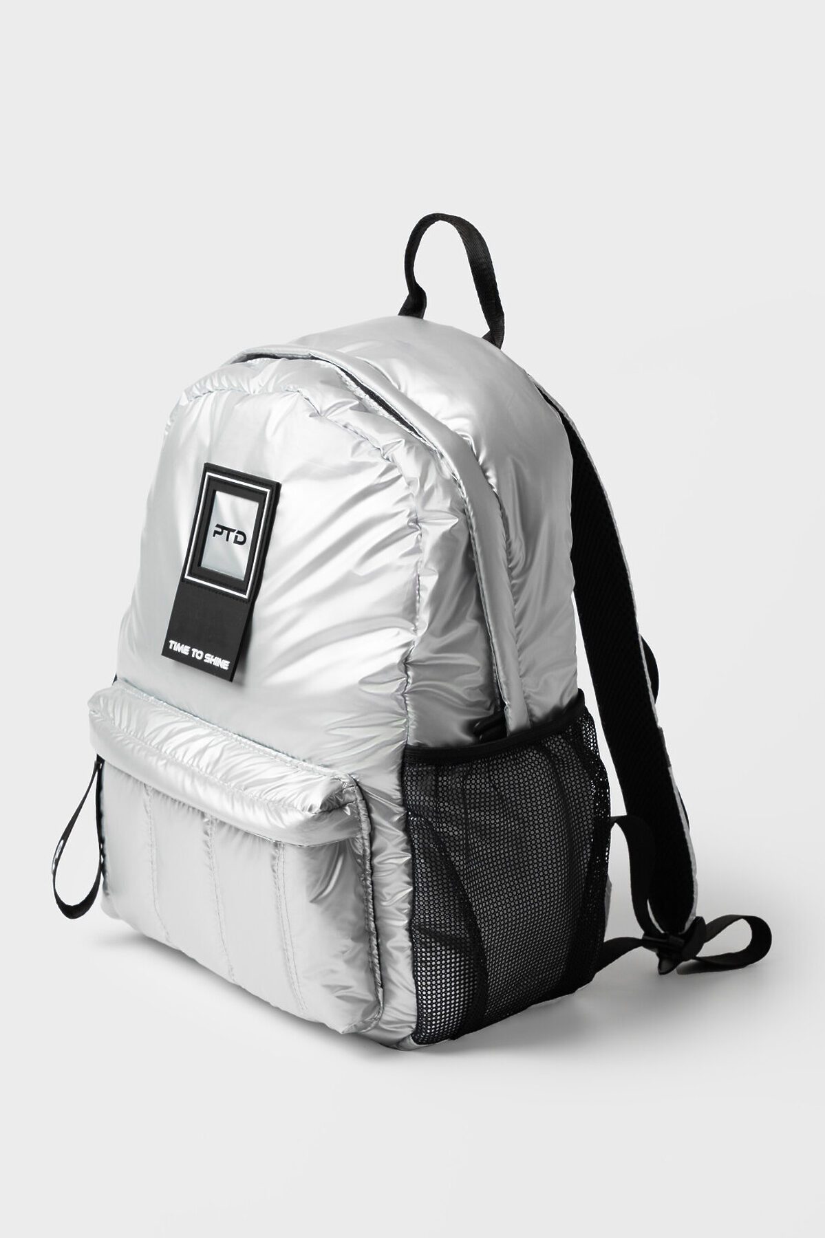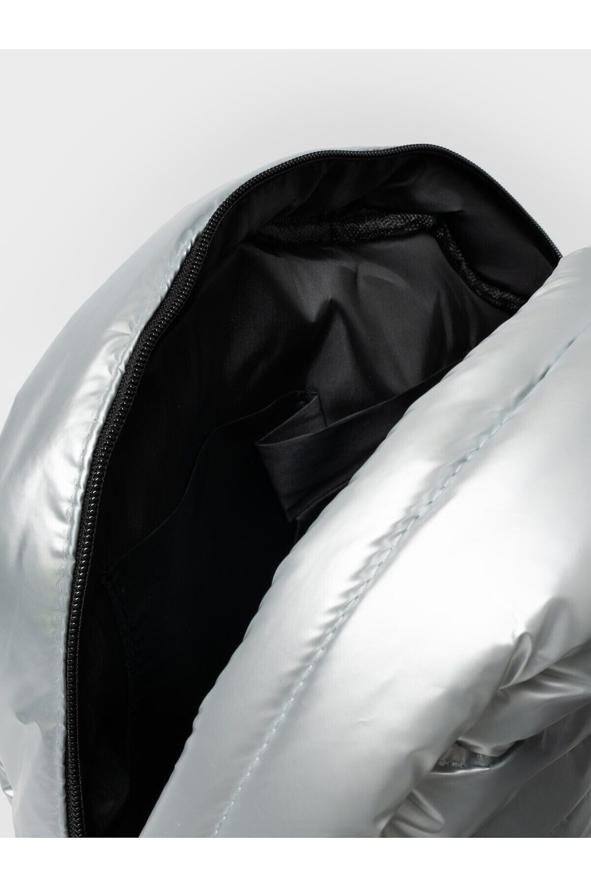 Модный рюкзак из серебристой дутой плащевой ткани для девочки подростка. Рюкзак для школы имеет одно отделение с различными карманами внутри для систематизации школьных принадлежностей. Снаружи есть большой карман на молнии, сбоку имеются карманы из сетки на резинке. Широкие мягкие вентилируемые лямки регулируются по высоте. У рюкзака есть ручка для ношения в руке и для того, чтобы его можно было вешать на вешалку. Ранец имеет светоотражающие детали на лямках. Рюкзак очень легкий и вместительный. К рюкзаку можно подобрать спортивную сумку в едином дизайне. Размер рюкзака: 30*40*15 см. Вес рюкзака: 470 гр