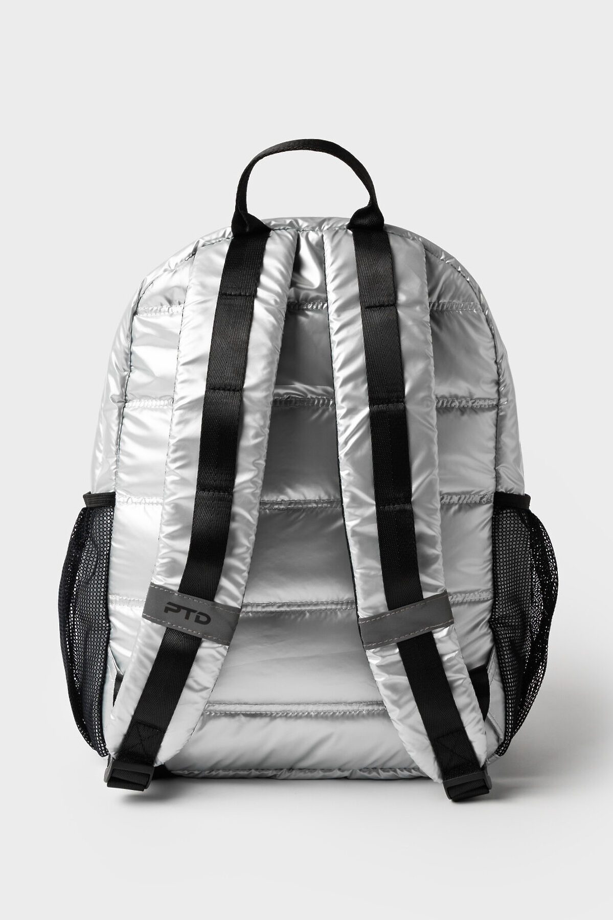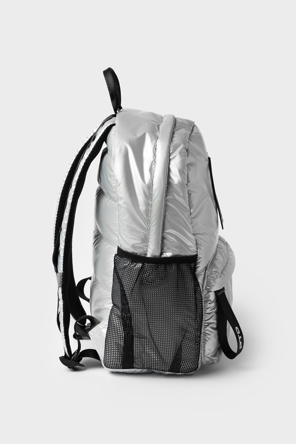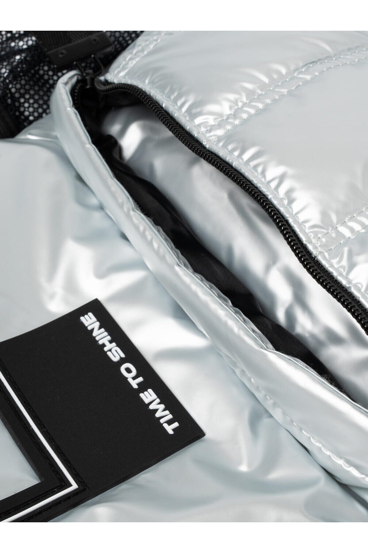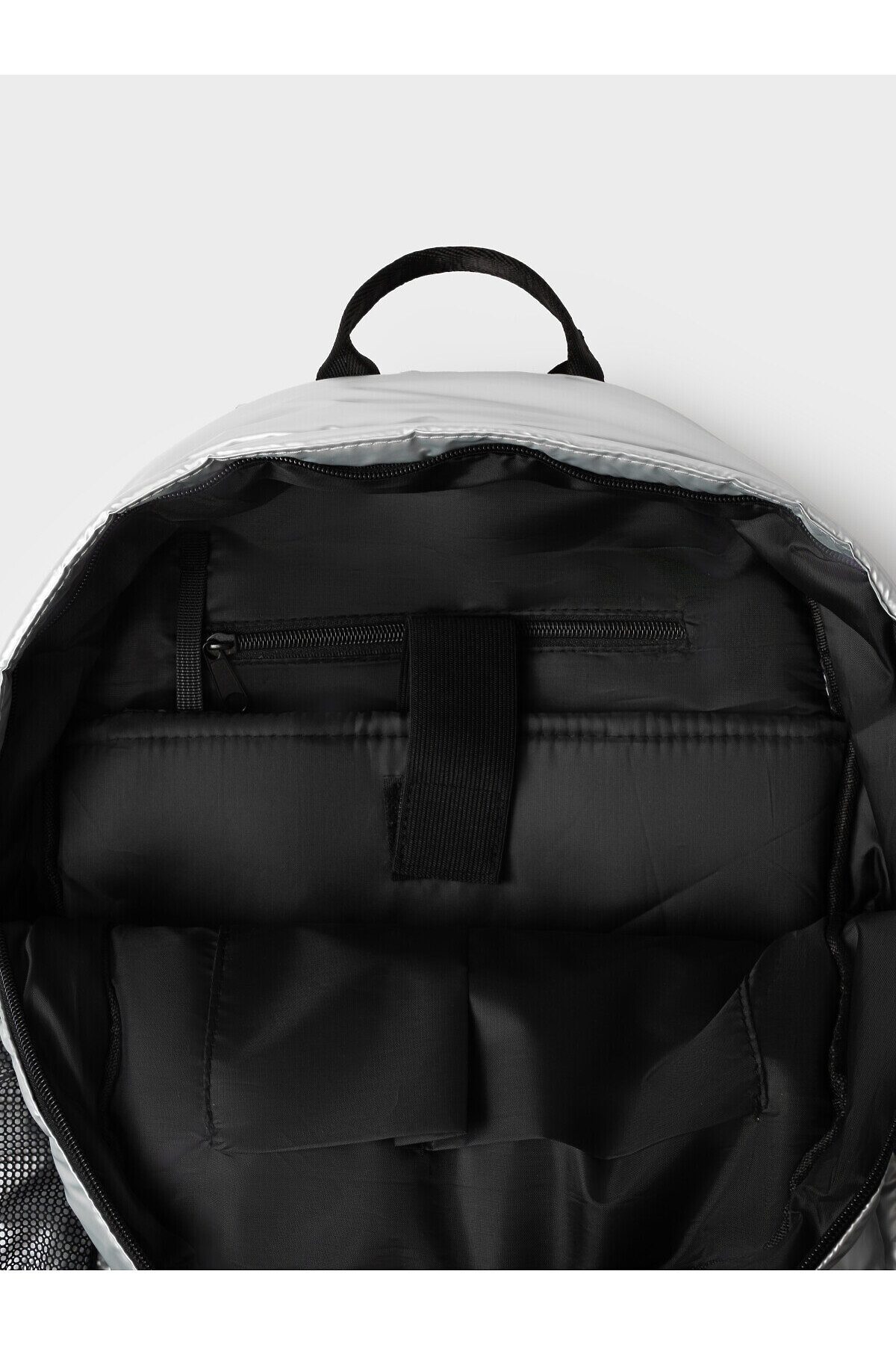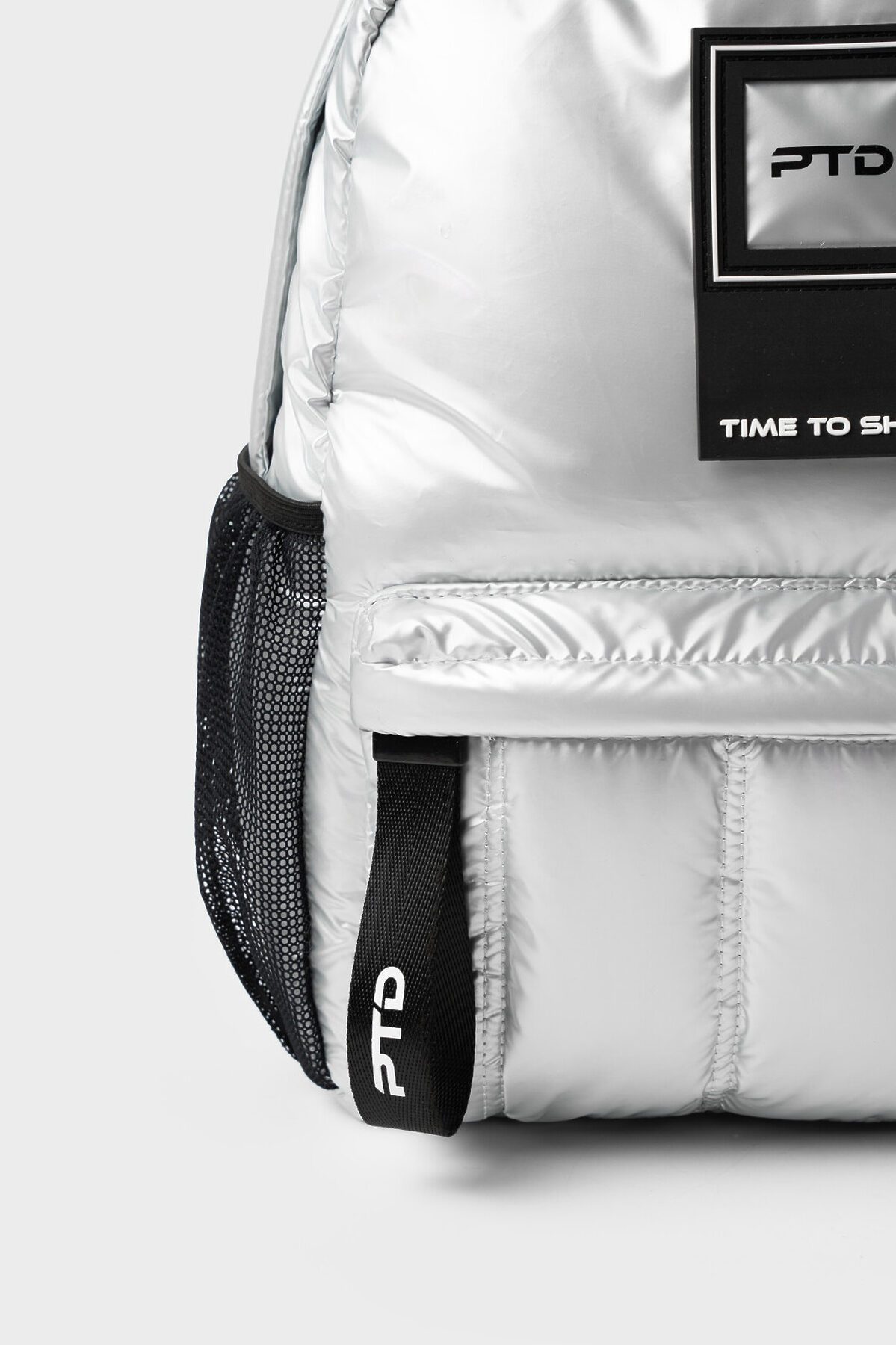 Модный рюкзак из серебристой дутой плащевой ткани для девочки подростка. Рюкзак для школы имеет одно отделение с различными карманами внутри для систематизации школьных принадлежностей. Снаружи есть большой карман на молнии, сбоку имеются карманы из сетки на резинке. Широкие мягкие вентилируемые лямки регулируются по высоте. У рюкзака есть ручка для ношения в руке и для того, чтобы его можно было вешать на вешалку. Ранец имеет светоотражающие детали на лямках. Рюкзак очень легкий и вместительный. К рюкзаку можно подобрать спортивную сумку в едином дизайне. Размер рюкзака: 30*40*15 см. Вес рюкзака: 470 гр