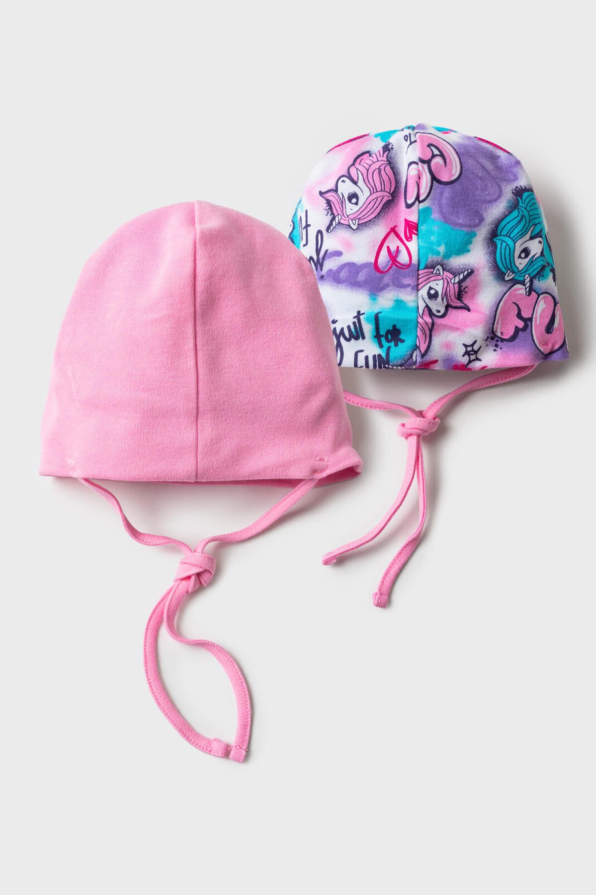Набор детских шапок для девочки. Шапка трикотажная, 2 шт. в комплекте. Модель из натурального хлопкового двойного трикотажа. Завязки.