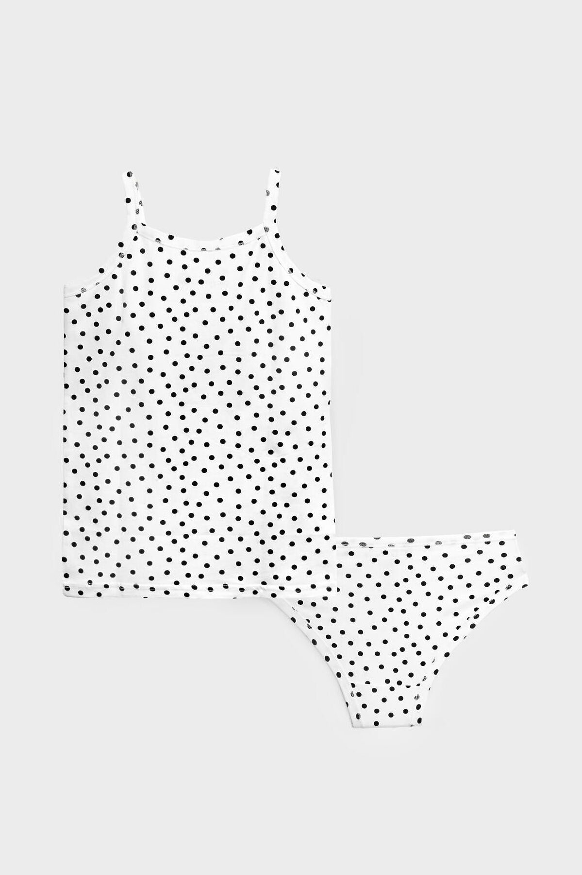 Комплект белья детский для девочки. Комплект белья: майка и трусы-слипы. Майка на тонких нерегулируемых бретелях. Высокое содержание хлопка. Благодаря наличию эластана в составе ткани изделие проще в уходе и держит форму.