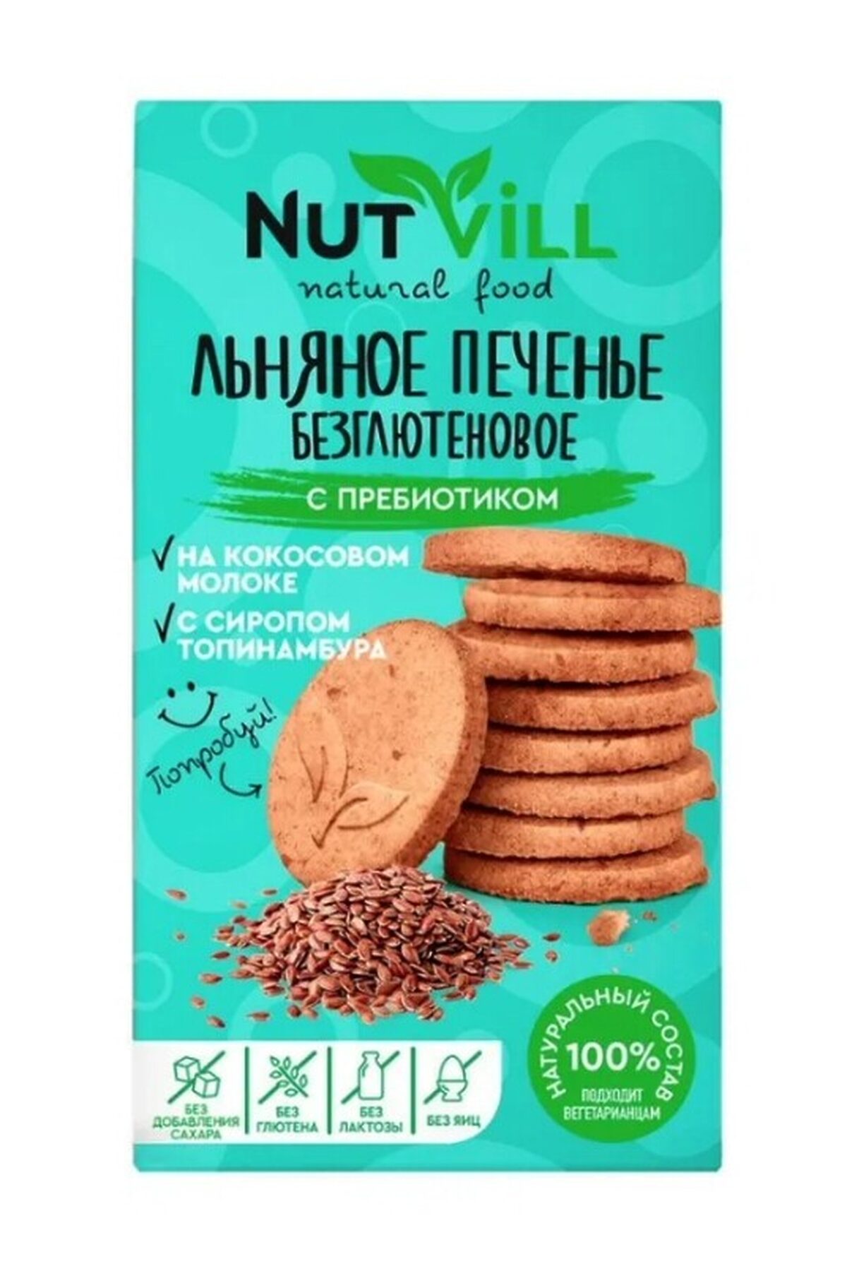 - Составмука льняная, мука рисовая, сироп топинамбура, масло кокосовое, семена льна, молоко кокосовое, пребиотик – инулин, разрыхлитель – гидрокарбонат натрия