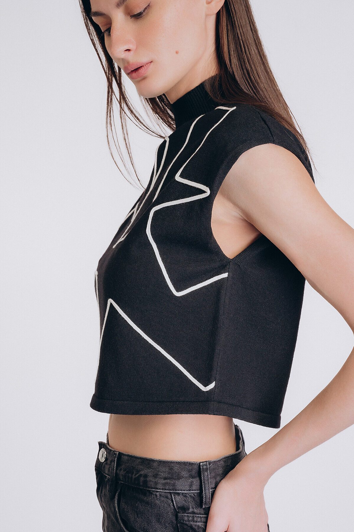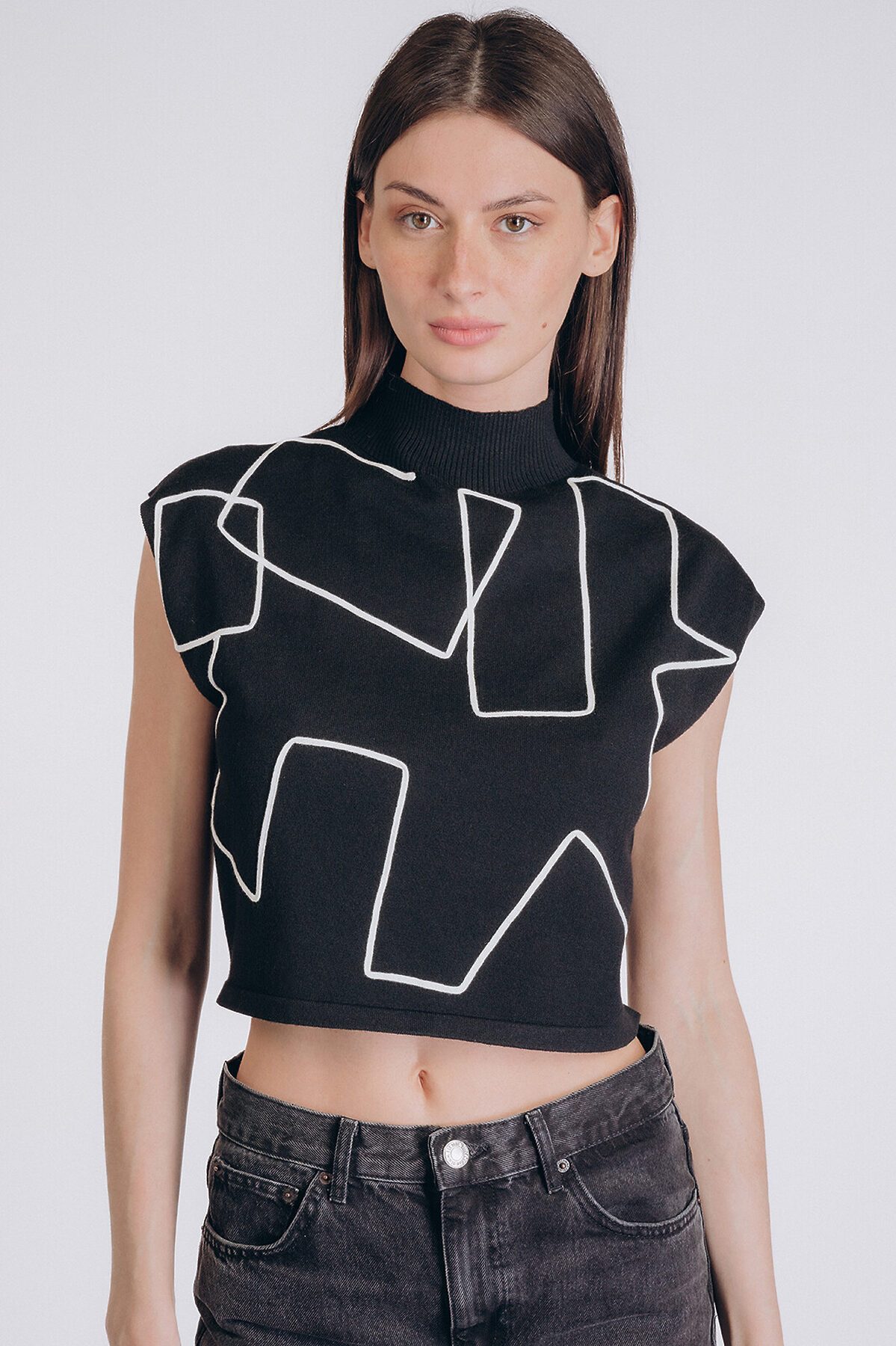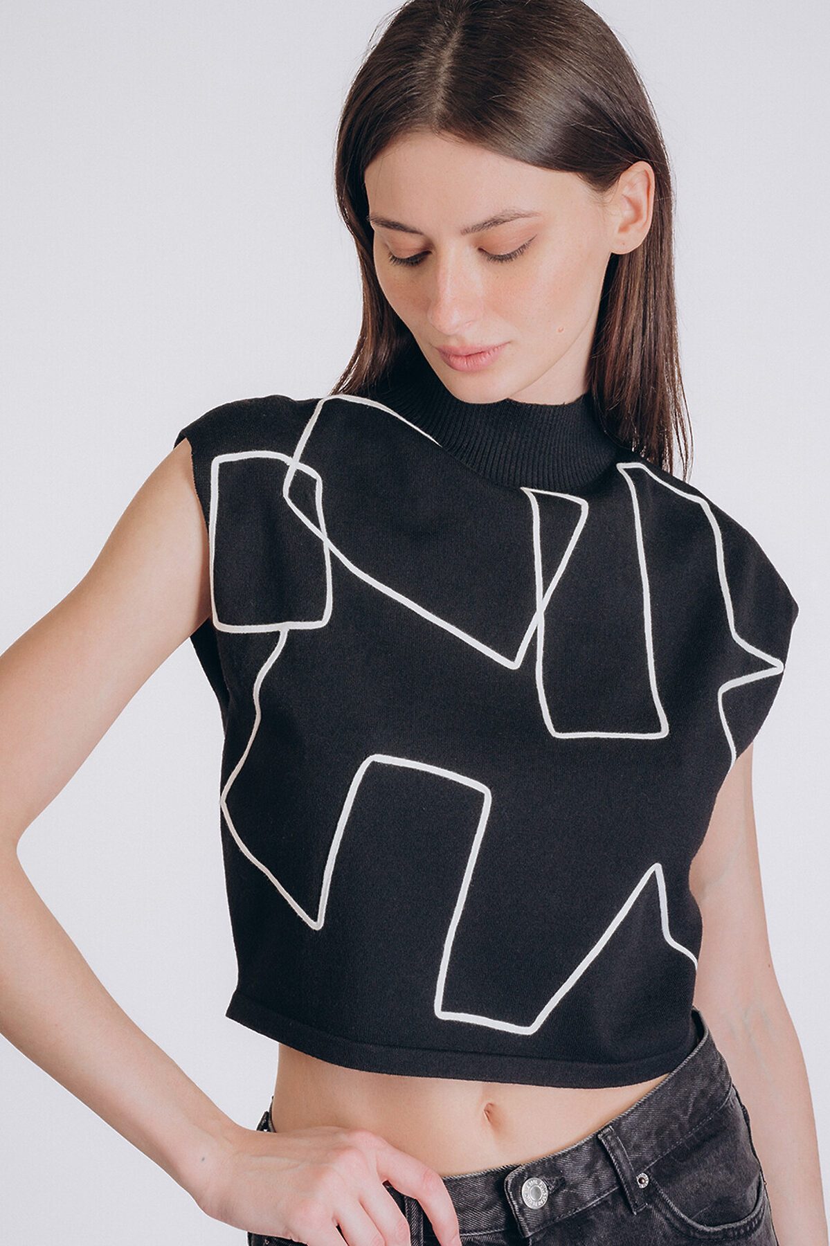Женский укороченный джемпер без рукавов бренда Indefini выполнен в классическом черном цвете с контрастным белым геометрическим узором. Модель изготовлена из мягкой и приятной к телу ткани, которая обеспечивает комфорт и свободу движений. Высокий ворот и свободный крой подчеркивают современный стиль, а лаконичный дизайн делает топ универсальным элементом гардероба. Глубокий черный оттенок и оригинальный принт придают образу выразительность и актуальность.