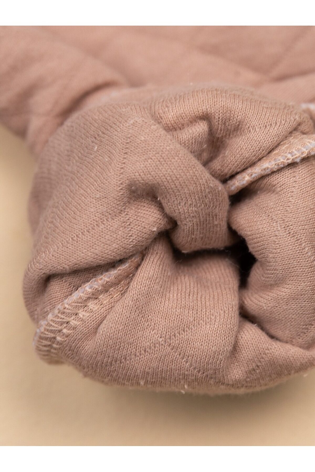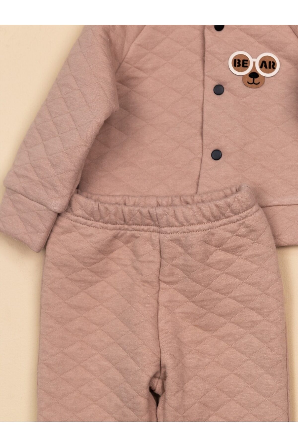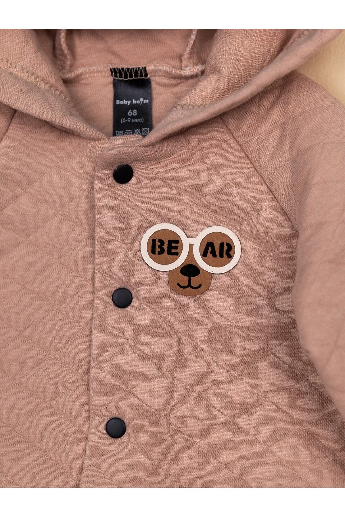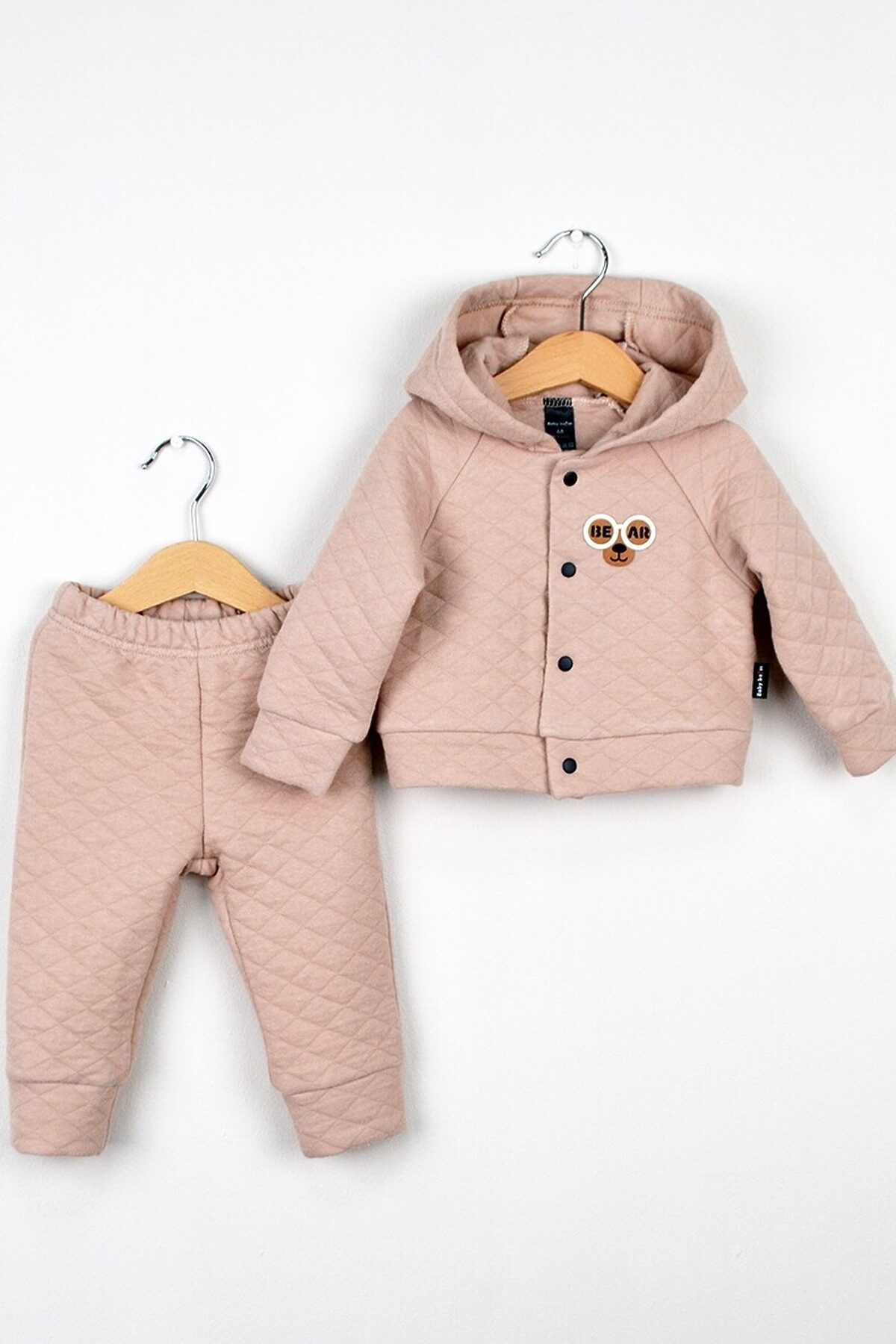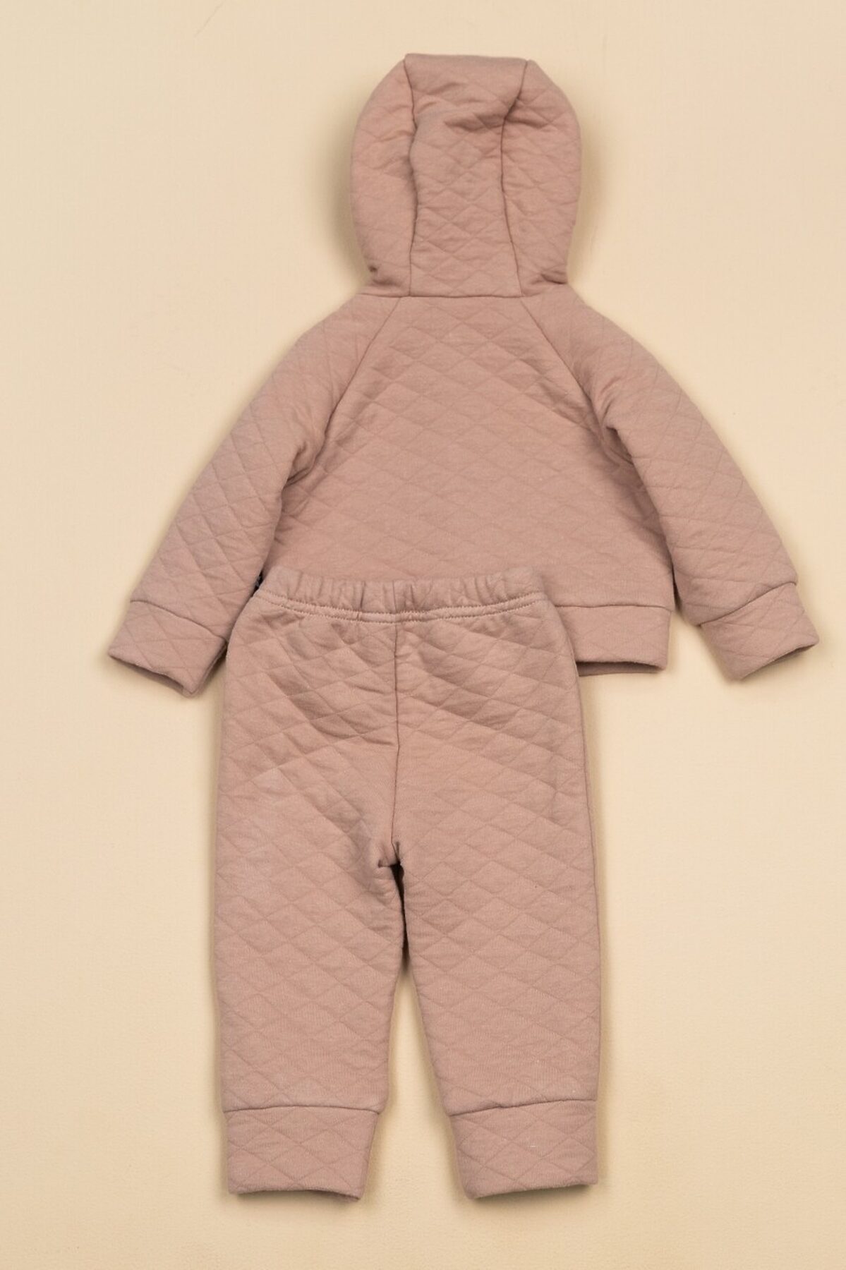 Теплый комплект из кофточки с капюшоном на кнопках и брючек. На левой детали переда кофточки аппликация. Выполнен из однотонного капитона (100% хлопок).
