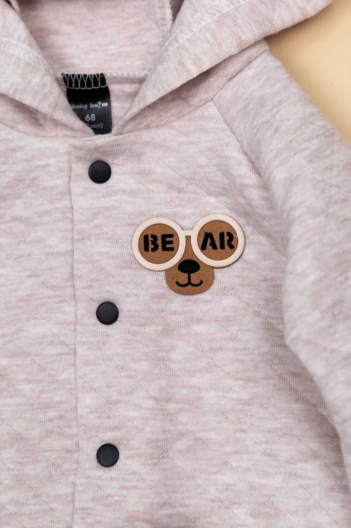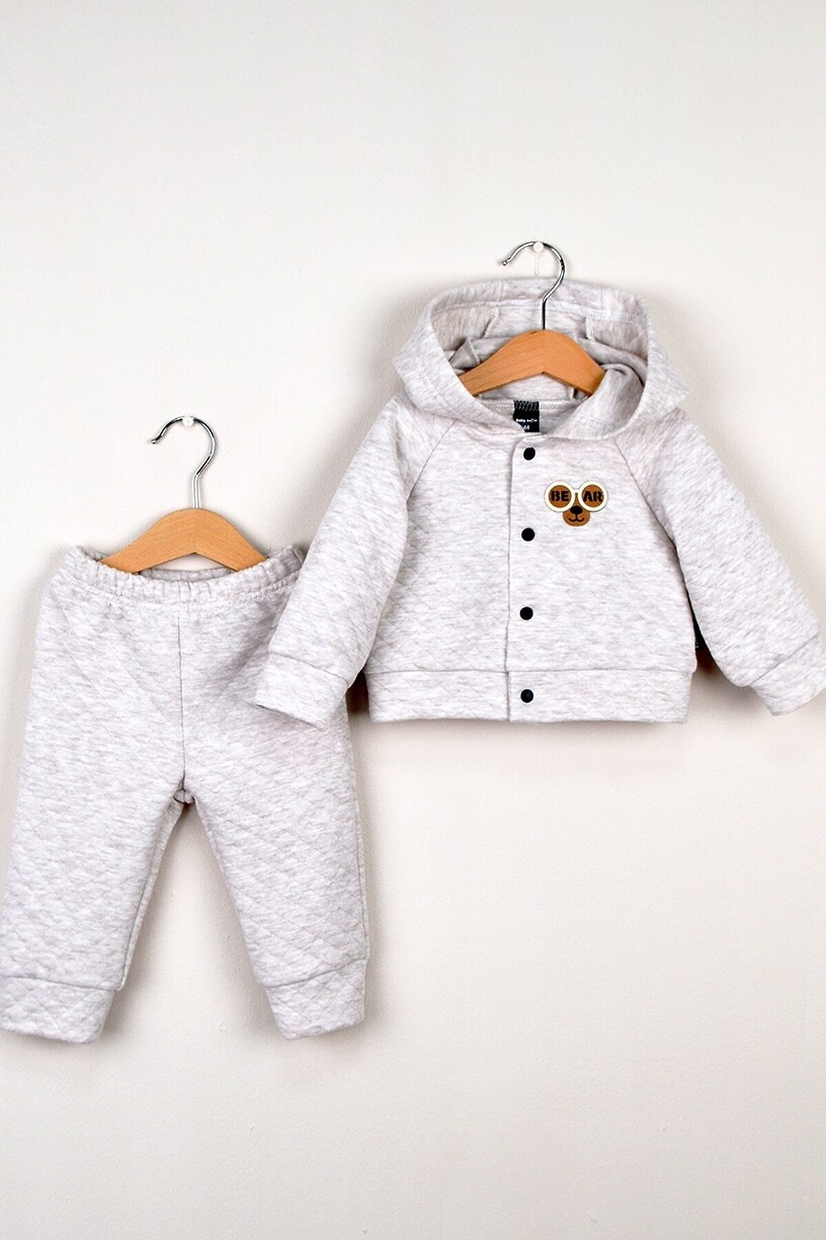Теплый комплект из кофточки с капюшоном на кнопках и брючек. На левой детали переда кофточки аппликация. Выполнен из однотонного капитона (100% хлопок).
