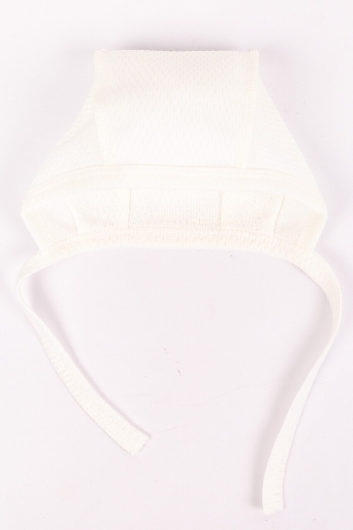 Чепчик из однотонного интерлока жакард (100% хлопок), выполнен швами наружу.