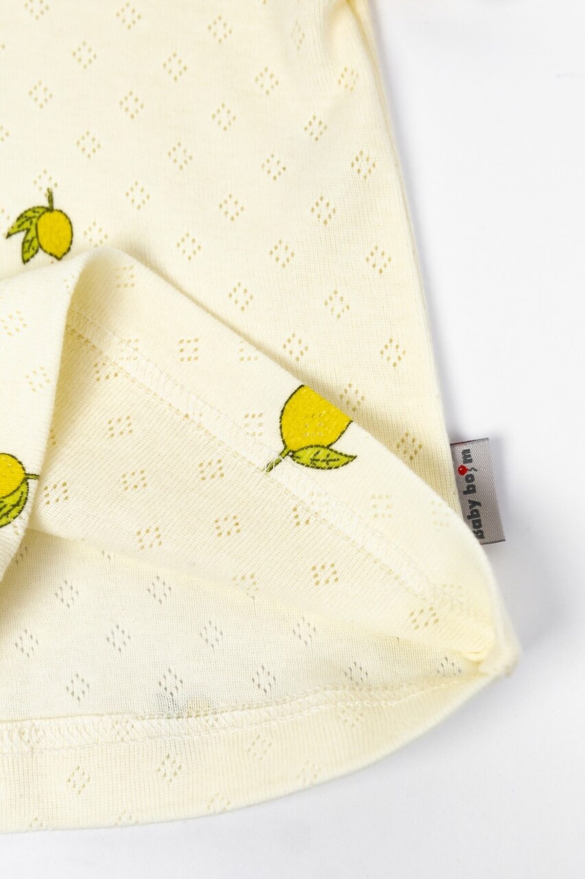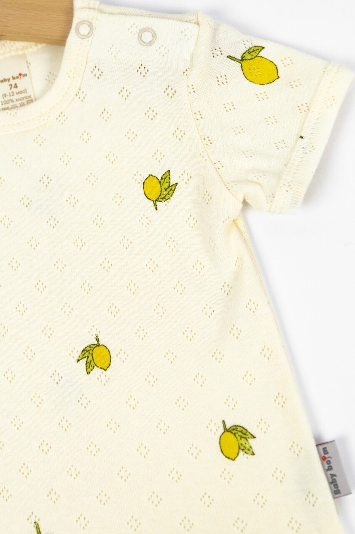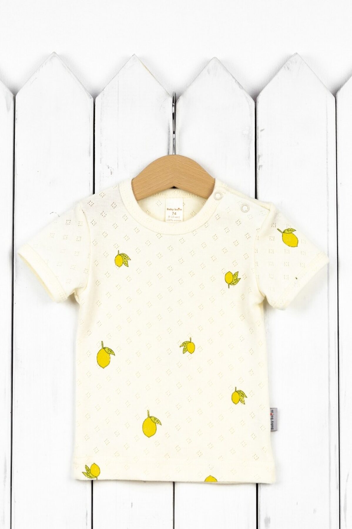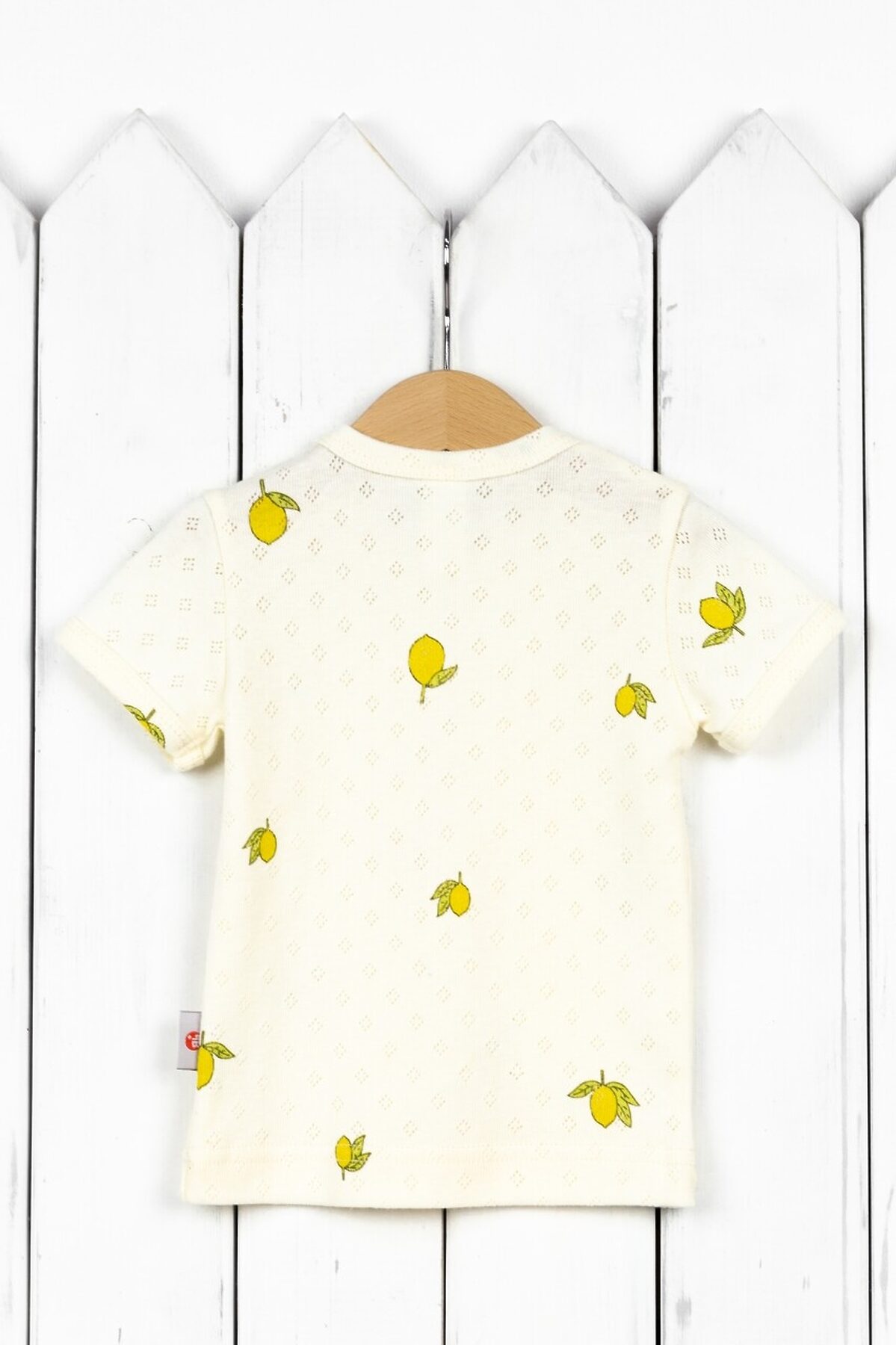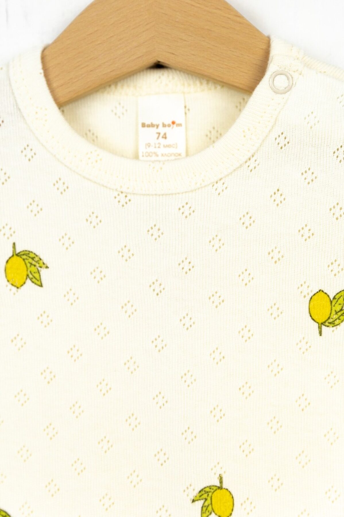 Футболка с коротким рукавчиком, выполнена из нежной ажурной рибаны с принтом (100% хлопок). Застежка на кнопках по плечу.