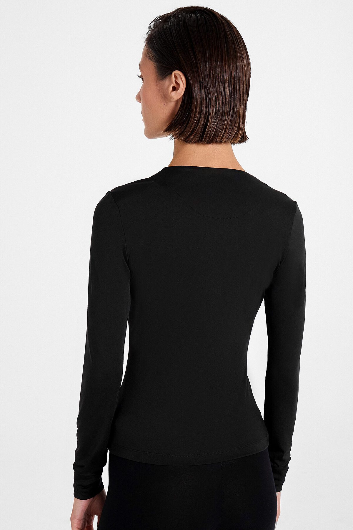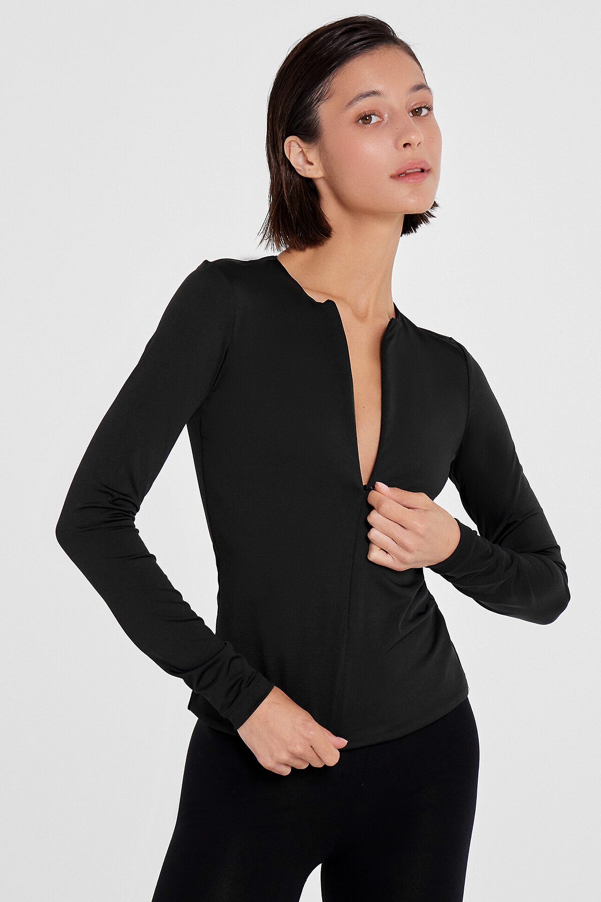 Джемпер изготовлен из трикотажного полотна кулирка. Джемпер облегающего силуэта длиной выше линии бедер. Горловина округлой формы. Горловина по спинке обработана обтачкой. Перед на подкладке из основного полотна. Рукава втачные длинные. Центральная застежка на потайную тесьму-молнию. Низ спинки джемпера и рукавов обработан швом вподгибку.