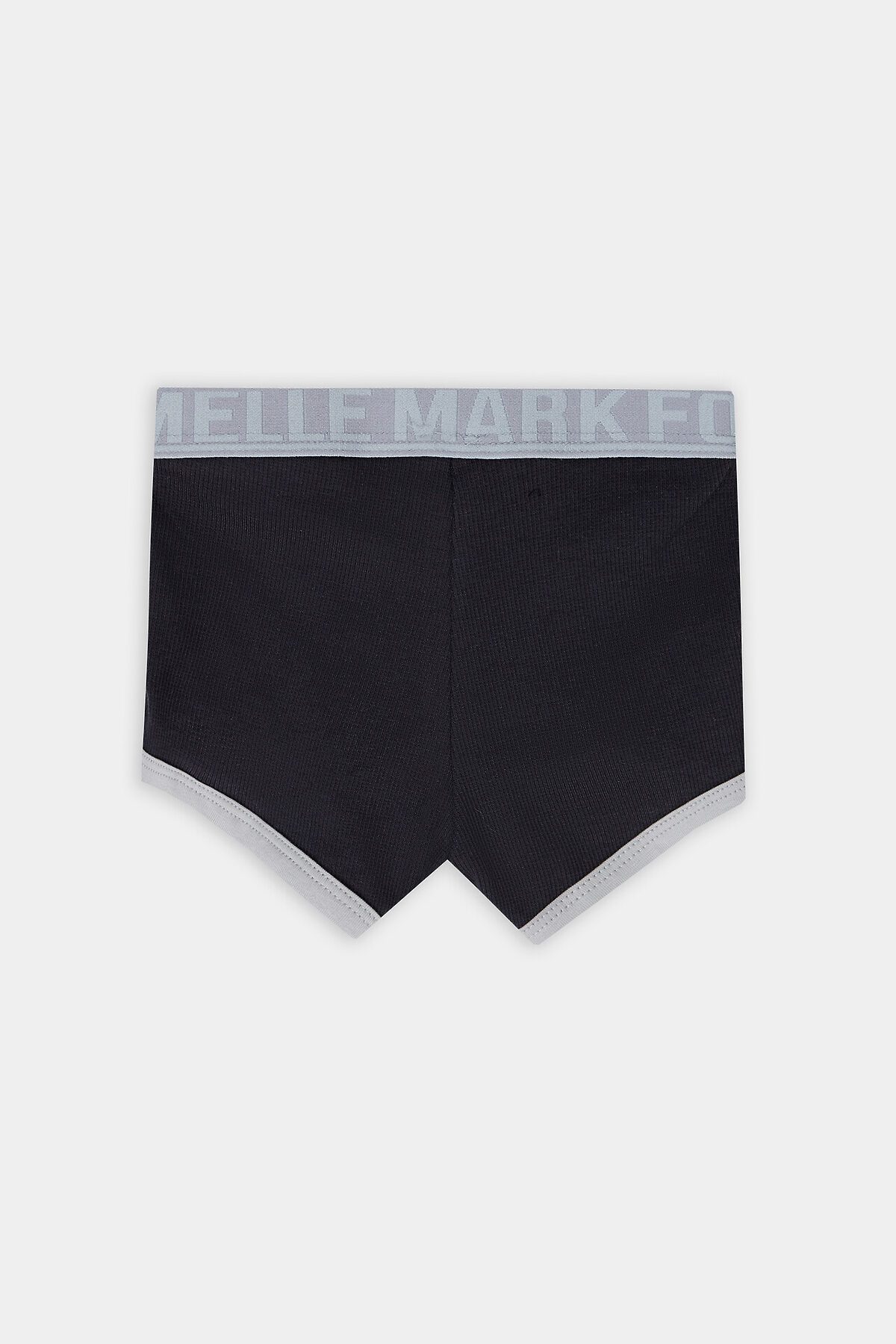 Деталь переда и сидения цельнокроенные. По верхнему срезу трусов настрочена эластичная тесьма (жаккард) шириной 25 мм. Шаговый шов выполнены строчкой "флэт-лок". Гульфик и нижние срезы трусов окантованы бейкой из кулирного полотна SJ-009.01.170 (95% хлопок; 5% эластан, 170 гр/м?, 180 см).
