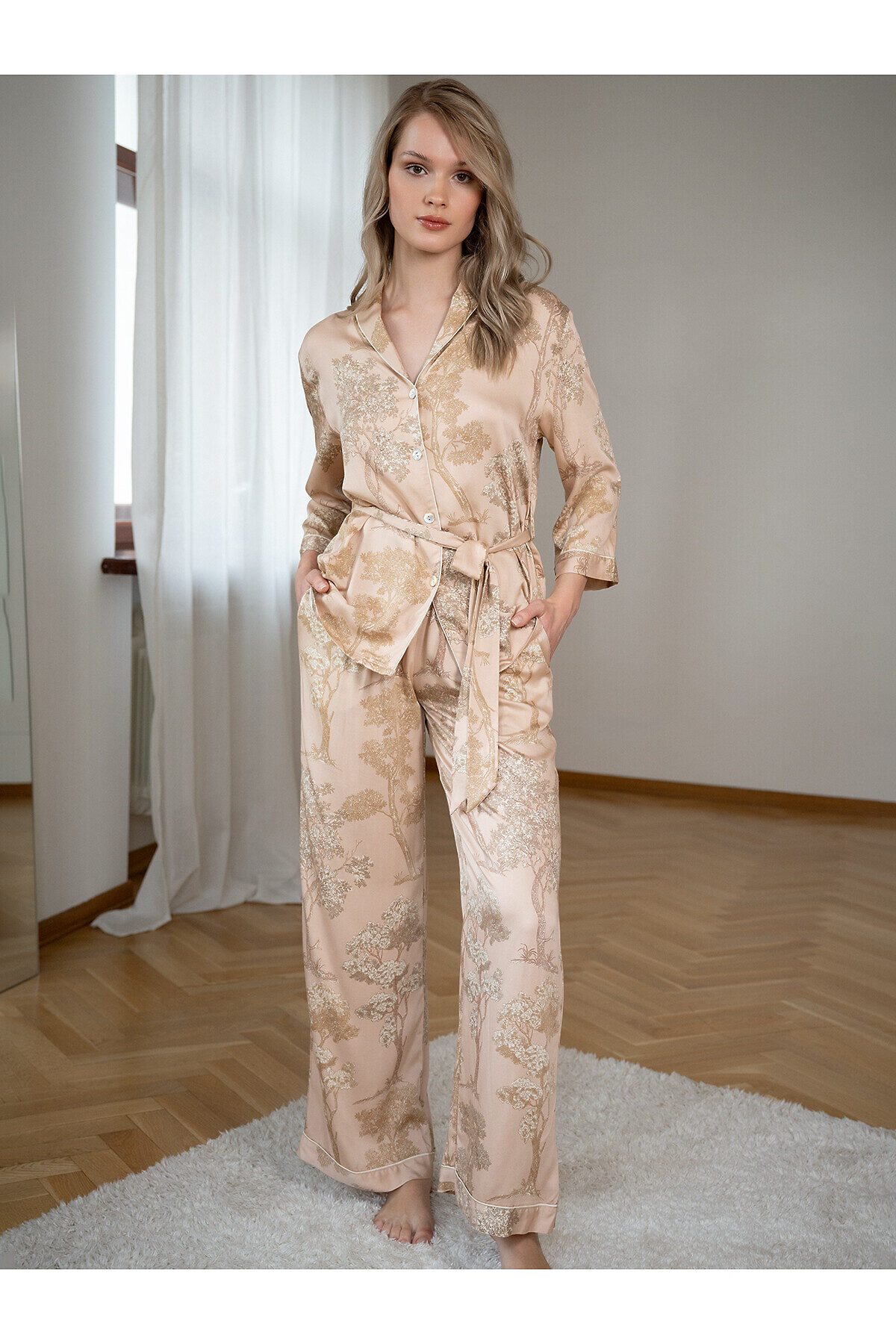 Женская пижама Indefini выполнена в нежном розовом цвете с изысканным растительным принтом. Комплект состоит из рубашки на пуговицах с отложным воротником, рукавами и поясом на талии, а также прямых брюк на мягкой эластичной резинке. Лёгкая и приятная к телу вискозная ткань обеспечивает отличную воздухопроницаемость, комфорт и свободу движений в течение всего дня и ночи. Декоративные пуговицы и пояс добавляют образу стильный акцент, а классический крой делает эту пижаму идеальным выбором для домашнего отдыха и сна. Идеальный вариант для тех, кто ценит уют, практичность и современный стиль.