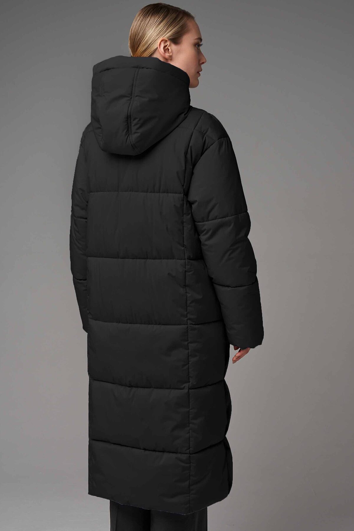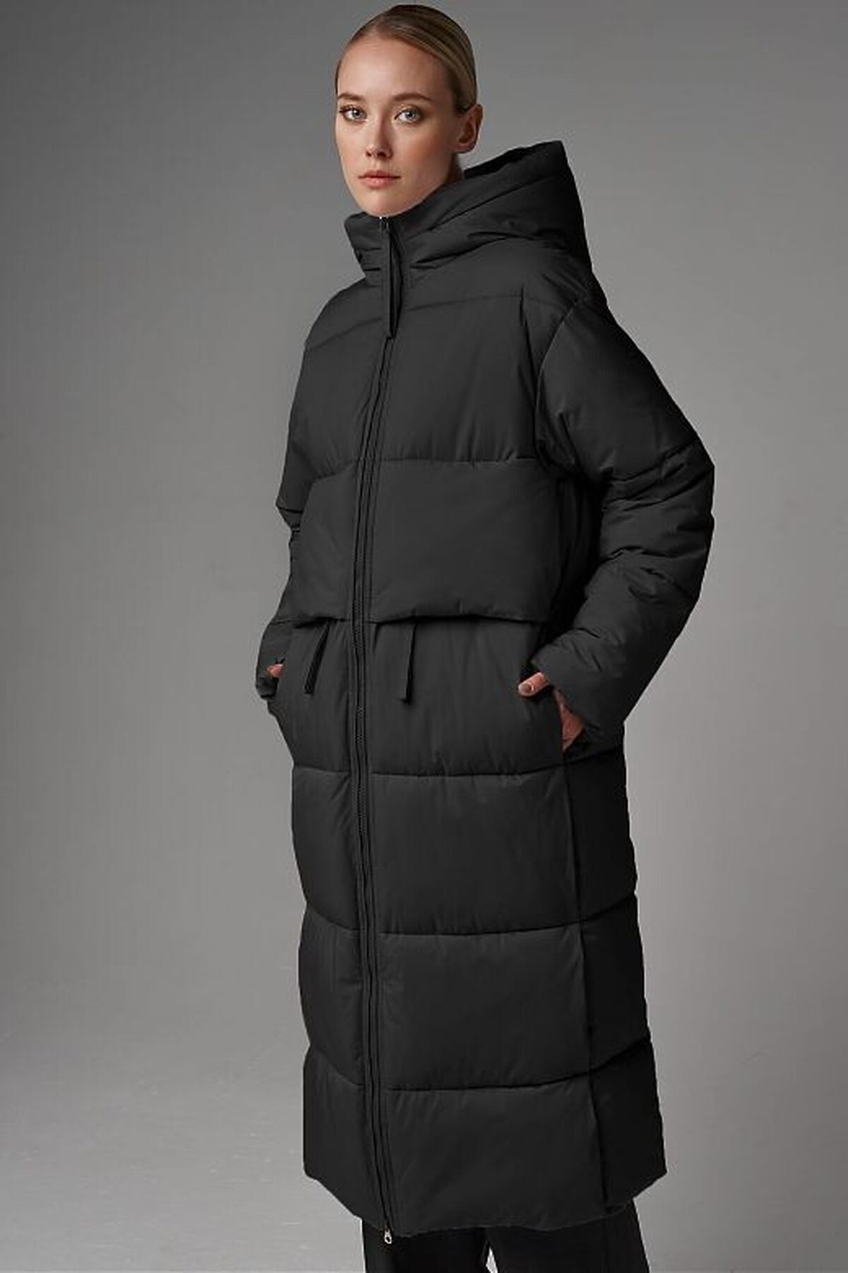 Многослойный пуховик прямого силуэта с втачным капюшоном и застежкой на молнию. В изделии 4 кармана. Два из них горизонтальных под кокеткой на молнии и два по бокам в складках на кнопках. Также есть еще внутренний карман. Ткань - плащевая, матовая с водоотталкивающей пропиткой. Утепление Био-пух 250 гр. Рекомендуемый температурный режим (от -5°C до -20°C). Длина изделия - 120 см. Длина рукава - 65 см.