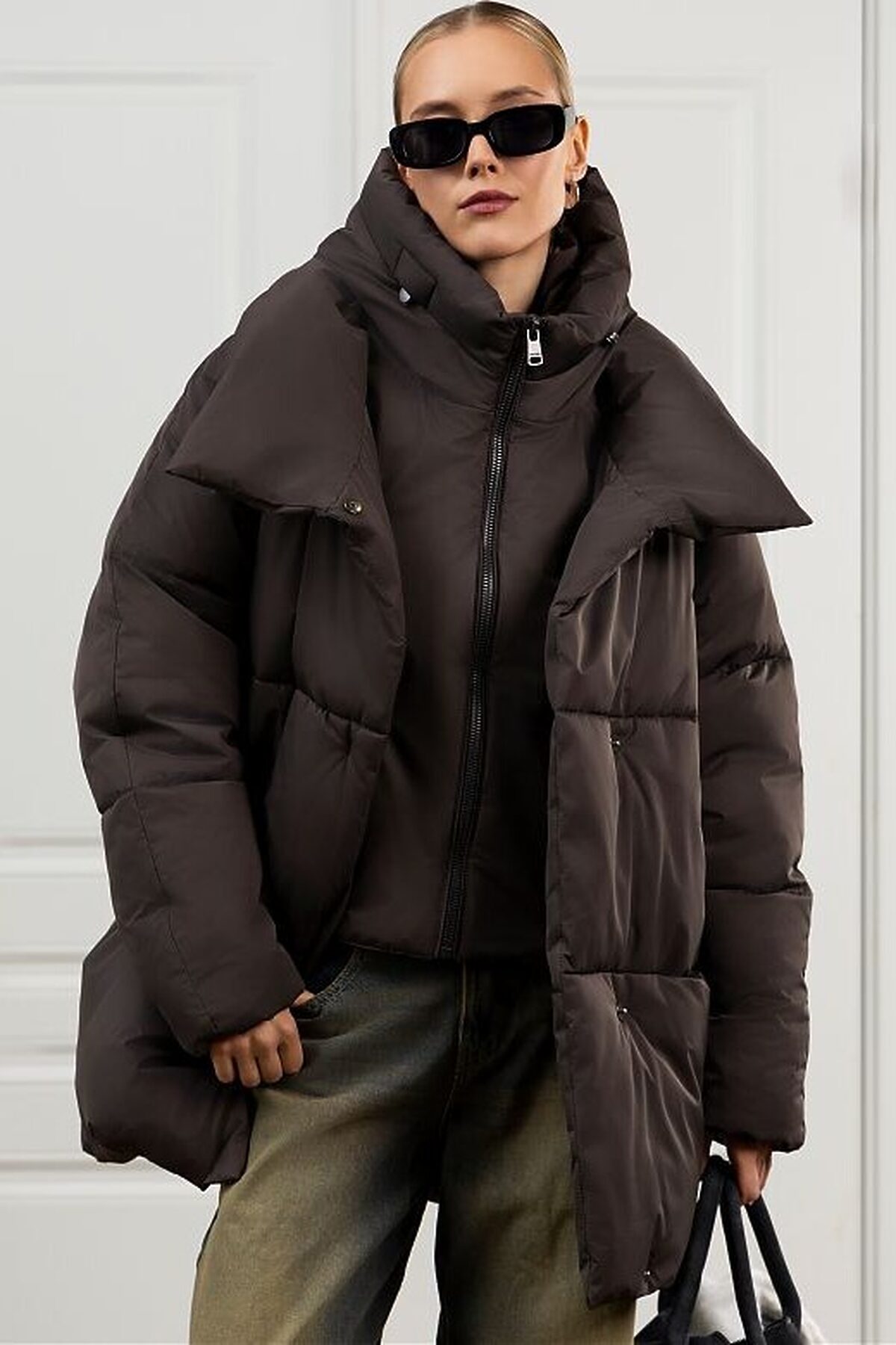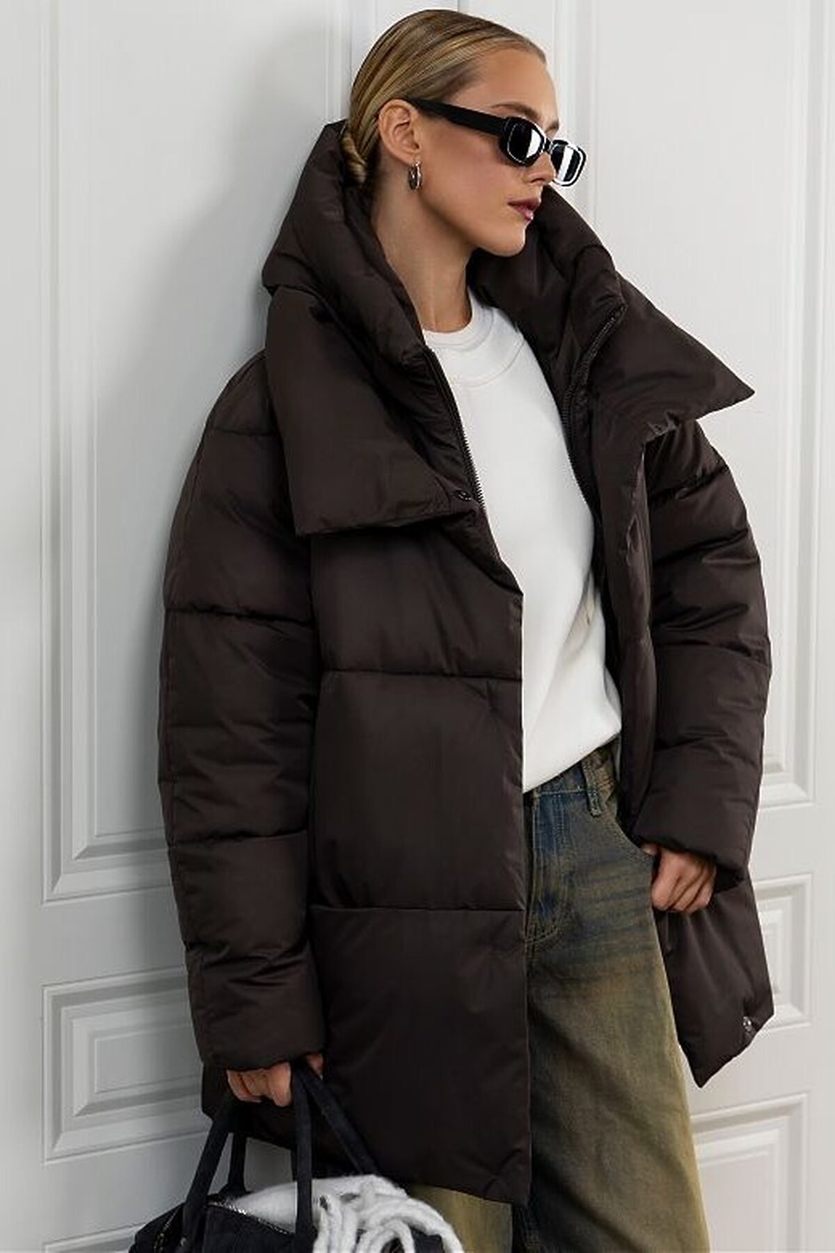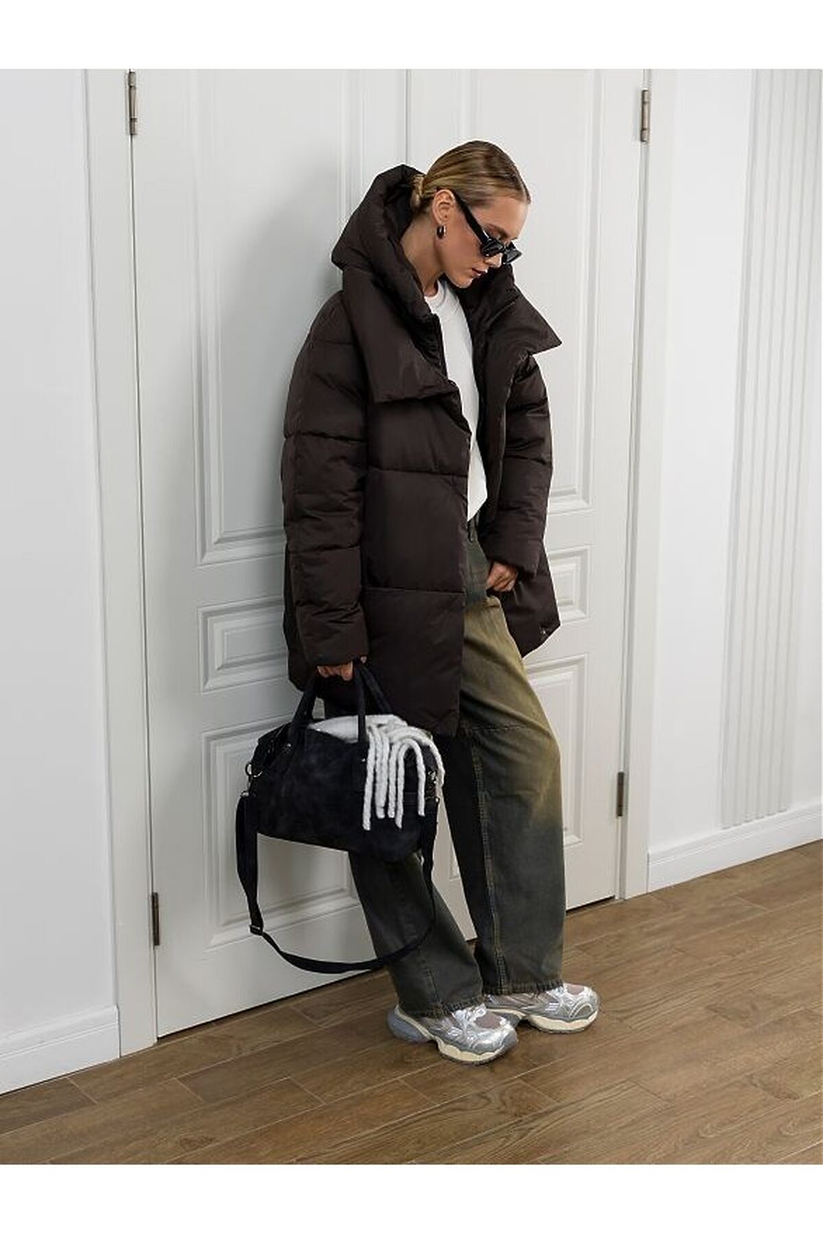 Пуховик Oversize со съемной манишкой на кнопках. Капюшон на утяжке , изделие средней длины с увеличенной стойкой.